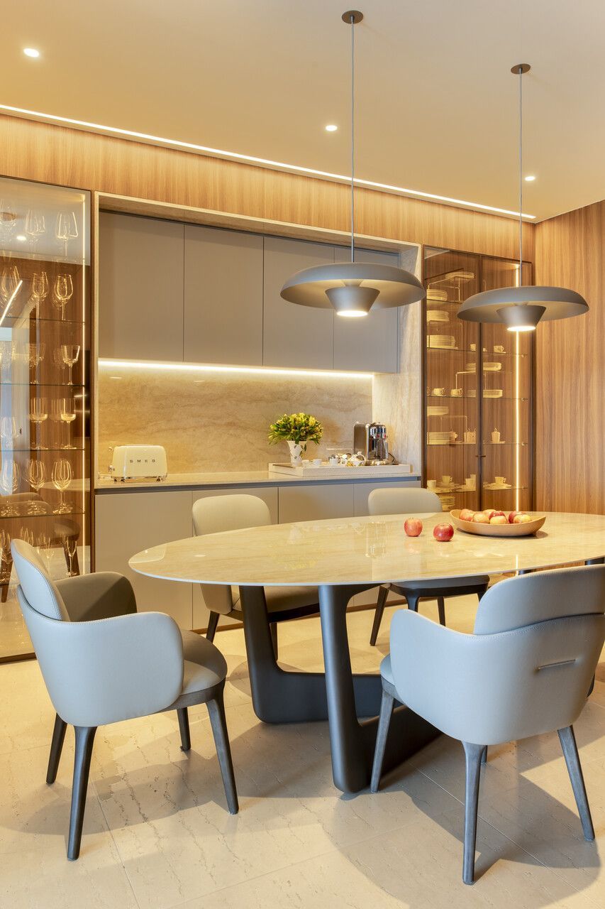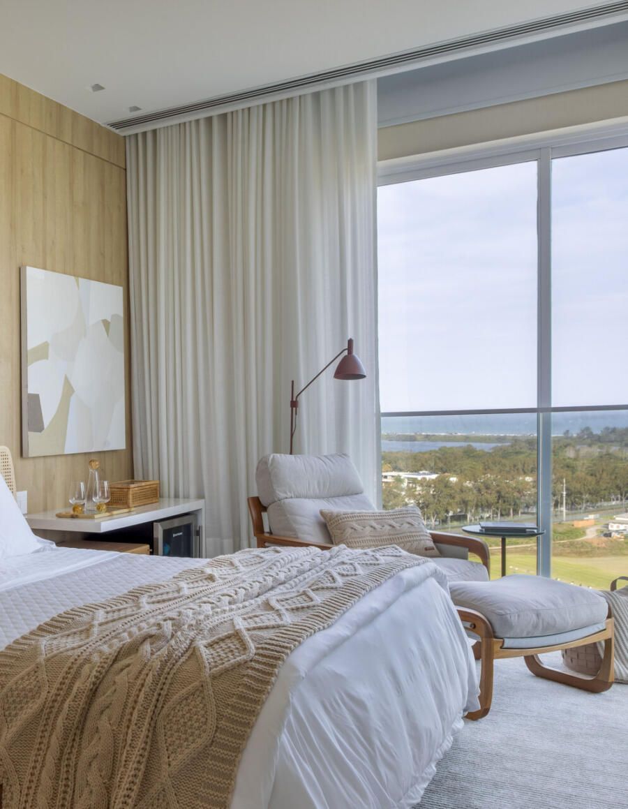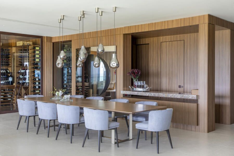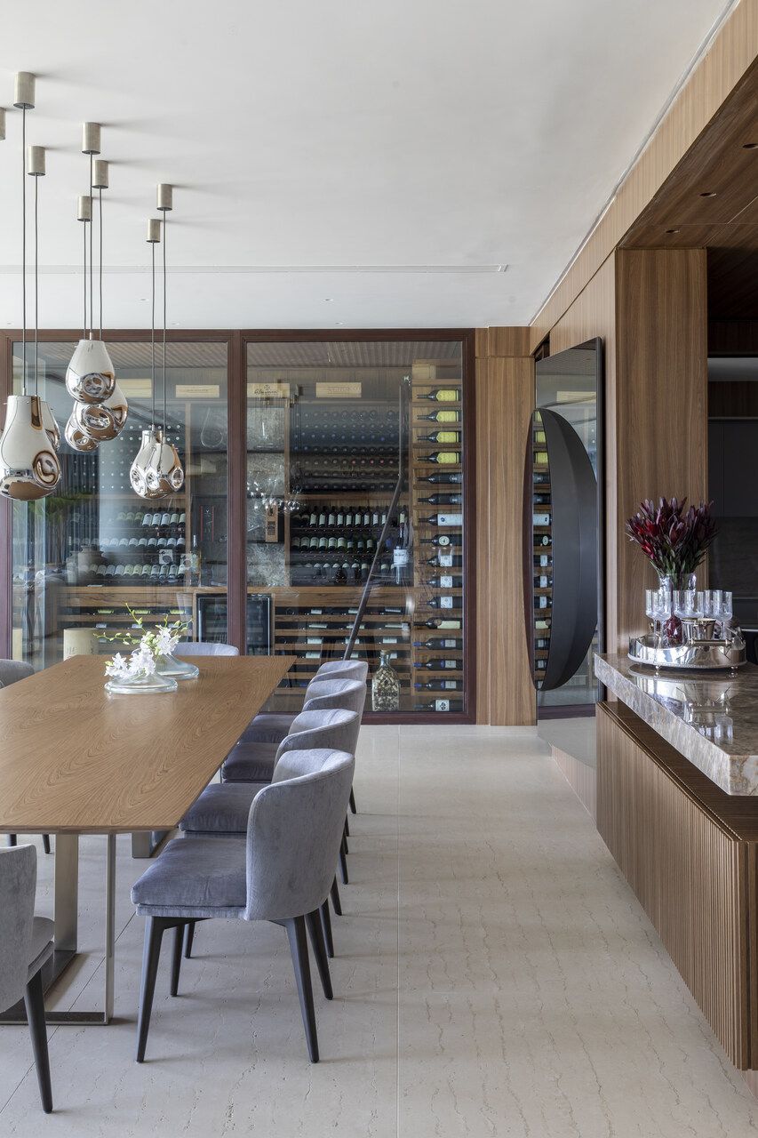 A área social foi cuidadosamente setorizada em estar, jantar e TV, além de lounge, espaço gourmet e uma imponente adega climatizada walk-in, revestida internamente em freijó e quartzito Sensa Macalan. Esse ambiente se tornou um dos pontos altos do projeto, funcionando como elo entre arquitetura, design e convivência, sempre com a vista como pano de fundo.