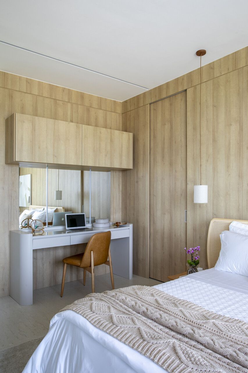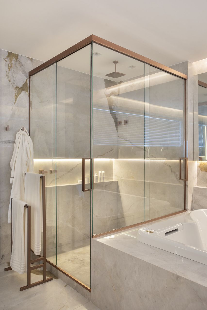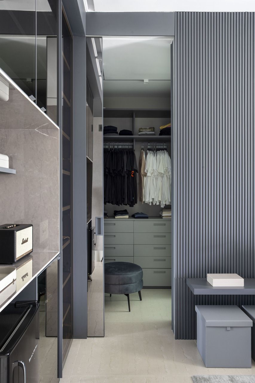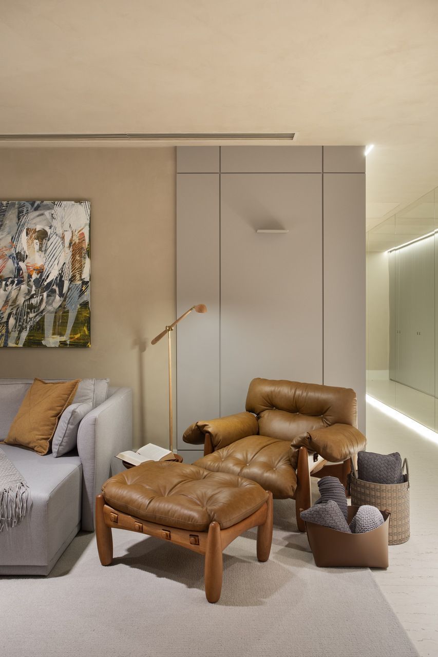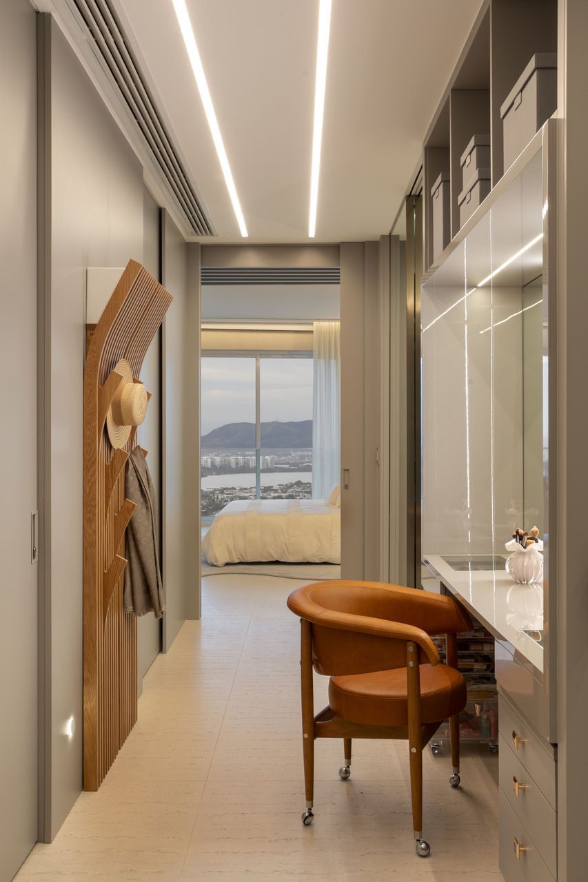 As marcenarias da área social, desenhadas por Cristina Côrtes, foram executadas pela Florense em MDF laminado melamínico amadeirado Tortona, em tonalidade caramelo escurecido, combinado à laca cinza claro. Os acabamentos alternam entre microtextura e higloss, criando sutis variações visuais, enquanto o interior da adega recebeu folha natural de freijó, reforçando o caráter acolhedor do espaço. Na área íntima, o hall da suíte do casal ganhou uma penteadeira acompanhada da cadeira Beg, de Sérgio Rodrigues, e do mancebo Brise, da Lattoog, quebrando a linearidade do longo corredor que conduz aos dormitórios e banheiros. O banheiro master, por sua vez, se destaca pelo revestimento integral em mármore dolomítico Monte Cristo.