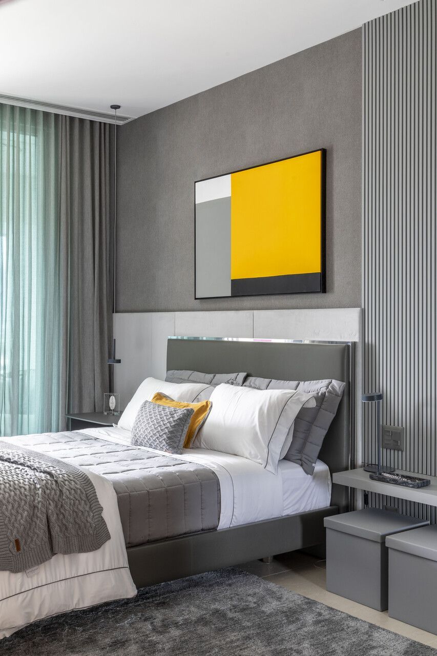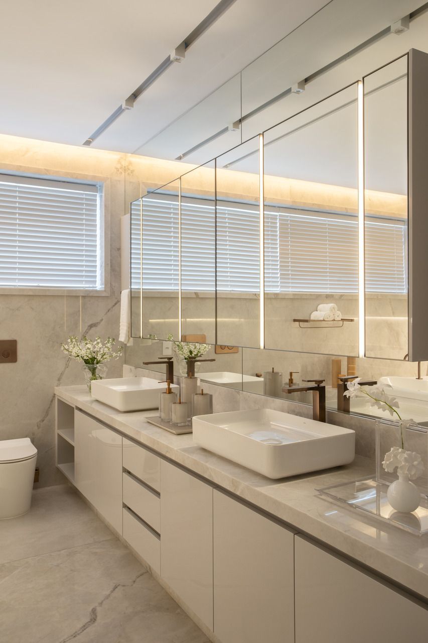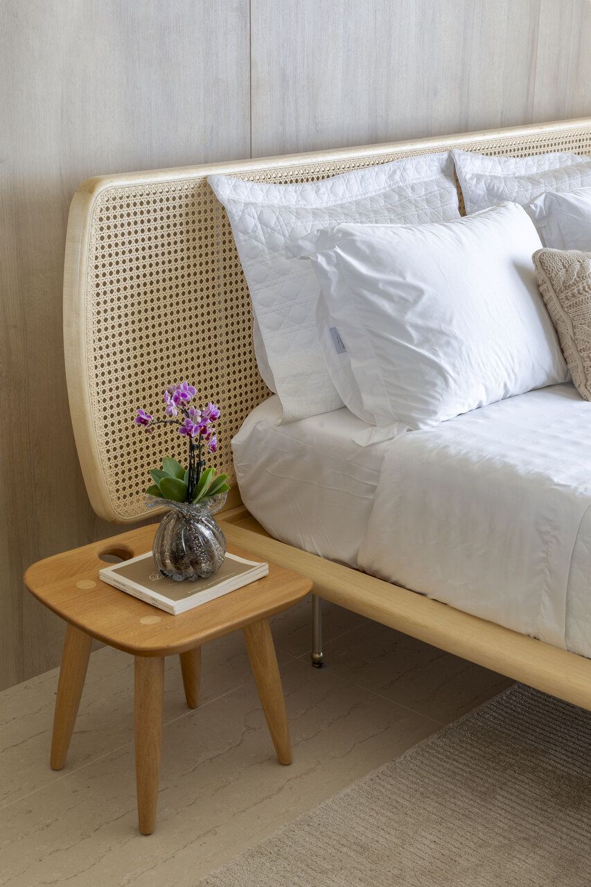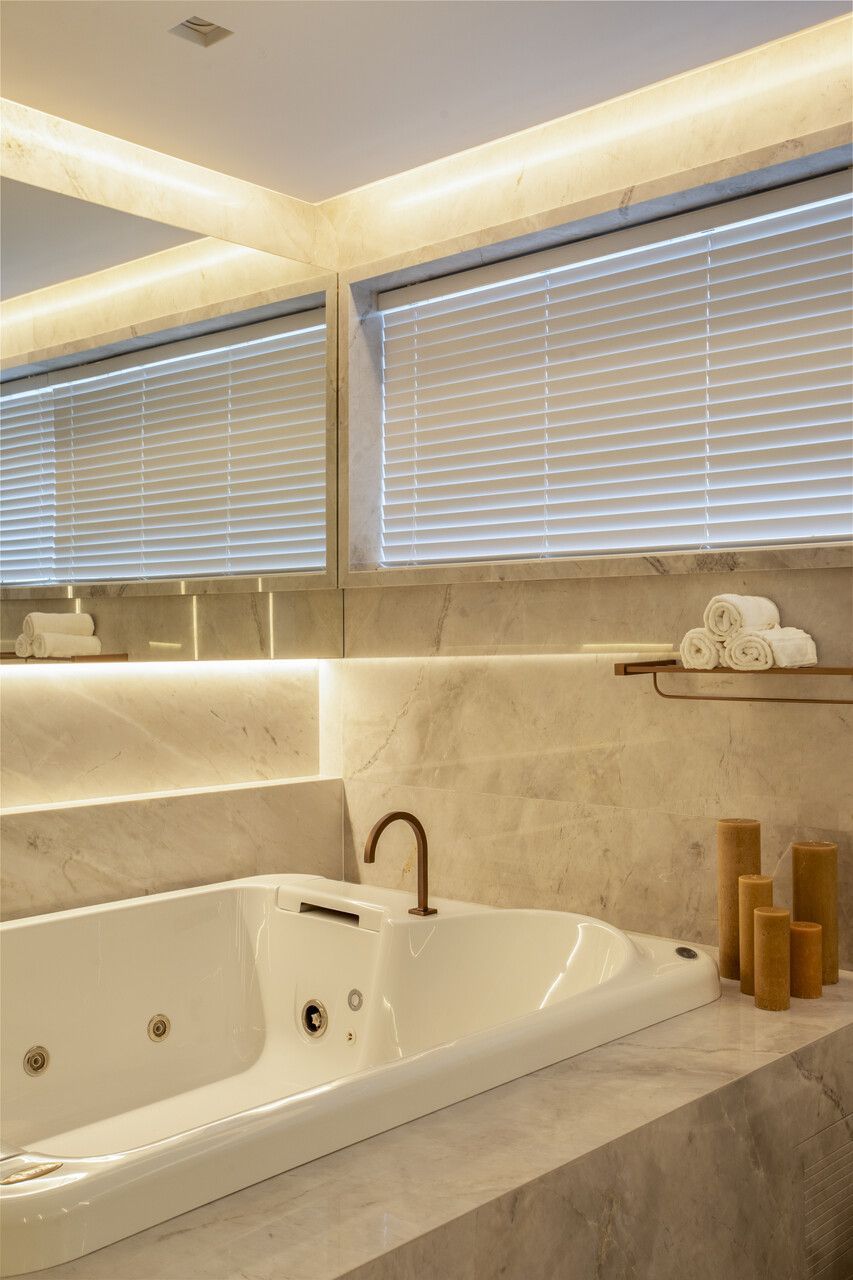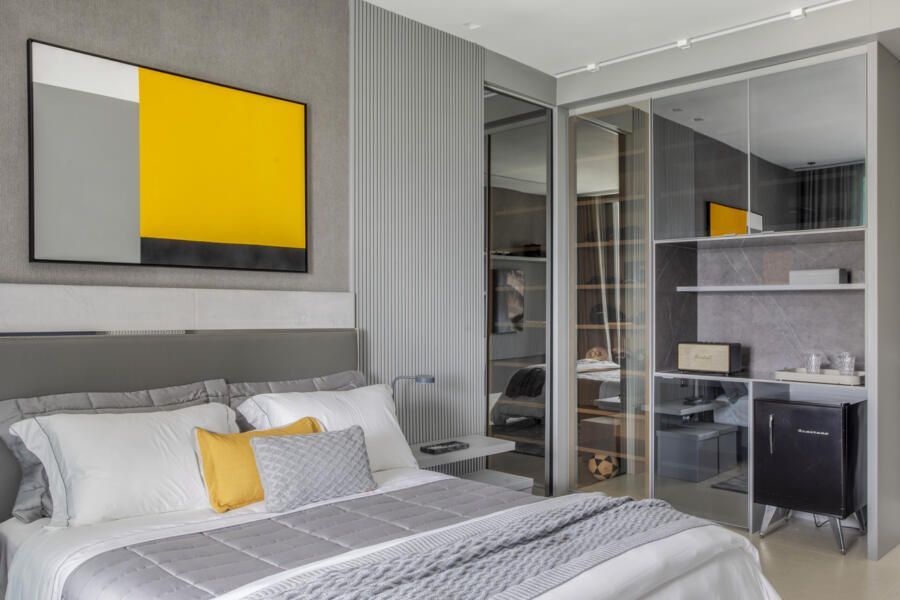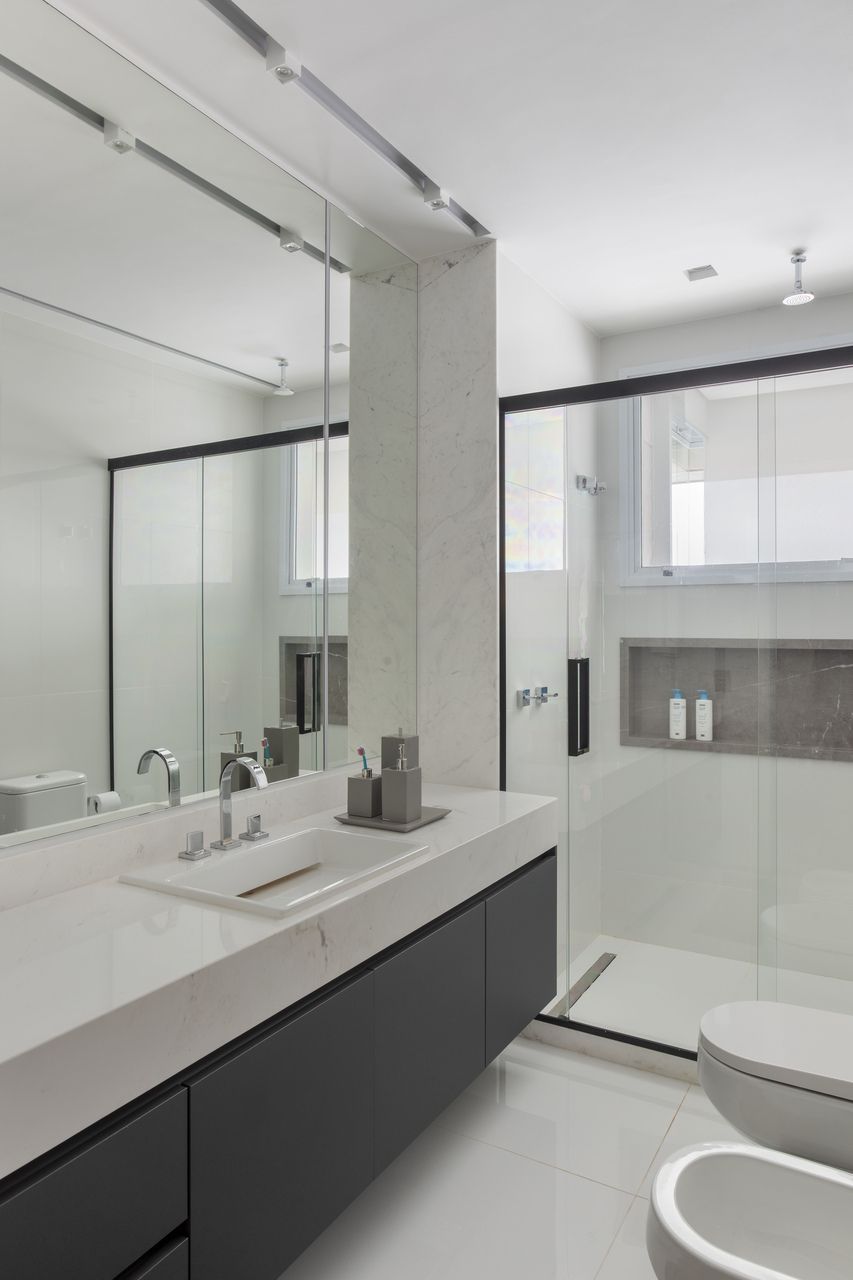 As marcenarias da área social, desenhadas por Cristina Côrtes, foram executadas pela Florense em MDF laminado melamínico amadeirado Tortona, em tonalidade caramelo escurecido, combinado à laca cinza claro. Os acabamentos alternam entre microtextura e higloss, criando sutis variações visuais, enquanto o interior da adega recebeu folha natural de freijó, reforçando o caráter acolhedor do espaço. Na área íntima, o hall da suíte do casal ganhou uma penteadeira acompanhada da cadeira Beg, de Sérgio Rodrigues, e do mancebo Brise, da Lattoog, quebrando a linearidade do longo corredor que conduz aos dormitórios e banheiros. O banheiro master, por sua vez, se destaca pelo revestimento integral em mármore dolomítico Monte Cristo.