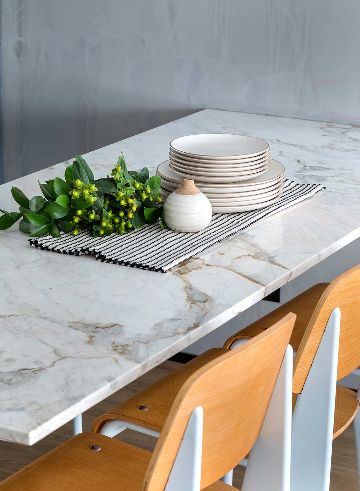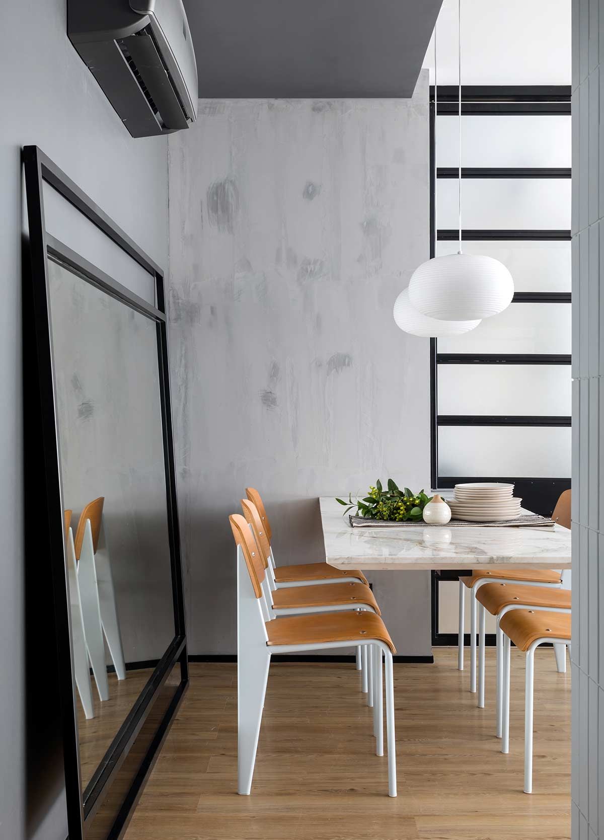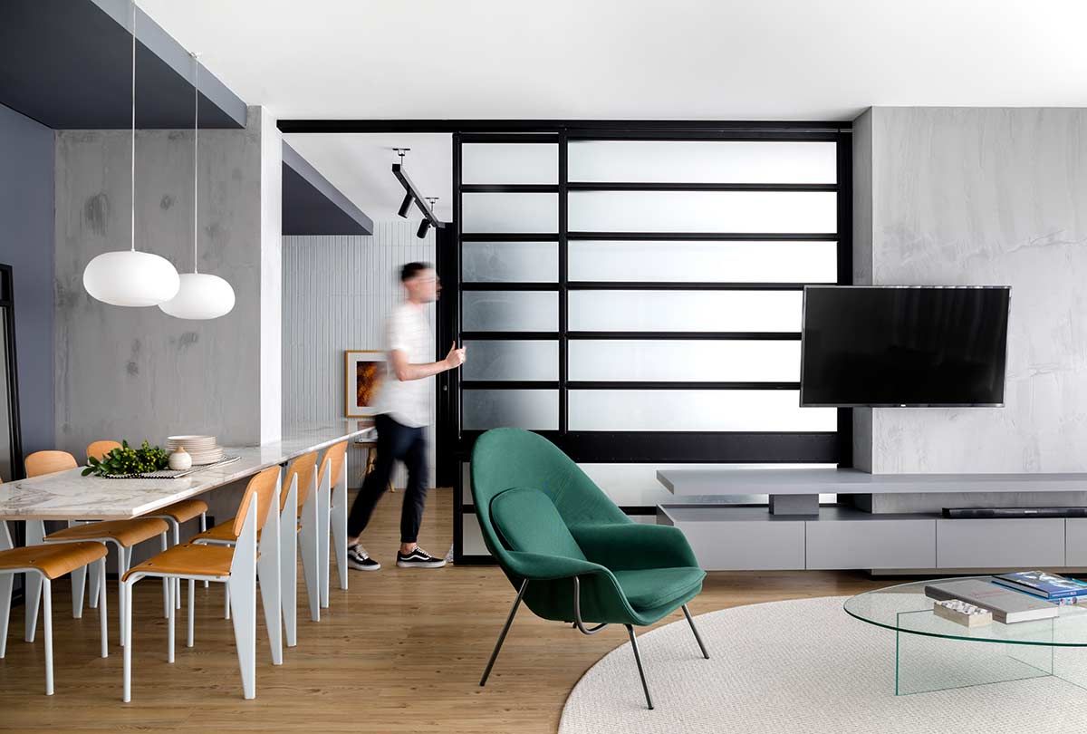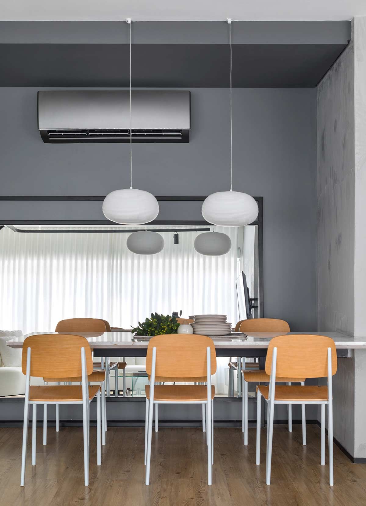 A integração foi evidenciada através de alguns elementos. Em primeiro, a grande mesa flutuante em Mármore Matarazzo serve ao jantar e ao home office, com um desenho leve e funcional. A porta de correr que eventualmente separa esses ambientes, molda-se ao desenho da mesa e, quando está totalmente aberta, a TV sustentada por um braço articulável, pode servir à sala de jantar, escritório e dormitório, além do rack que se torna um móvel de apoio para a sala e o quarto. Por fim, a divisão de setores é marcada por dois pilares longitudinais no centro, revestido em concreto polido para enfatizar seu caráter estrutural.