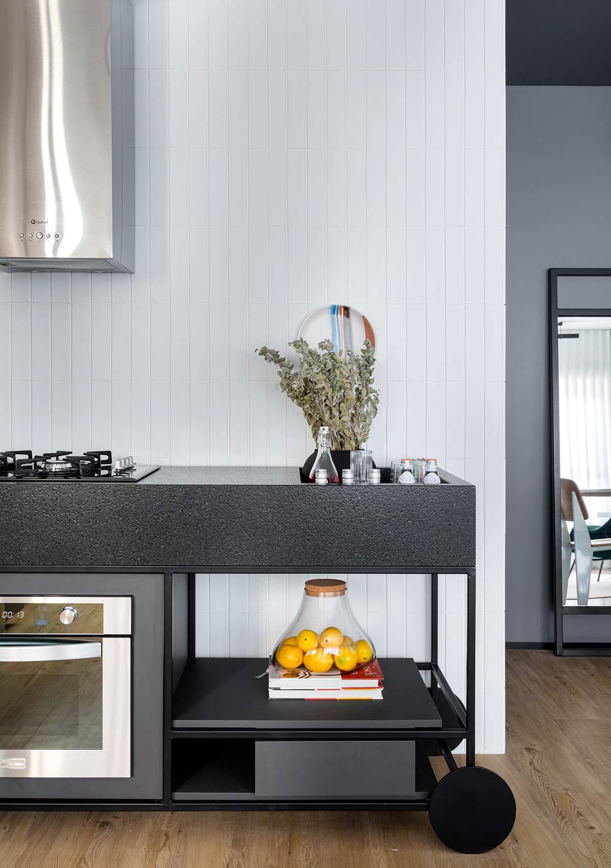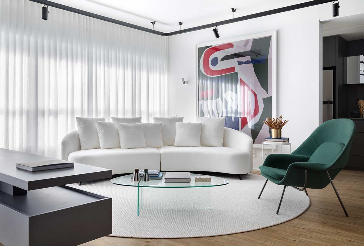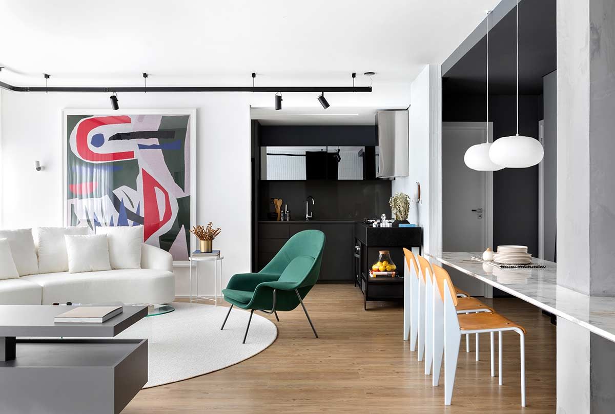 A incorporadora do edifício convocou o arquiteto Gabriel Bordin para fazer o projeto do zero deste apartamento localizado no bairro Campinas em São José, cidade no sul do país. Com a liberdade de imaginar o perfil dos futuros moradores, o principal pedido foi que o layout continuasse 100% integrado e, ao mesmo tempo, que existisse uma divisão entre a área íntima e social, possibilitando também uma abertura total do espaço.