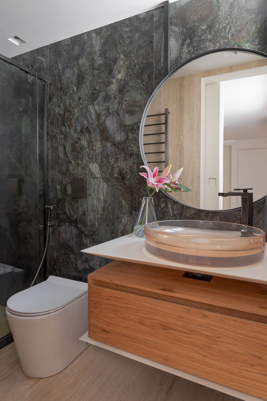 O conceito do projeto buscou uma atmosfera moderna, porém acolhedora, distante da estética óbvia de apartamento urbano. A arquiteta apostou em escolhas marcantes, como o uso de pedras naturais e exóticas, sem abrir mão da atemporalidade. O quartzito Patagônia reveste a cozinha, enquanto o Negroni aparece no lavabo e o Emerald Green dá personalidade ao banheiro da suíte do casal. No primeiro pavimento, o piso em mármore Travertino Chiaro levigado percorre todos os ambientes, reforçando a sensação de unidade.