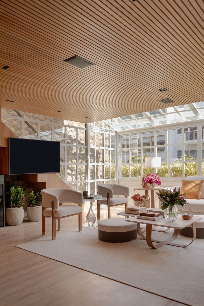 Na área social, alguns elementos se tornam protagonistas. O sunroom com estrutura branca quadriculada e envidraçada, protegido por cortinas retráteis no teto, funciona como um espaço de transição entre interior e exterior. Sob a escada, a remoção da antiga marcenaria revelou a pedra Moledo original, agora valorizada como elemento arquitetônico. O sofá em L organiza o estar, enquanto a TV The Frame, instalada na lateral da escada, assume papel quase artístico ao se transformar em quadro quando desligada.