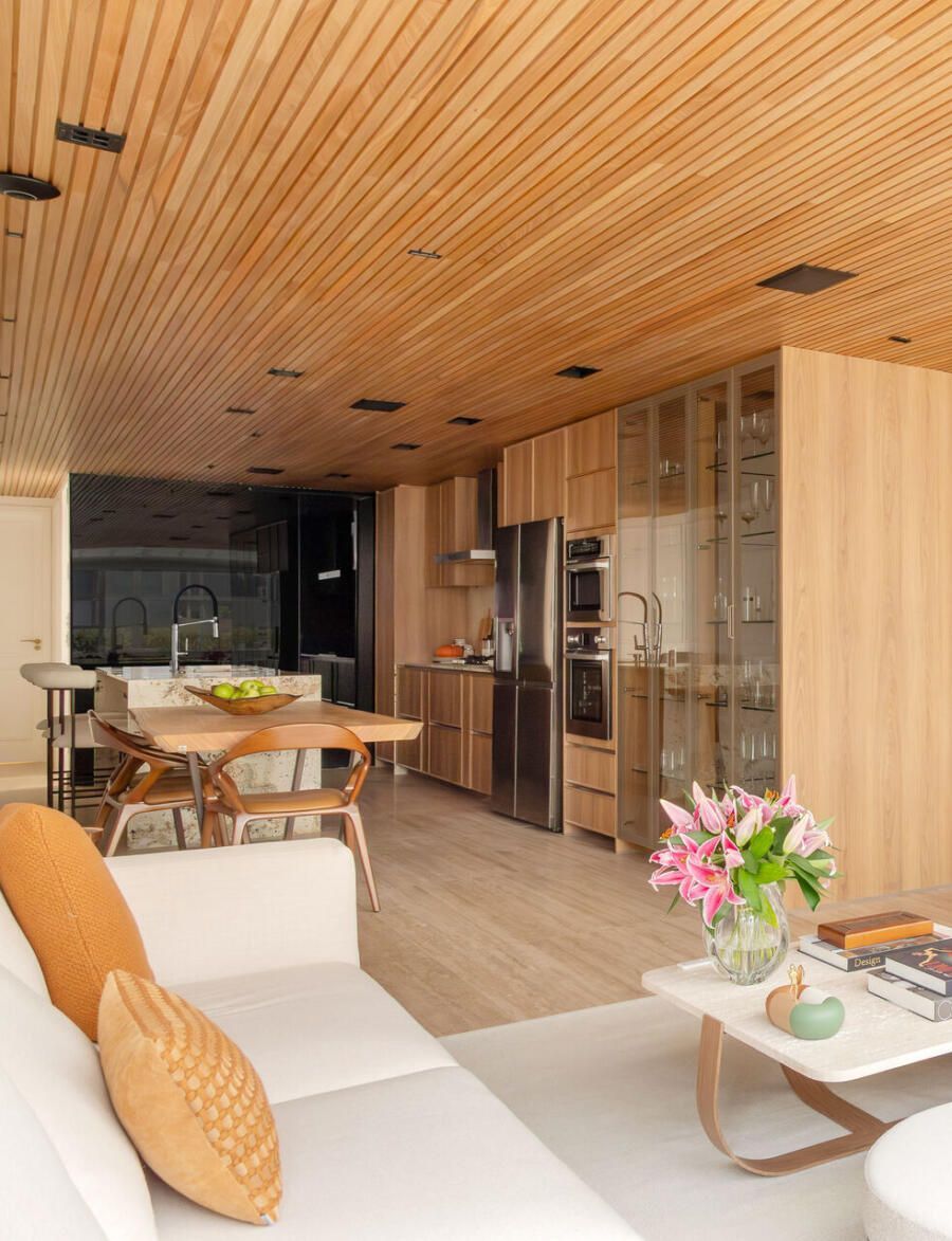 A cozinha aberta reforça o espírito de convivência do projeto. A ilha em quartzito Patagônia se integra à mesa de madeira certificada, enquanto a parede linear abriga bancada, torre quente e cristaleira. Um painel movie de vidro preto oculta a TV quando fora de uso, mantendo a leitura limpa do ambiente. O forro ripado em madeira tauari percorre todas as áreas de convivência, criando continuidade visual, enquanto no lavabo o ripado em freijó adiciona um toque de aconchego.