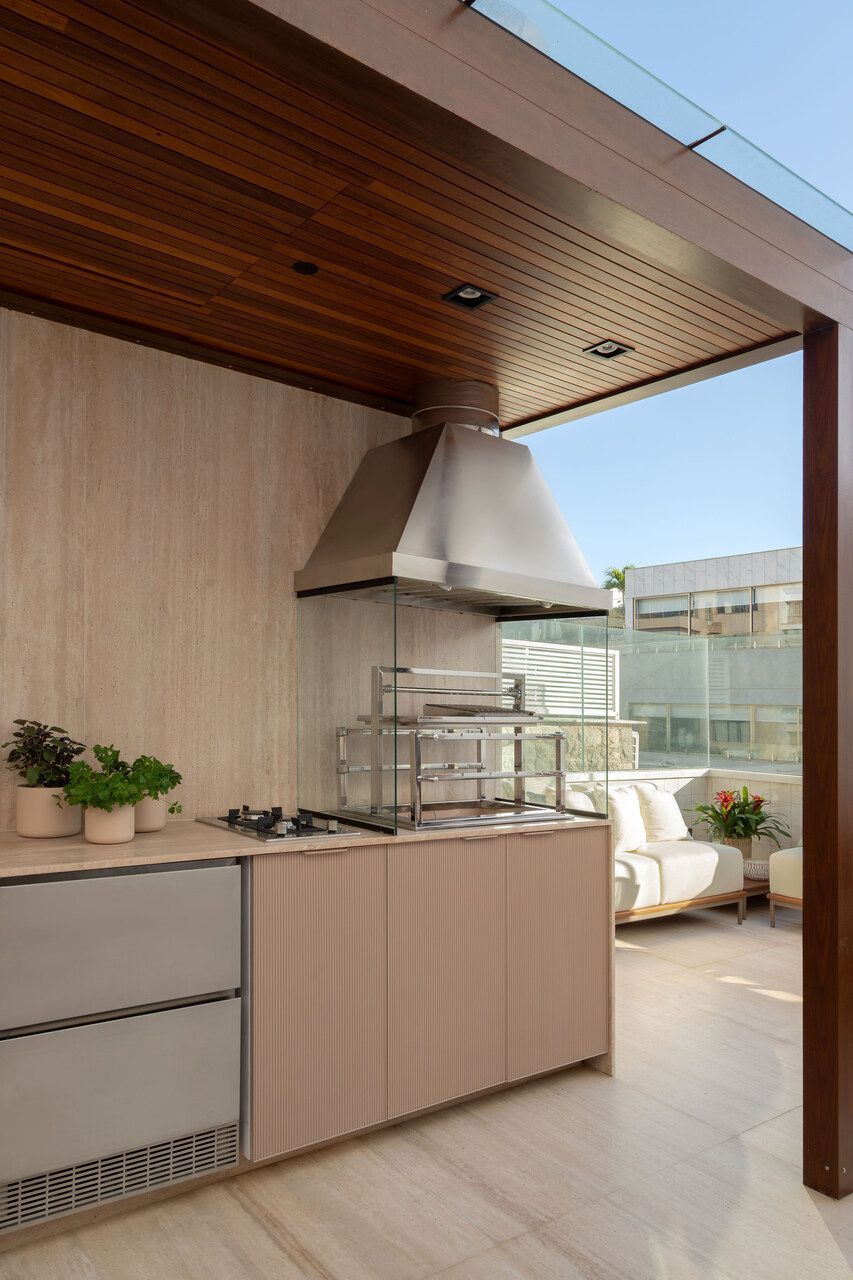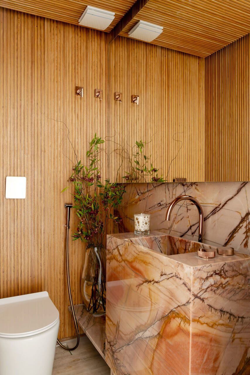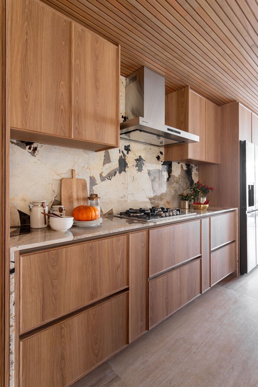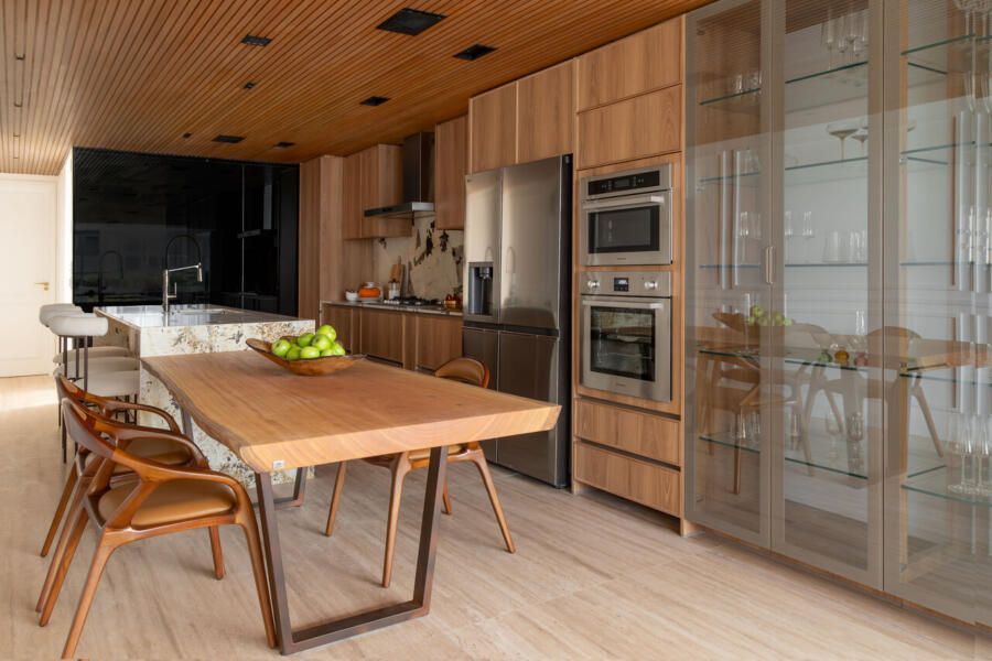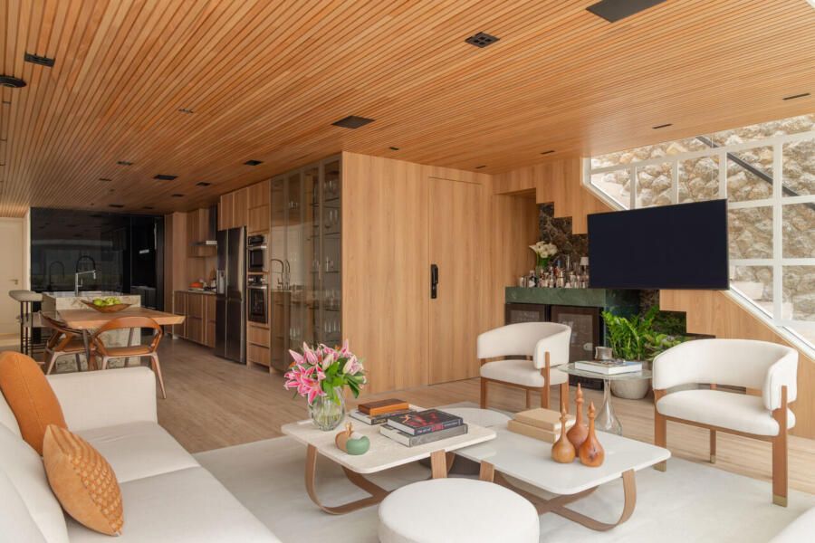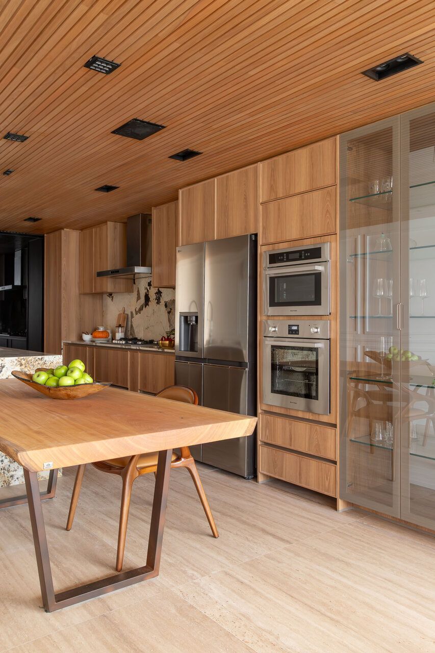 A cozinha aberta reforça o espírito de convivência do projeto. A ilha em quartzito Patagônia se integra à mesa de madeira certificada, enquanto a parede linear abriga bancada, torre quente e cristaleira. Um painel movie de vidro preto oculta a TV quando fora de uso, mantendo a leitura limpa do ambiente. O forro ripado em madeira tauari percorre todas as áreas de convivência, criando continuidade visual, enquanto no lavabo o ripado em freijó adiciona um toque de aconchego.