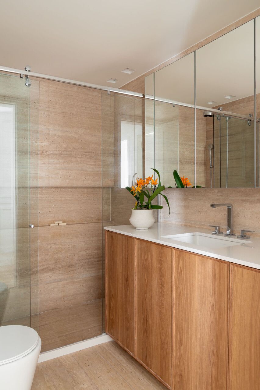 O conceito do projeto buscou uma atmosfera moderna, porém acolhedora, distante da estética óbvia de apartamento urbano. A arquiteta apostou em escolhas marcantes, como o uso de pedras naturais e exóticas, sem abrir mão da atemporalidade. O quartzito Patagônia reveste a cozinha, enquanto o Negroni aparece no lavabo e o Emerald Green dá personalidade ao banheiro da suíte do casal. No primeiro pavimento, o piso em mármore Travertino Chiaro levigado percorre todos os ambientes, reforçando a sensação de unidade.