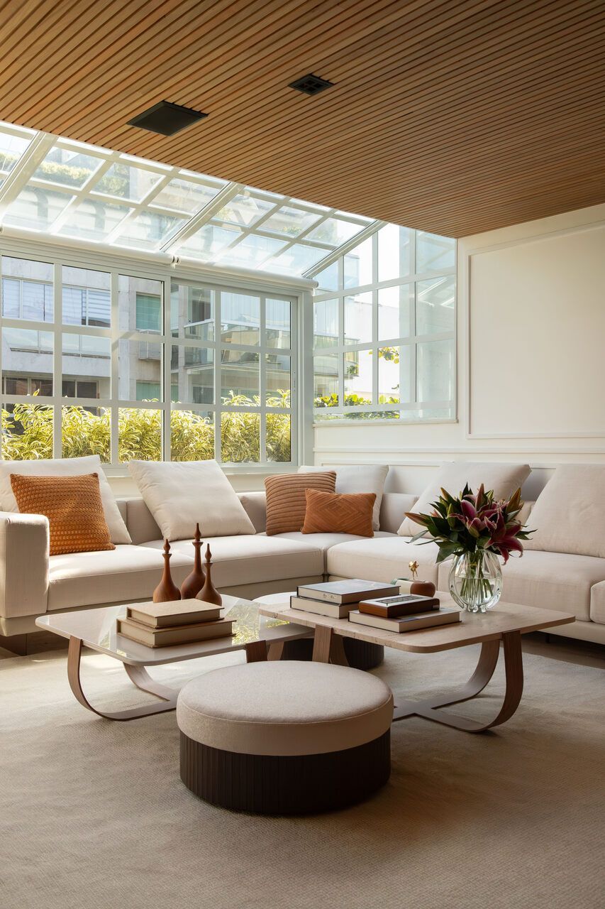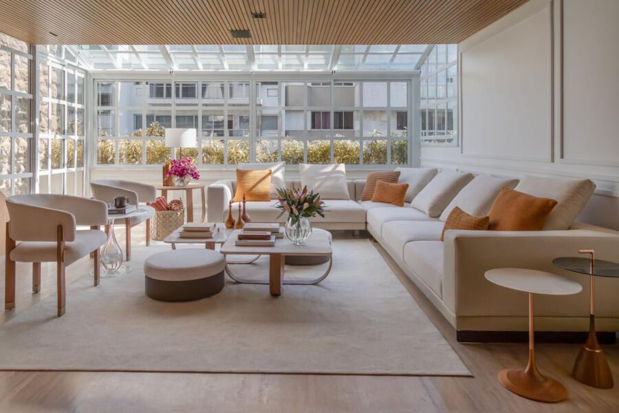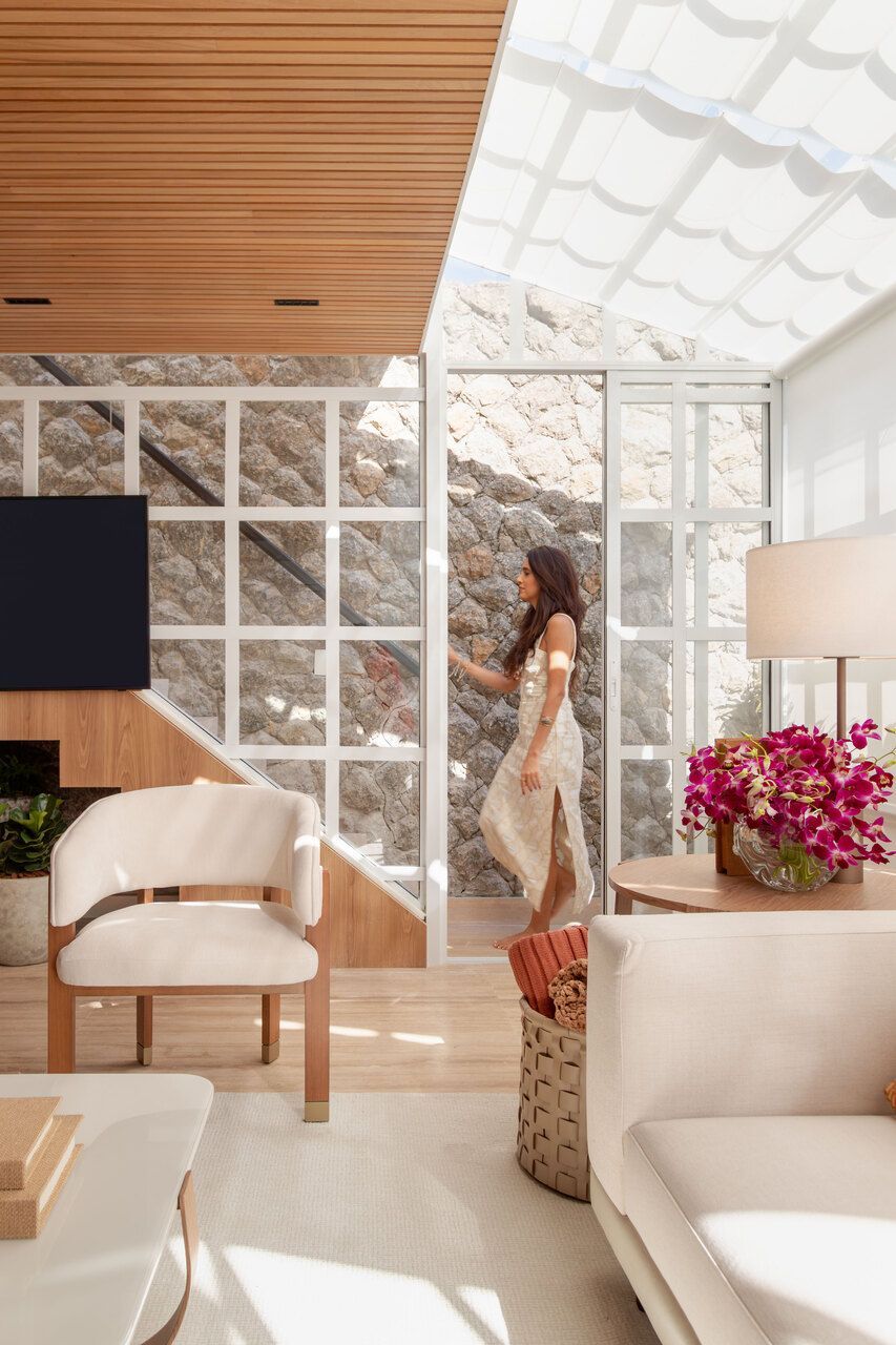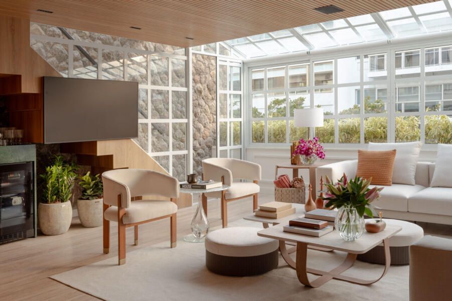 Na área social, alguns elementos se tornam protagonistas. O sunroom com estrutura branca quadriculada e envidraçada, protegido por cortinas retráteis no teto, funciona como um espaço de transição entre interior e exterior. Sob a escada, a remoção da antiga marcenaria revelou a pedra Moledo original, agora valorizada como elemento arquitetônico. O sofá em L organiza o estar, enquanto a TV The Frame, instalada na lateral da escada, assume papel quase artístico ao se transformar em quadro quando desligada.