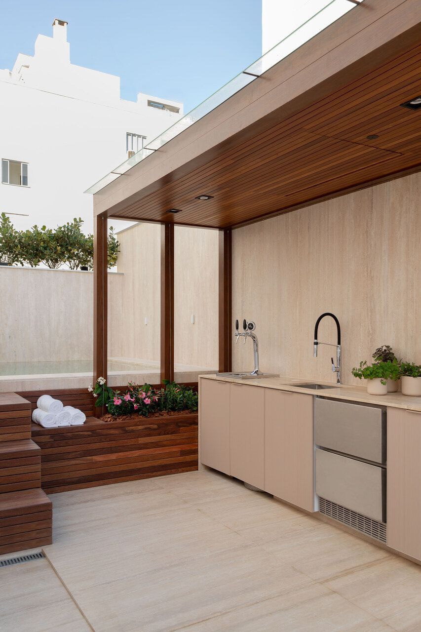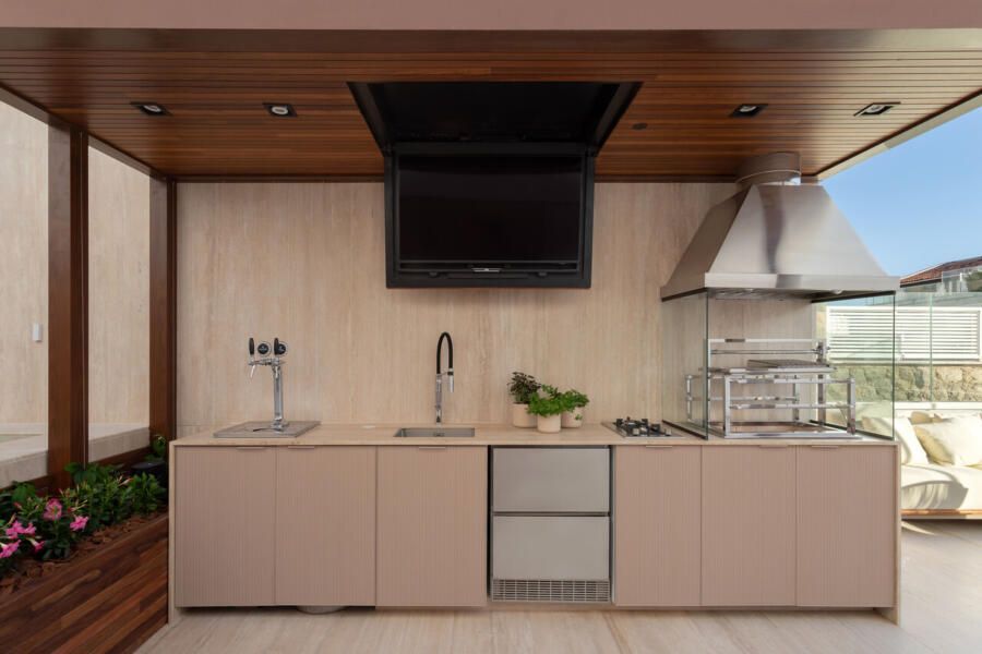 No pavimento superior, a área externa reúne piscina, estar e refeições ao ar livre, além de uma bancada equipada com churrasqueira e chopeira, protegida por cobertura metálica que integra a TV flap ao teto de madeira. A obra teve duração total de um ano — três meses de projeto e nove de execução — e foi integralmente gerenciada pelo escritório, já que os clientes estiveram no Brasil apenas duas vezes durante o processo.