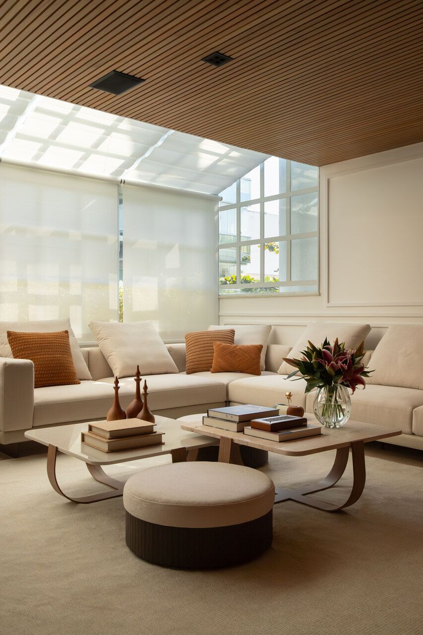 A decoração, inteiramente nova, combina peças de design brasileiro com uma paleta elegante de bege, madeira e preto. Texturas e acabamentos variados criam interesse visual e profundidade, evitando qualquer monotonia. Entre os destaques estão a mesa lateral Emoções, de Luisa Moyses, e o sofá Netuno, da Basi.co Design, que ajudam a definir uma linguagem elegante e confortável, pensada para o uso cotidiano e para receber.