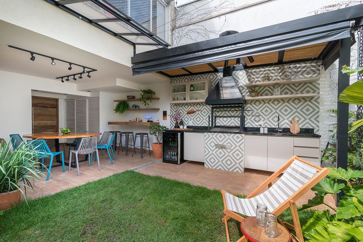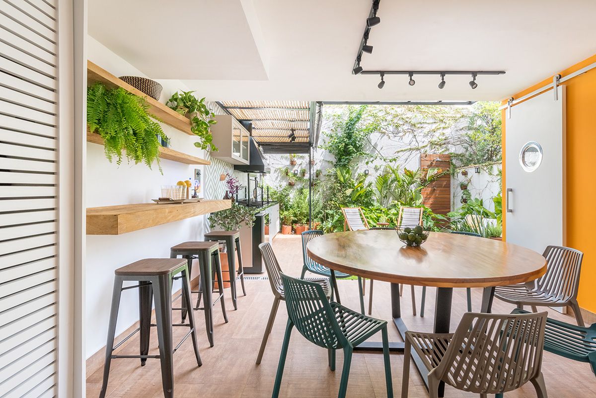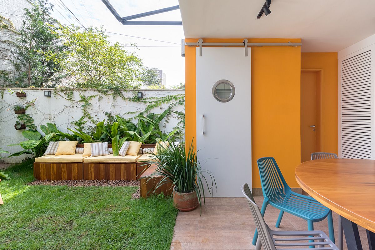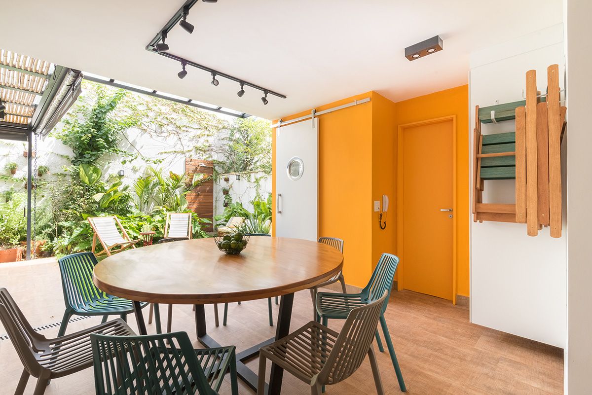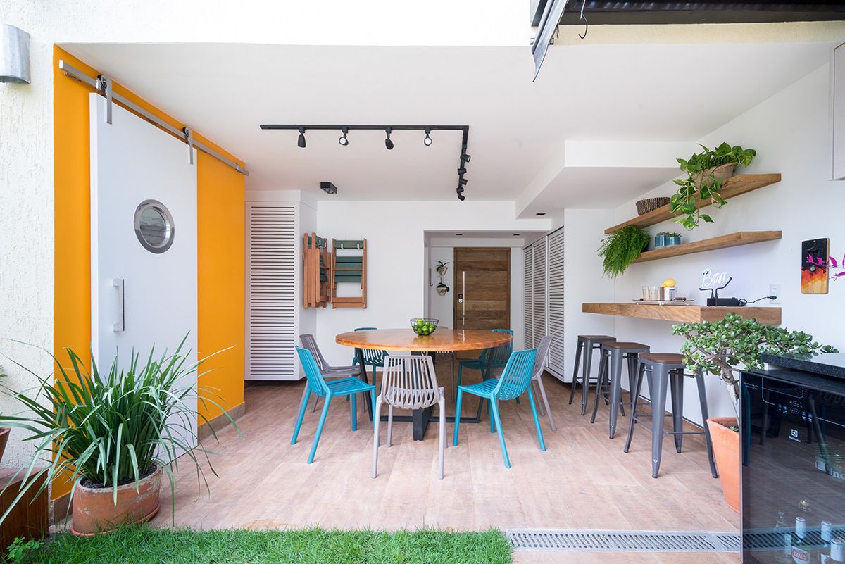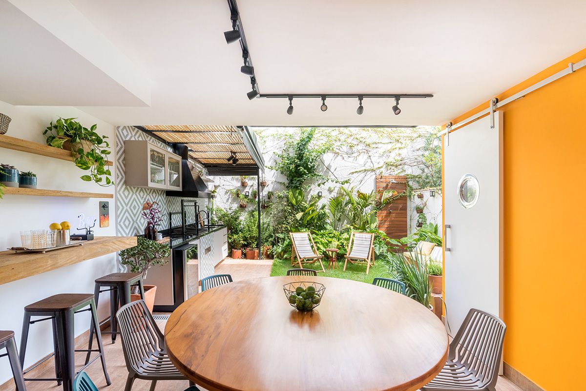 Paredes foram eliminadas e, com a diminuição da lavanderia e do depósito, a designer conseguiu incluir um lavabo bem charmoso. A fachada também foi reformada, o espaço na garagem que antes era vaga extra, recebe hoje uma mesa de oito lugares, e tudo ficou mais amplo e agradável com o projeto de paisagismo.