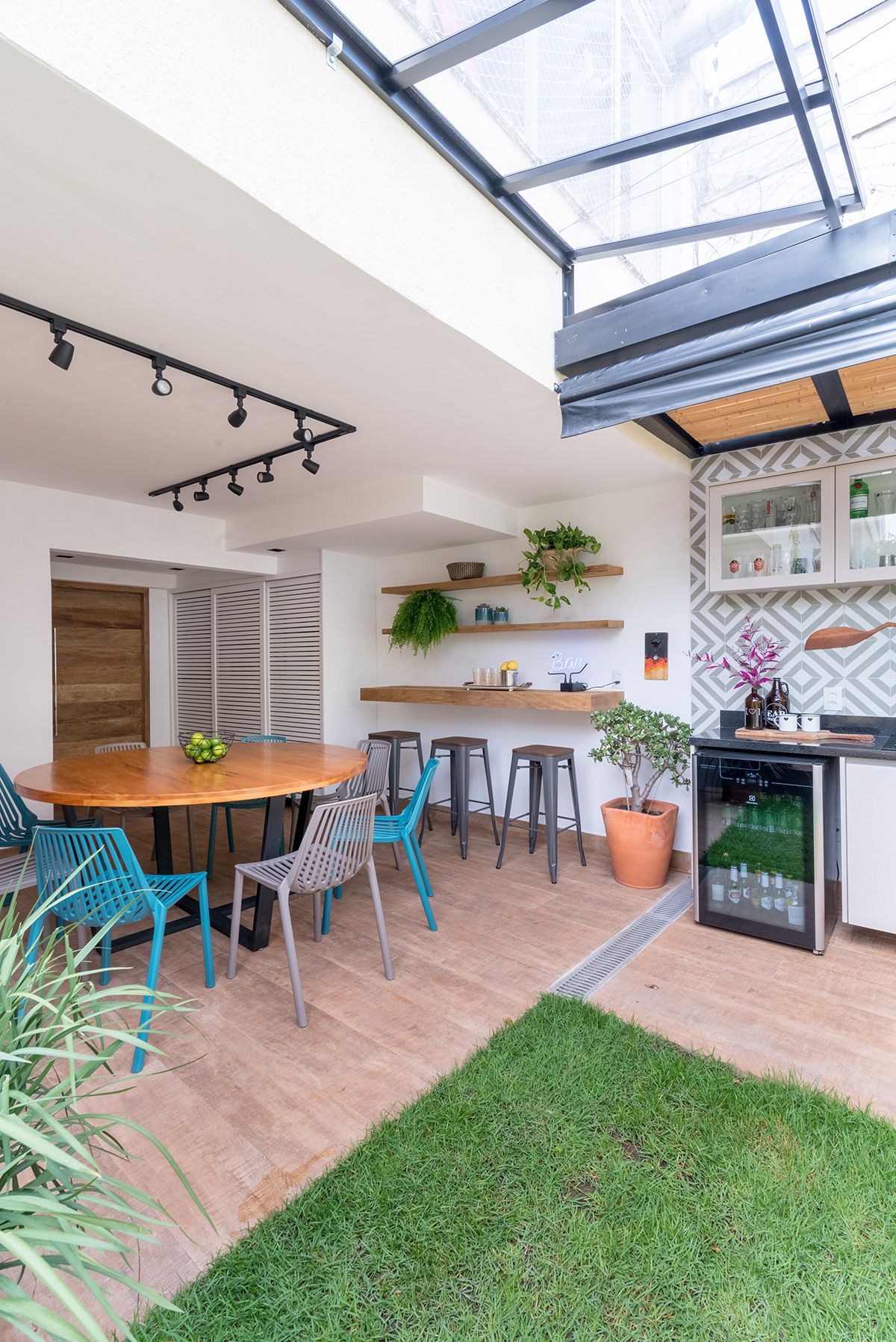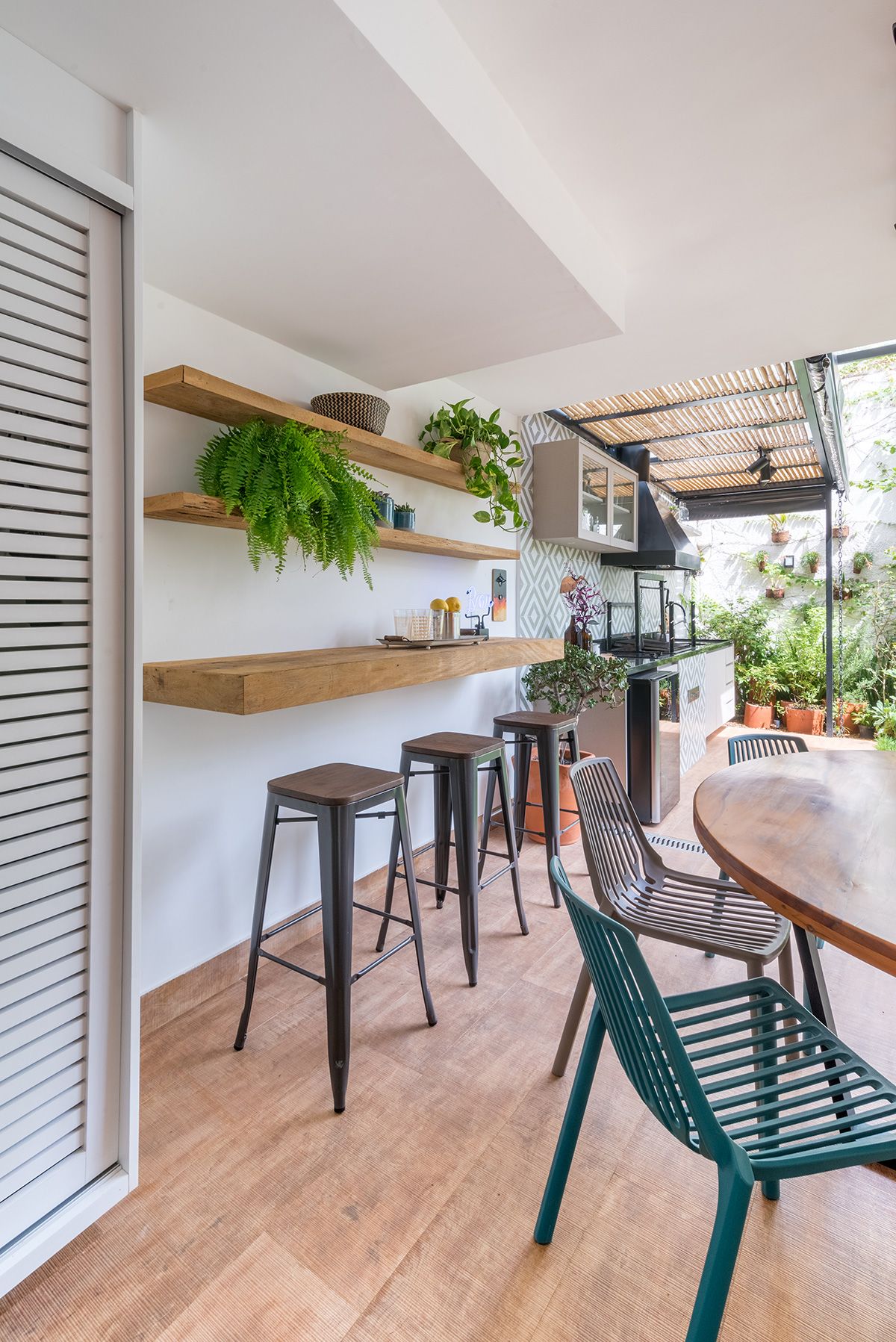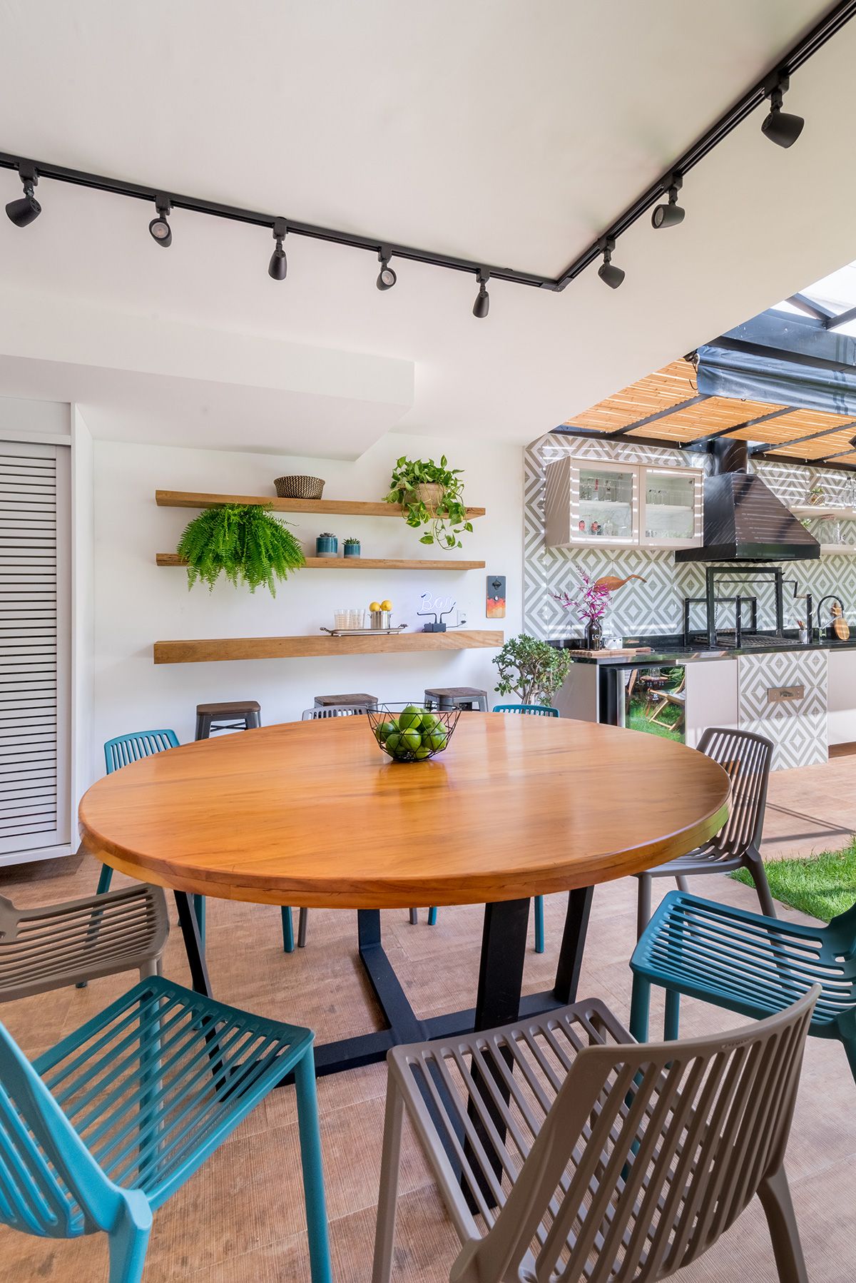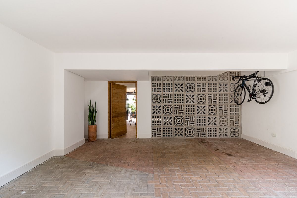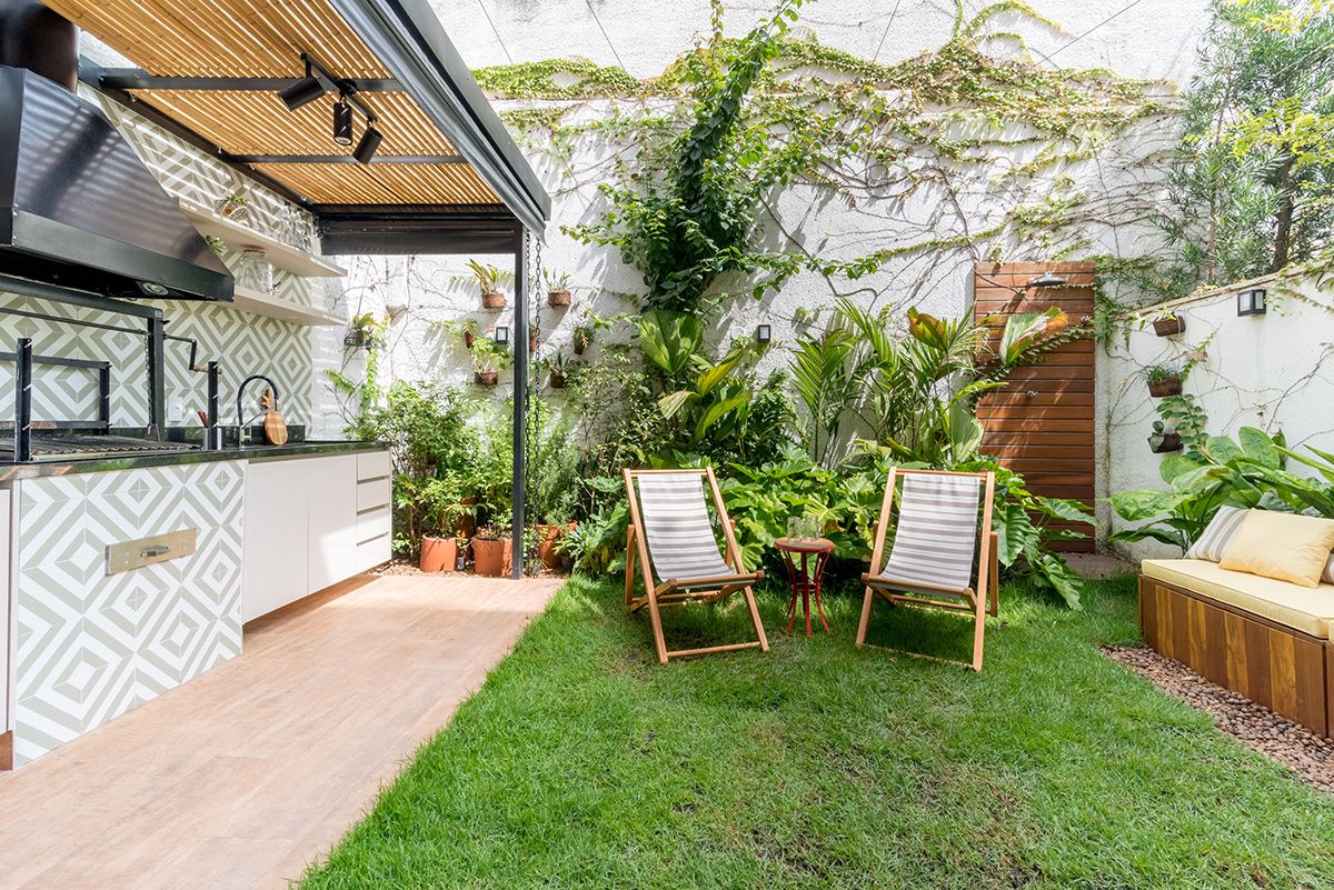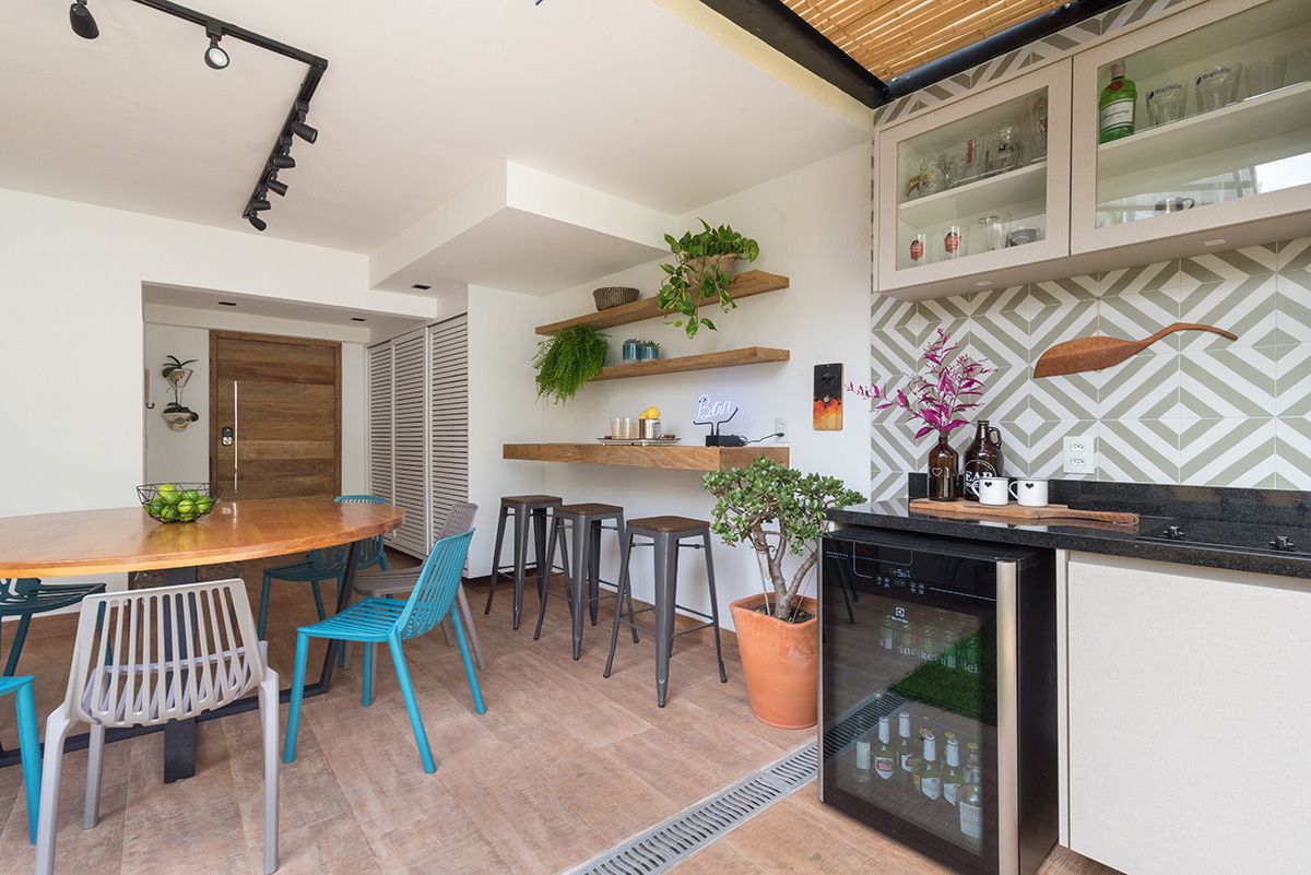 Paredes foram eliminadas e, com a diminuição da lavanderia e do depósito, a designer conseguiu incluir um lavabo bem charmoso. A fachada também foi reformada, o espaço na garagem que antes era vaga extra, recebe hoje uma mesa de oito lugares, e tudo ficou mais amplo e agradável com o projeto de paisagismo.