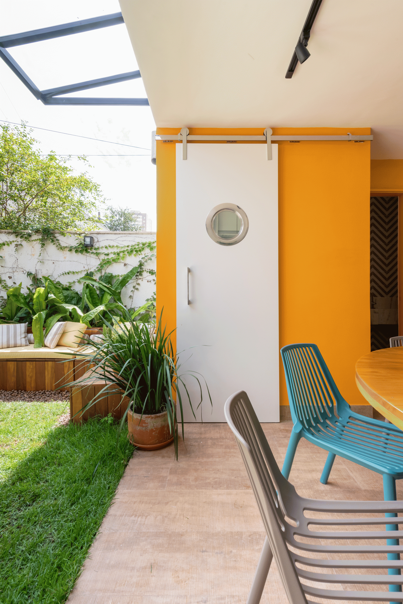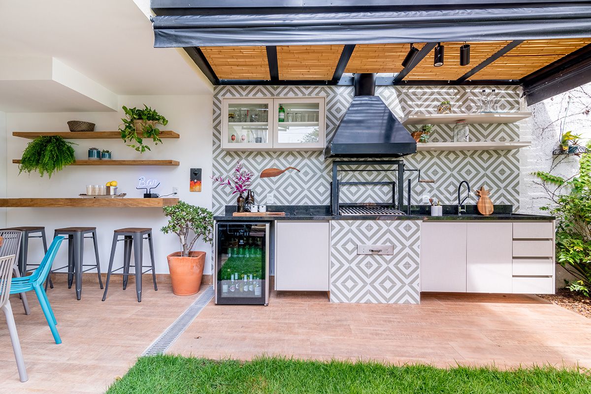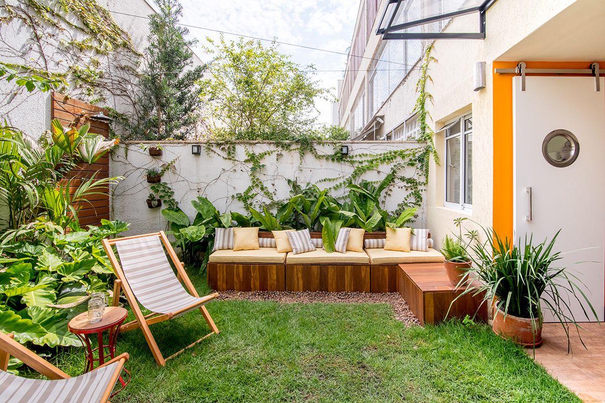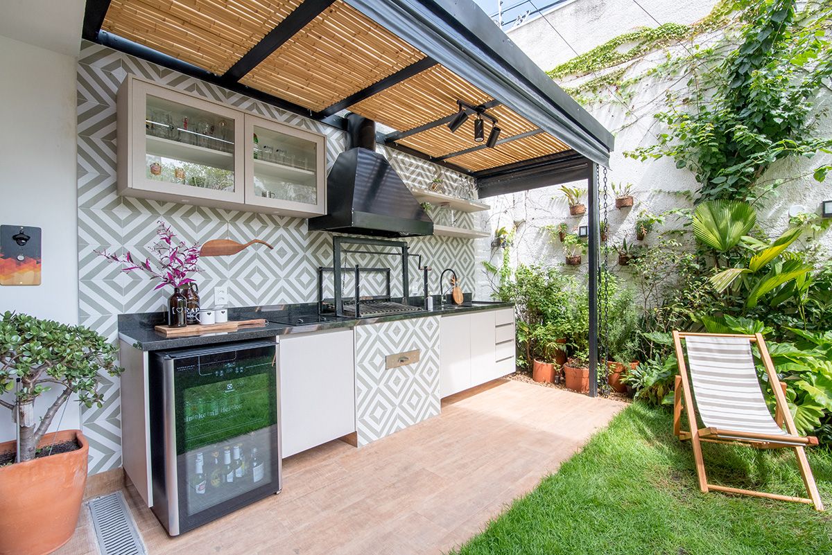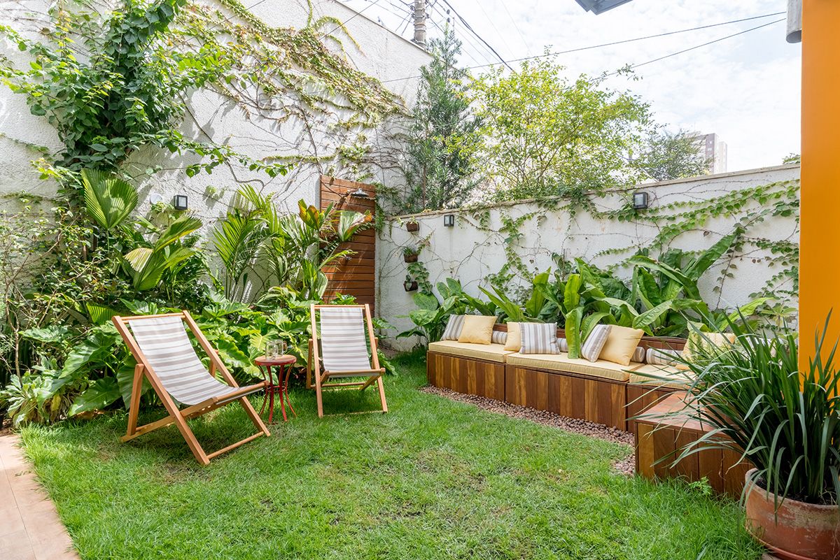 Paredes foram eliminadas e, com a diminuição da lavanderia e do depósito, a designer conseguiu incluir um lavabo bem charmoso. A fachada também foi reformada, o espaço na garagem que antes era vaga extra, recebe hoje uma mesa de oito lugares, e tudo ficou mais amplo e agradável com o projeto de paisagismo.