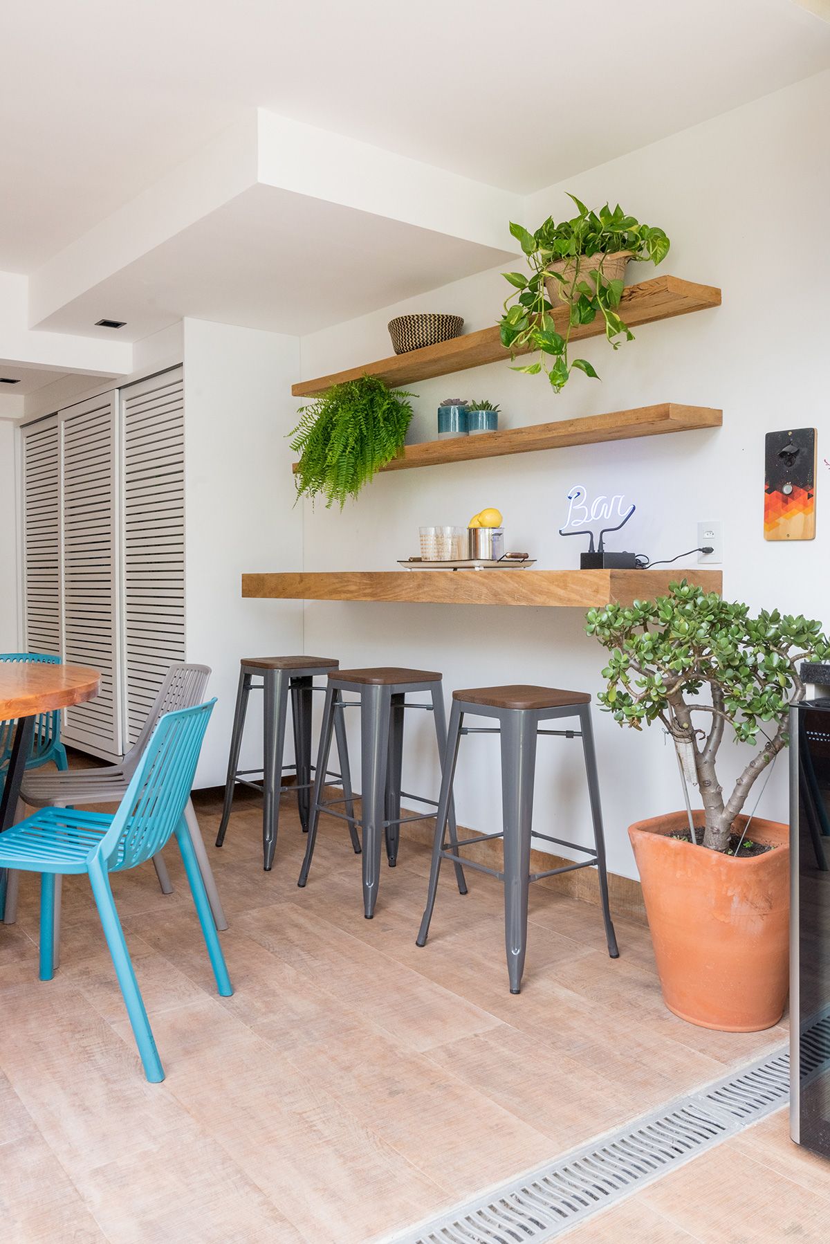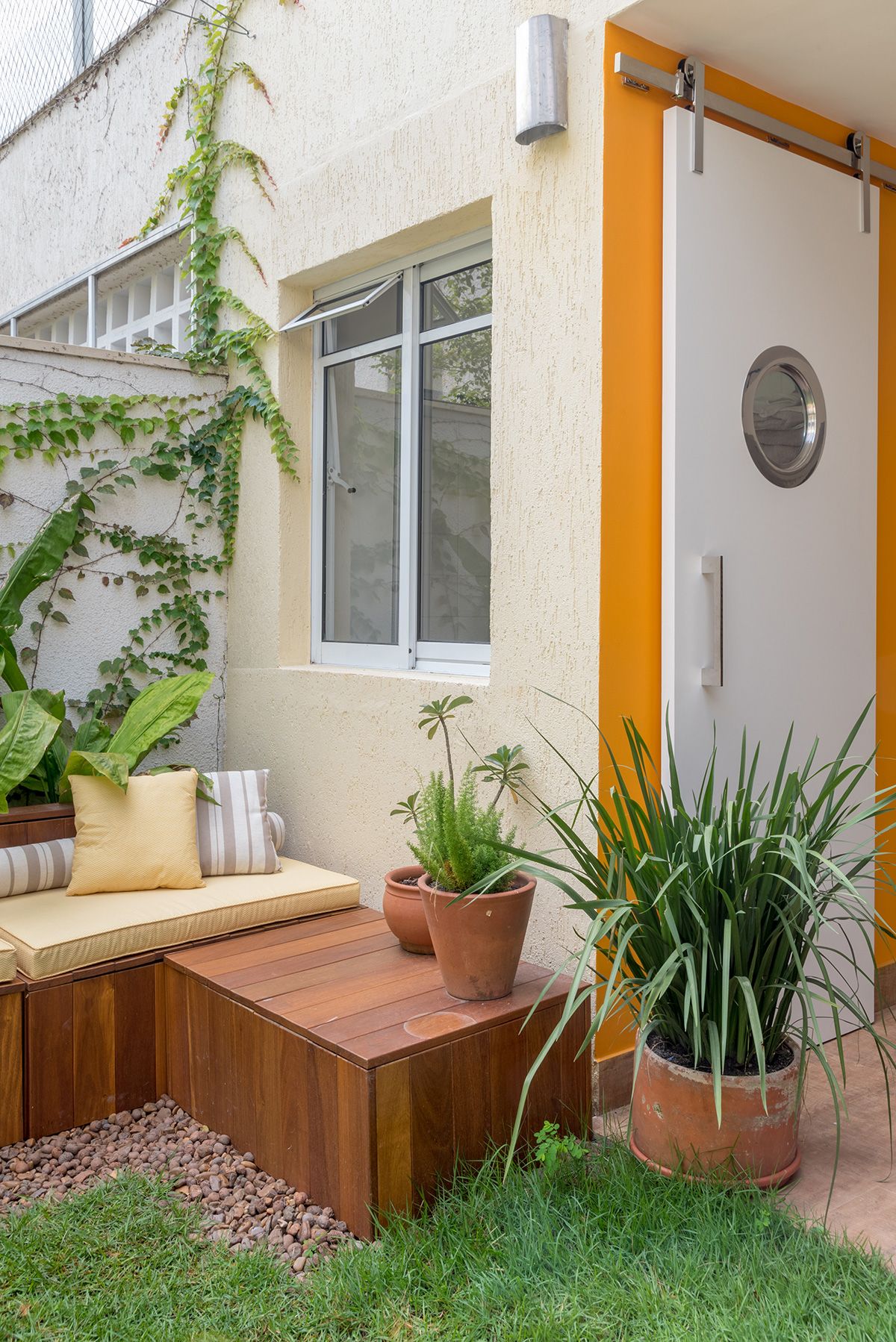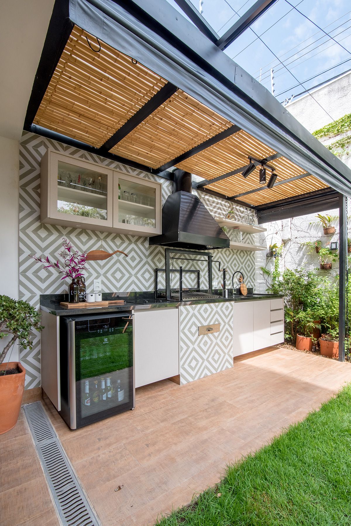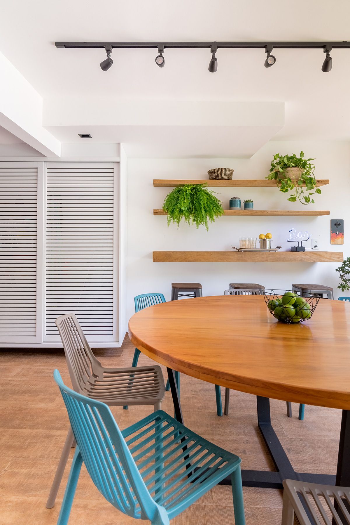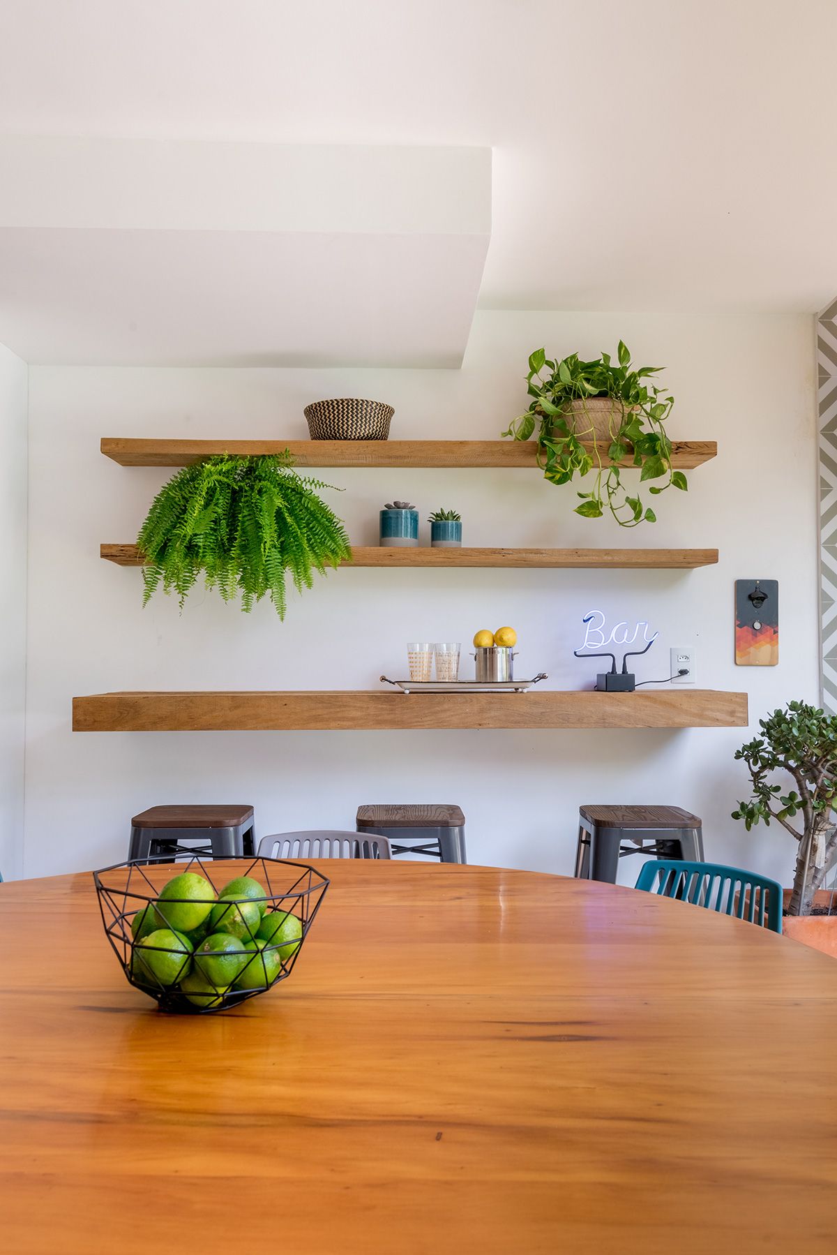 Paredes foram eliminadas e, com a diminuição da lavanderia e do depósito, a designer conseguiu incluir um lavabo bem charmoso. A fachada também foi reformada, o espaço na garagem que antes era vaga extra, recebe hoje uma mesa de oito lugares, e tudo ficou mais amplo e agradável com o projeto de paisagismo.