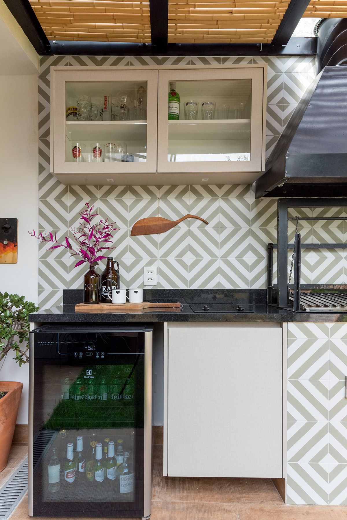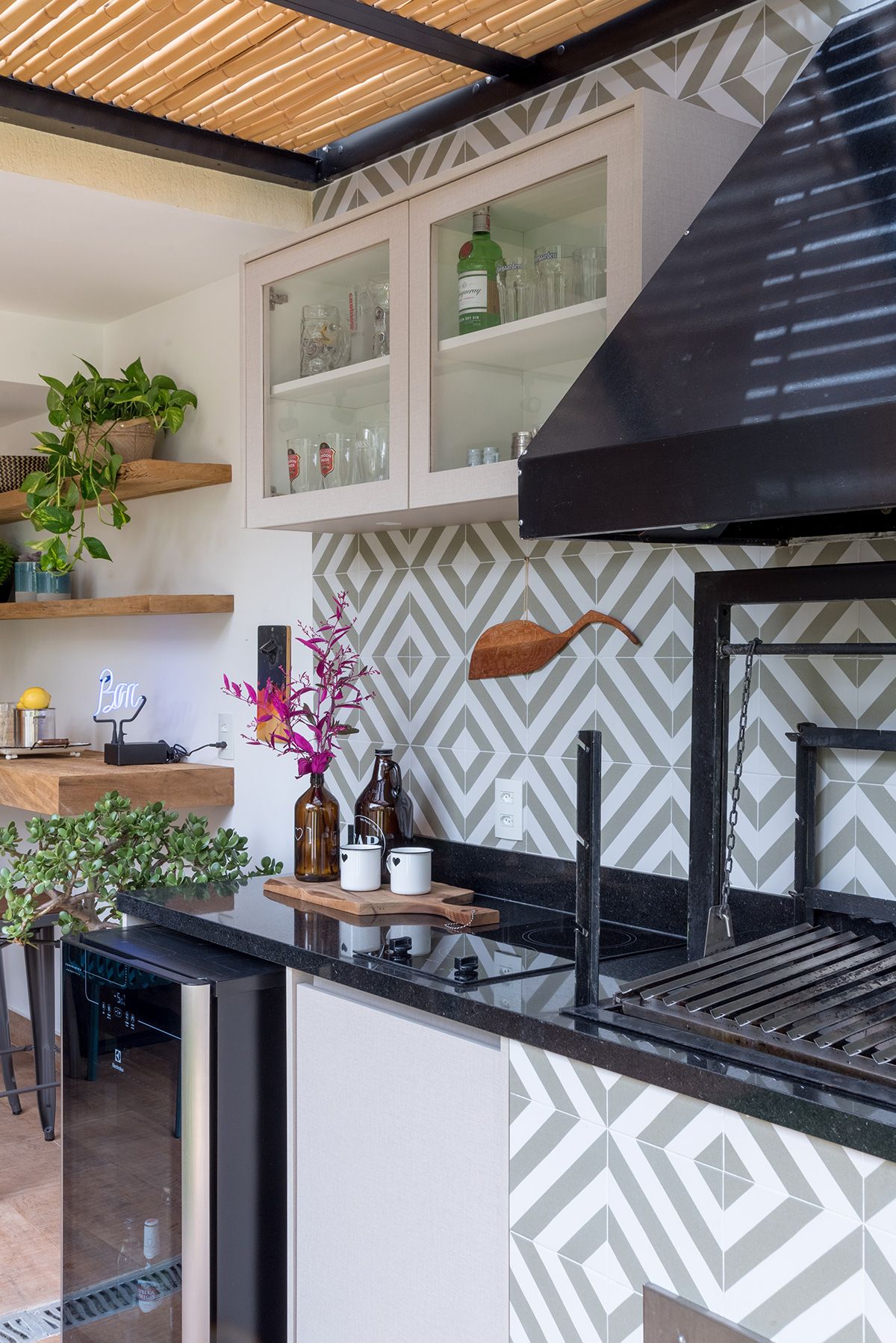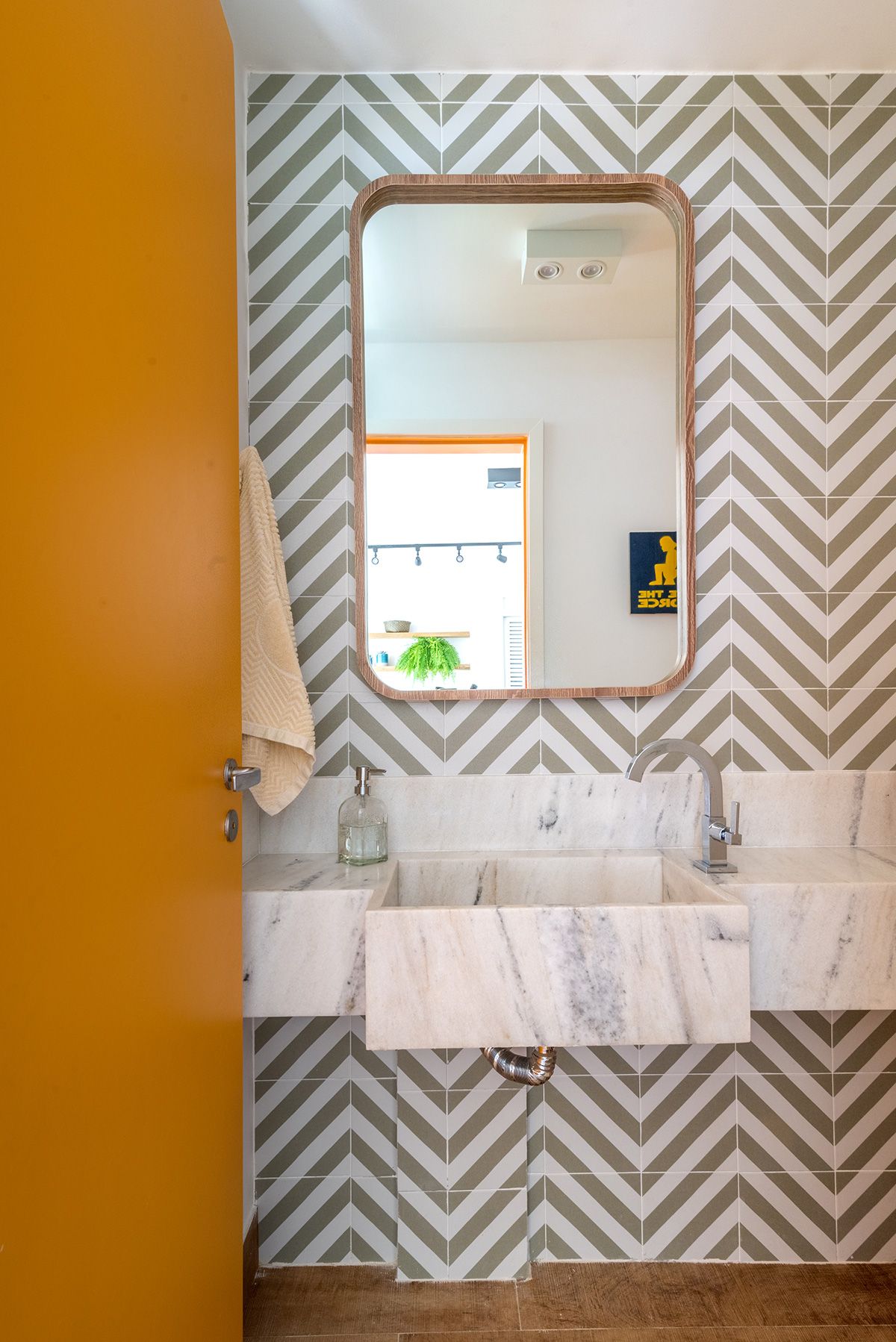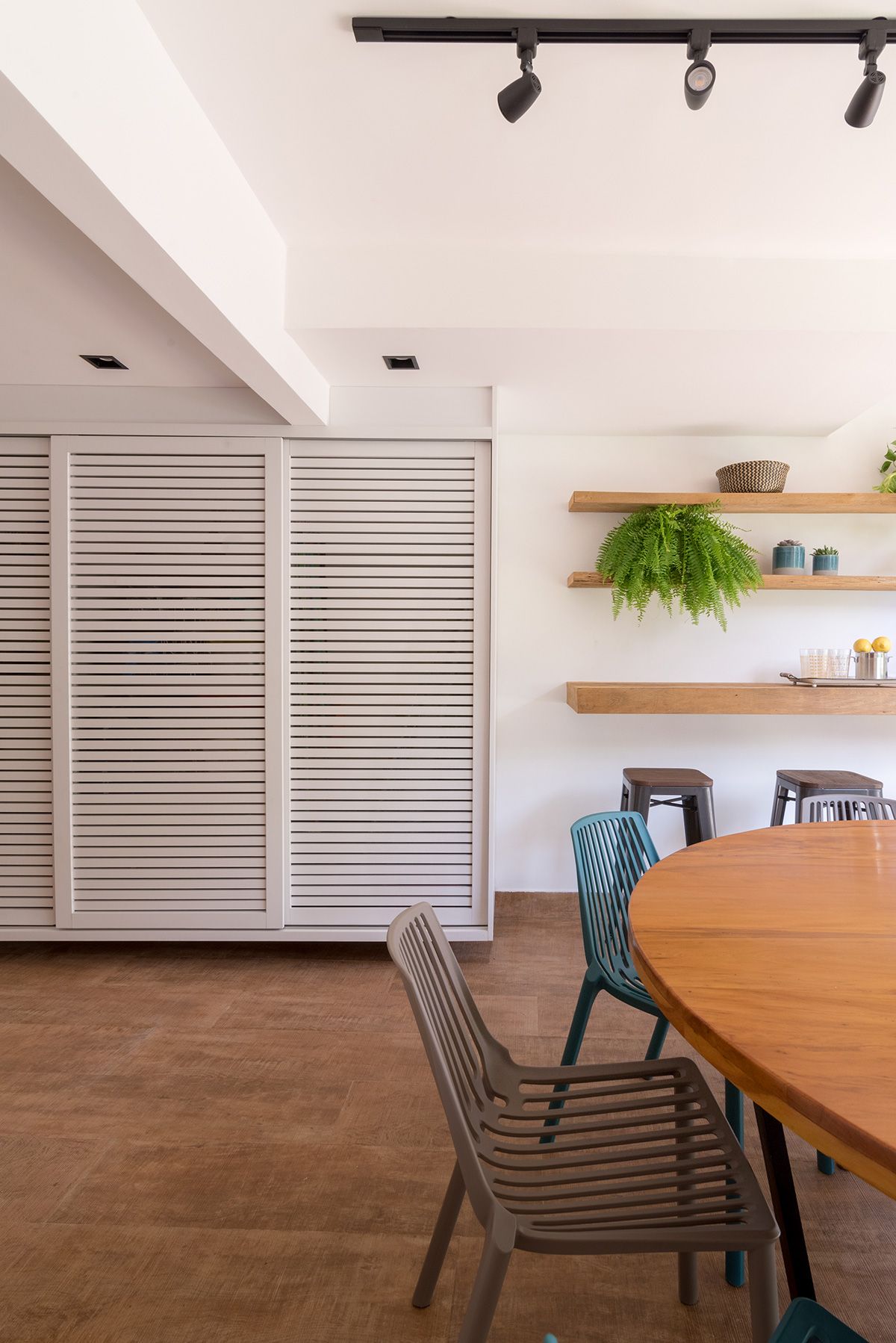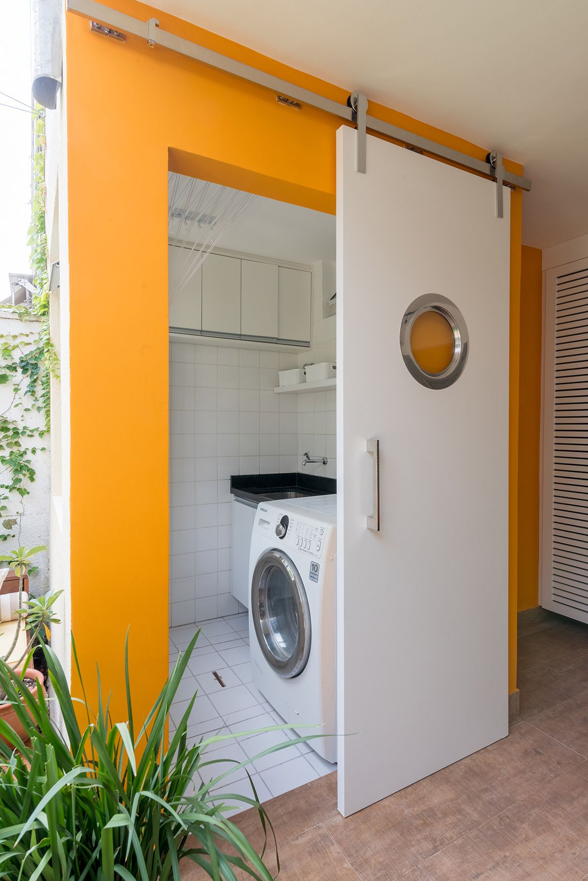 Paredes foram eliminadas e, com a diminuição da lavanderia e do depósito, a designer conseguiu incluir um lavabo bem charmoso. A fachada também foi reformada, o espaço na garagem que antes era vaga extra, recebe hoje uma mesa de oito lugares, e tudo ficou mais amplo e agradável com o projeto de paisagismo.