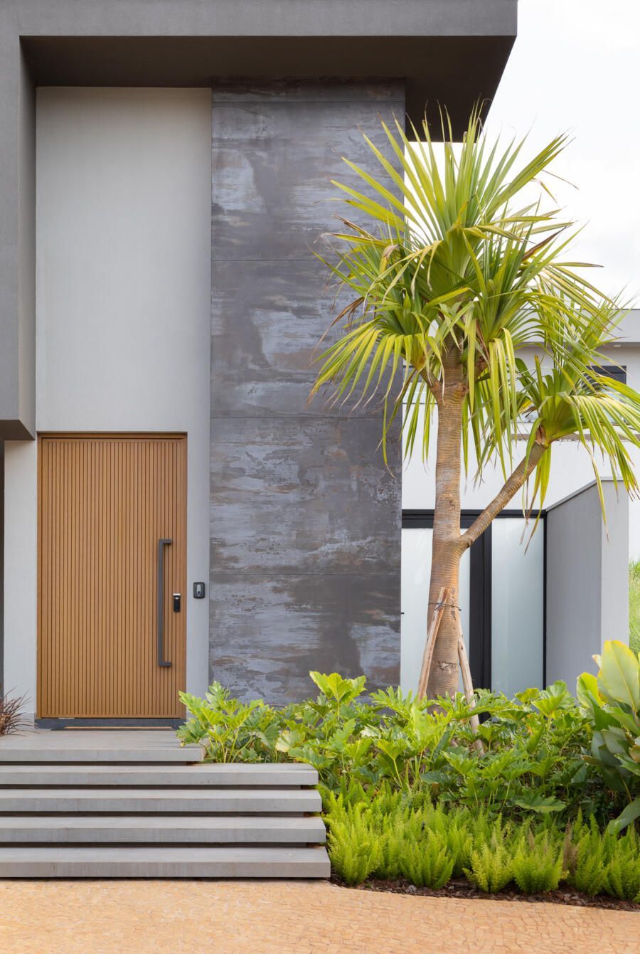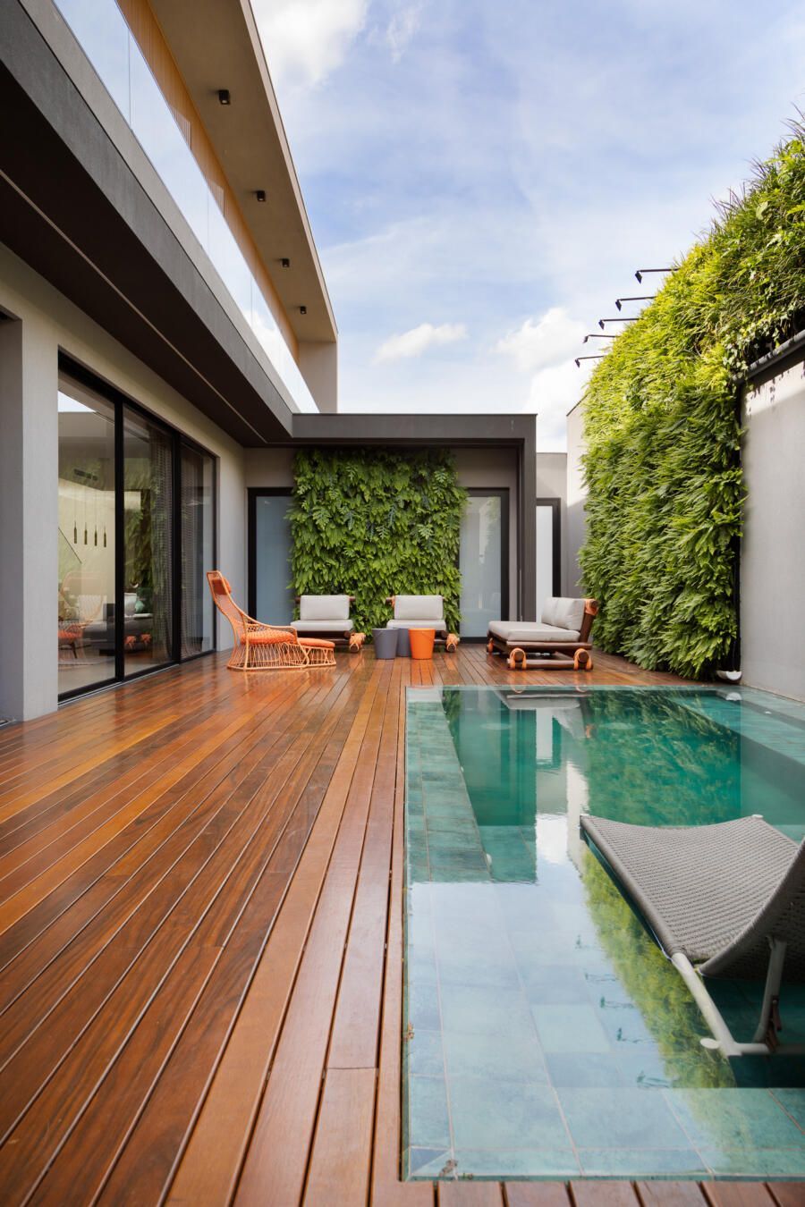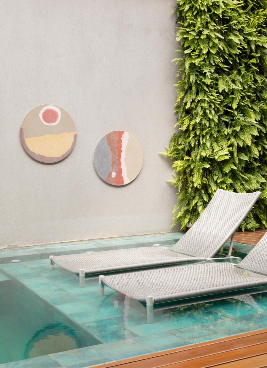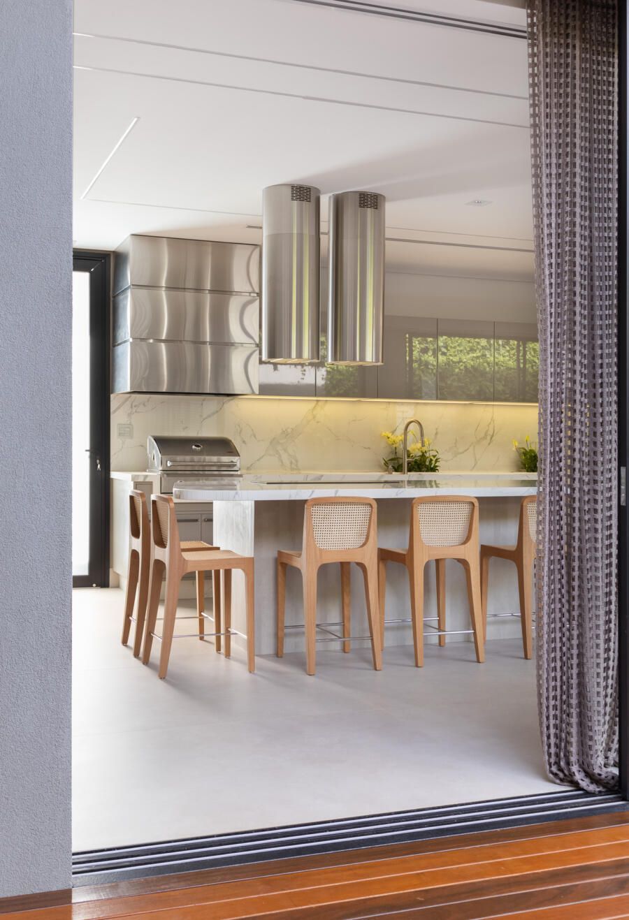 “Por esta razão, posicionei a área de lazer externa, incluindo a piscina, do lado esquerdo do terreno e projetei a casa voltada para ela. Além disso, quando estão abertos, os brises tornam cada varanda privativa.”