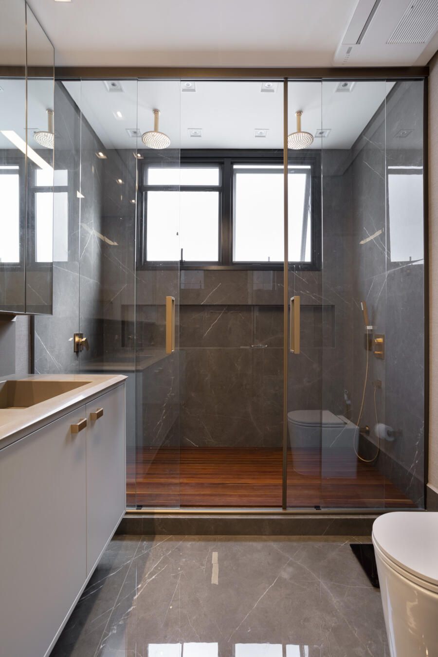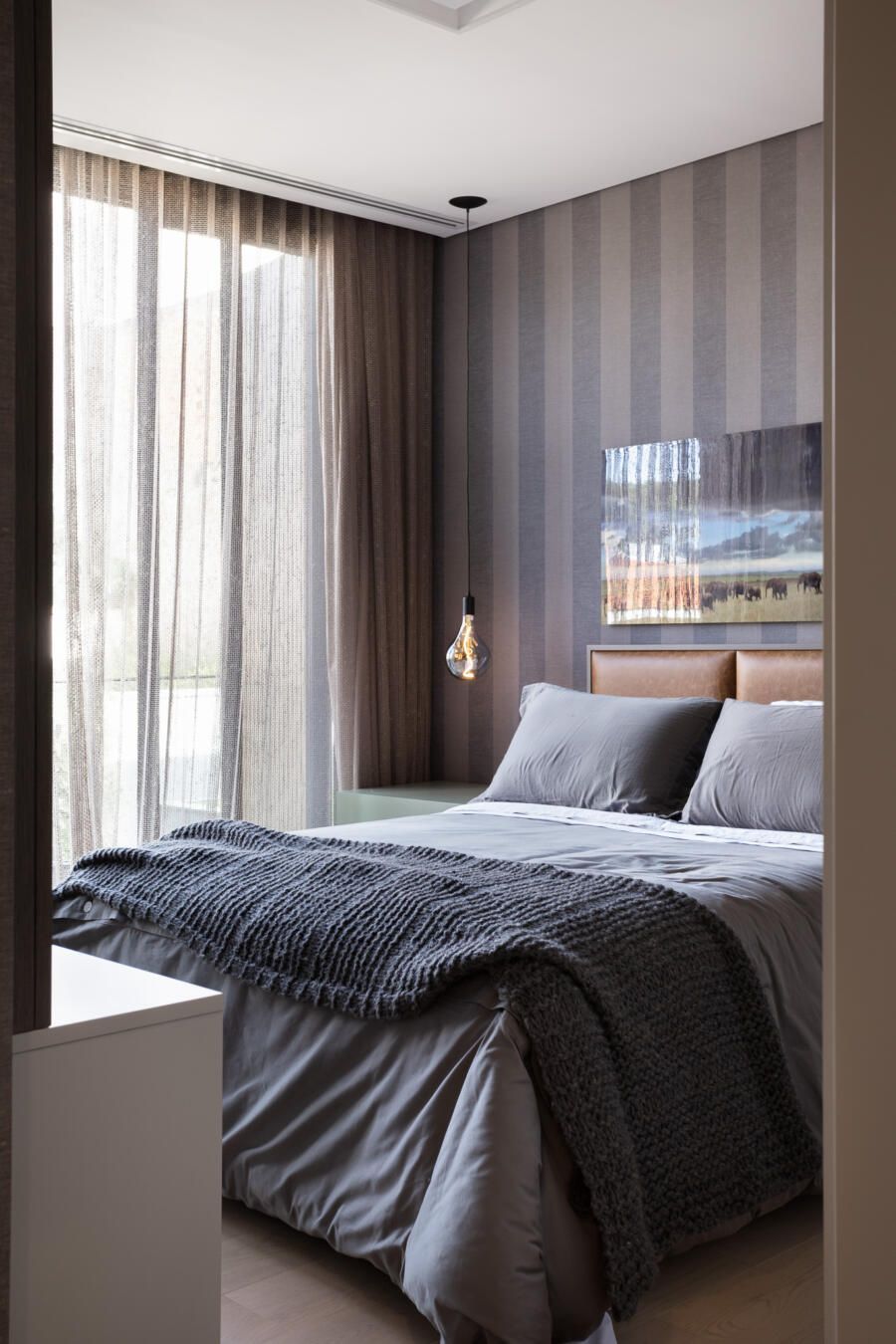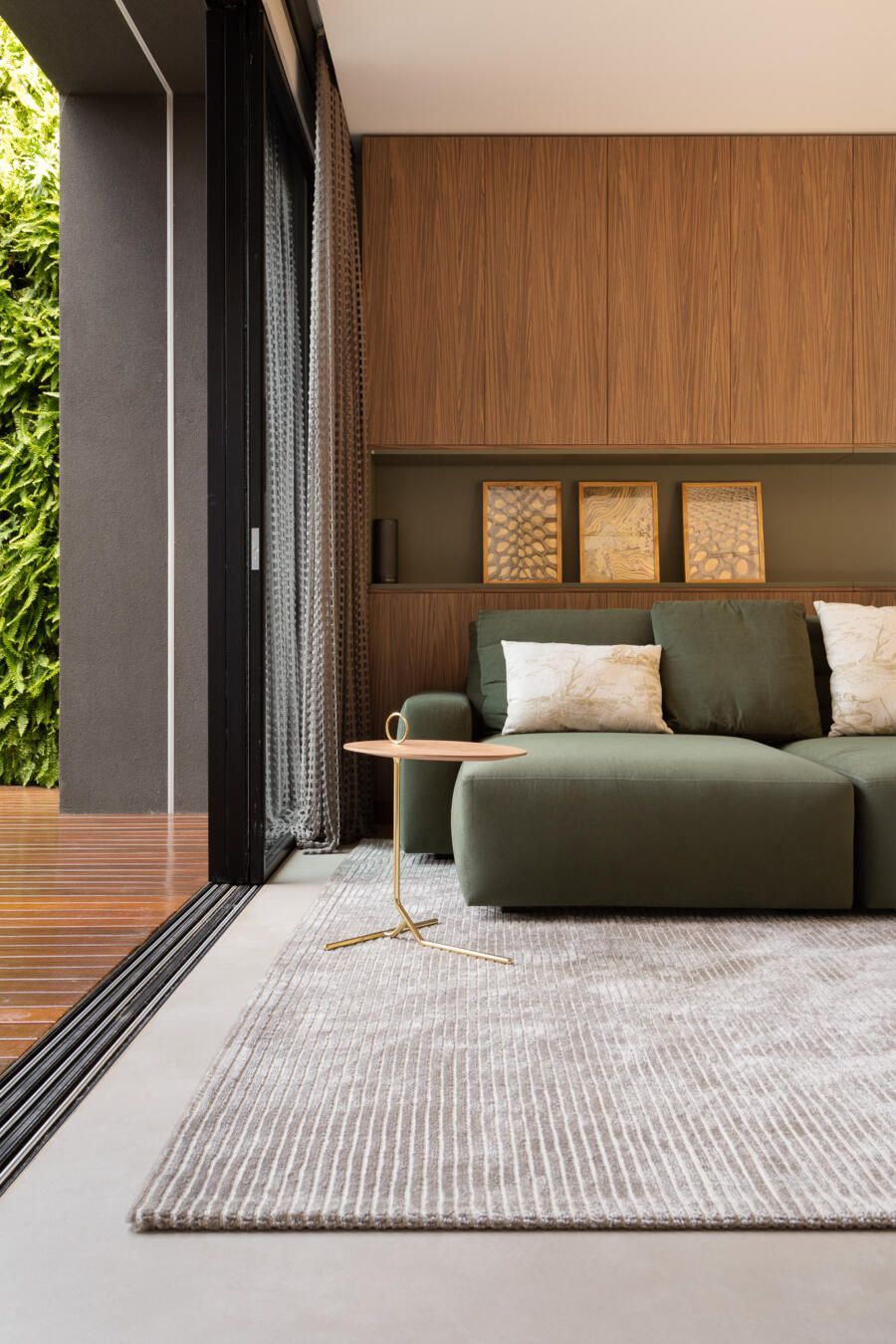 “Por esta razão, posicionei a área de lazer externa, incluindo a piscina, do lado esquerdo do terreno e projetei a casa voltada para ela. Além disso, quando estão abertos, os brises tornam cada varanda privativa.”