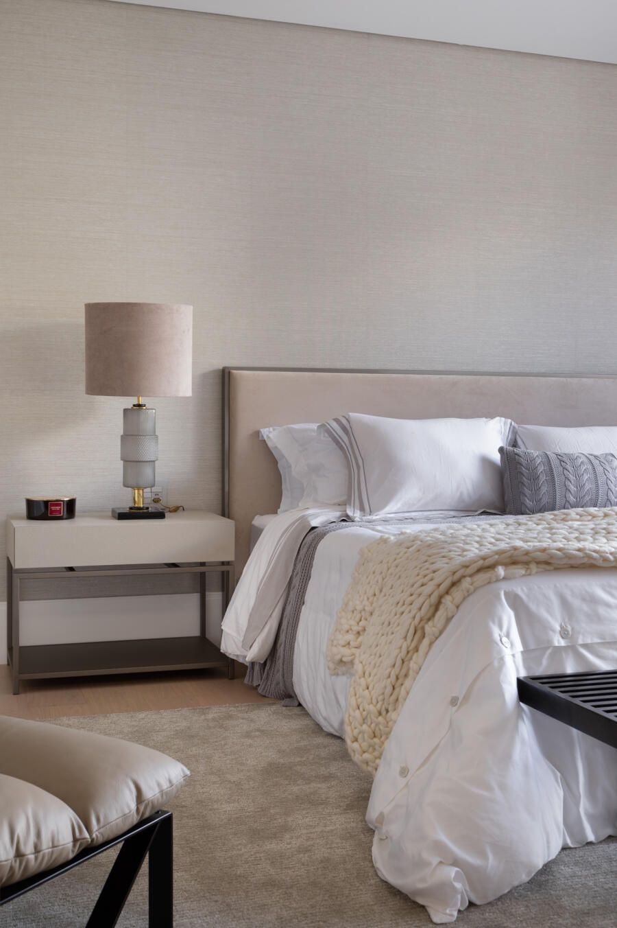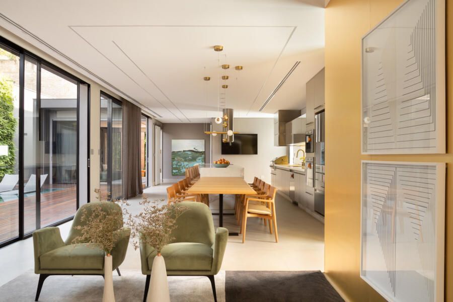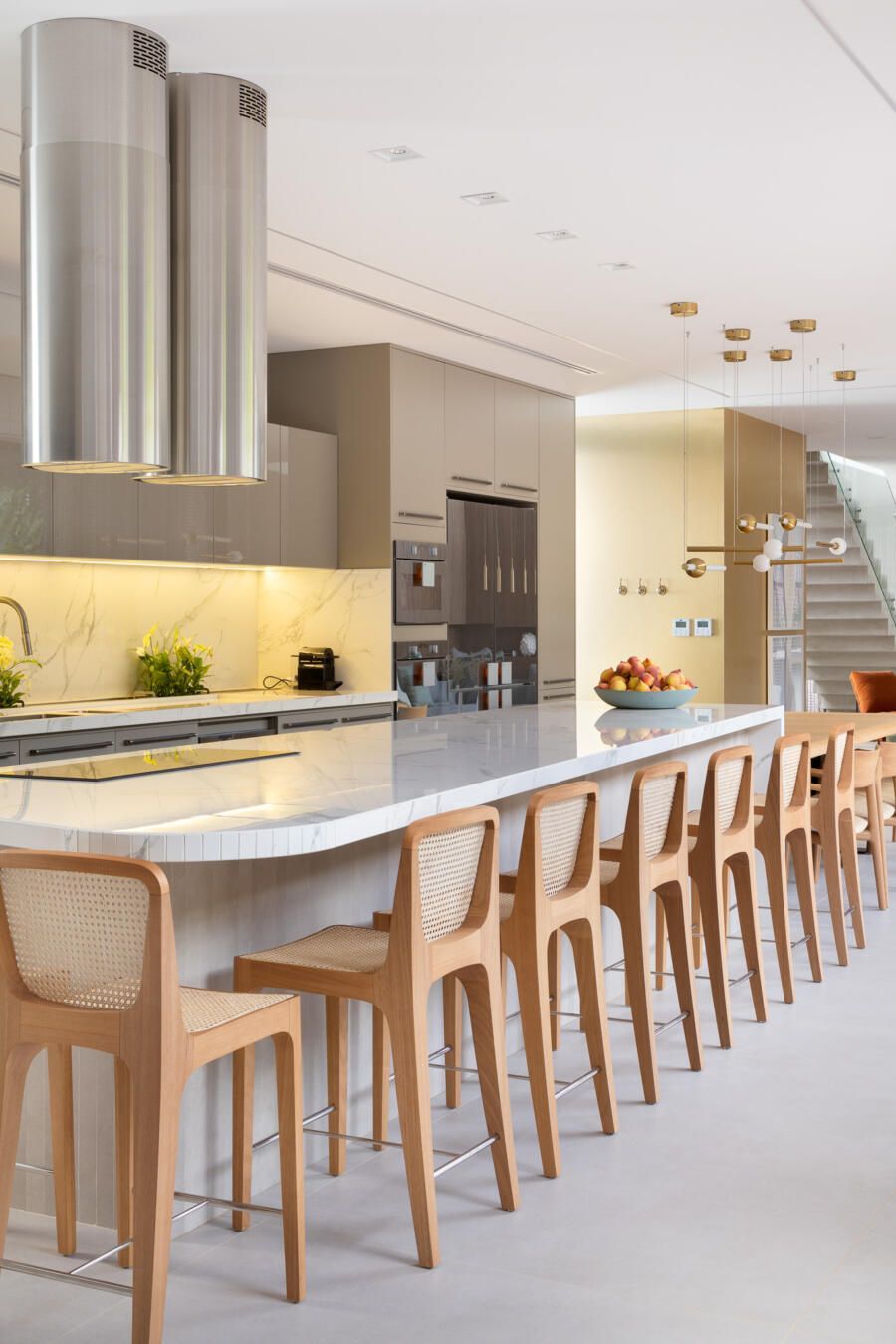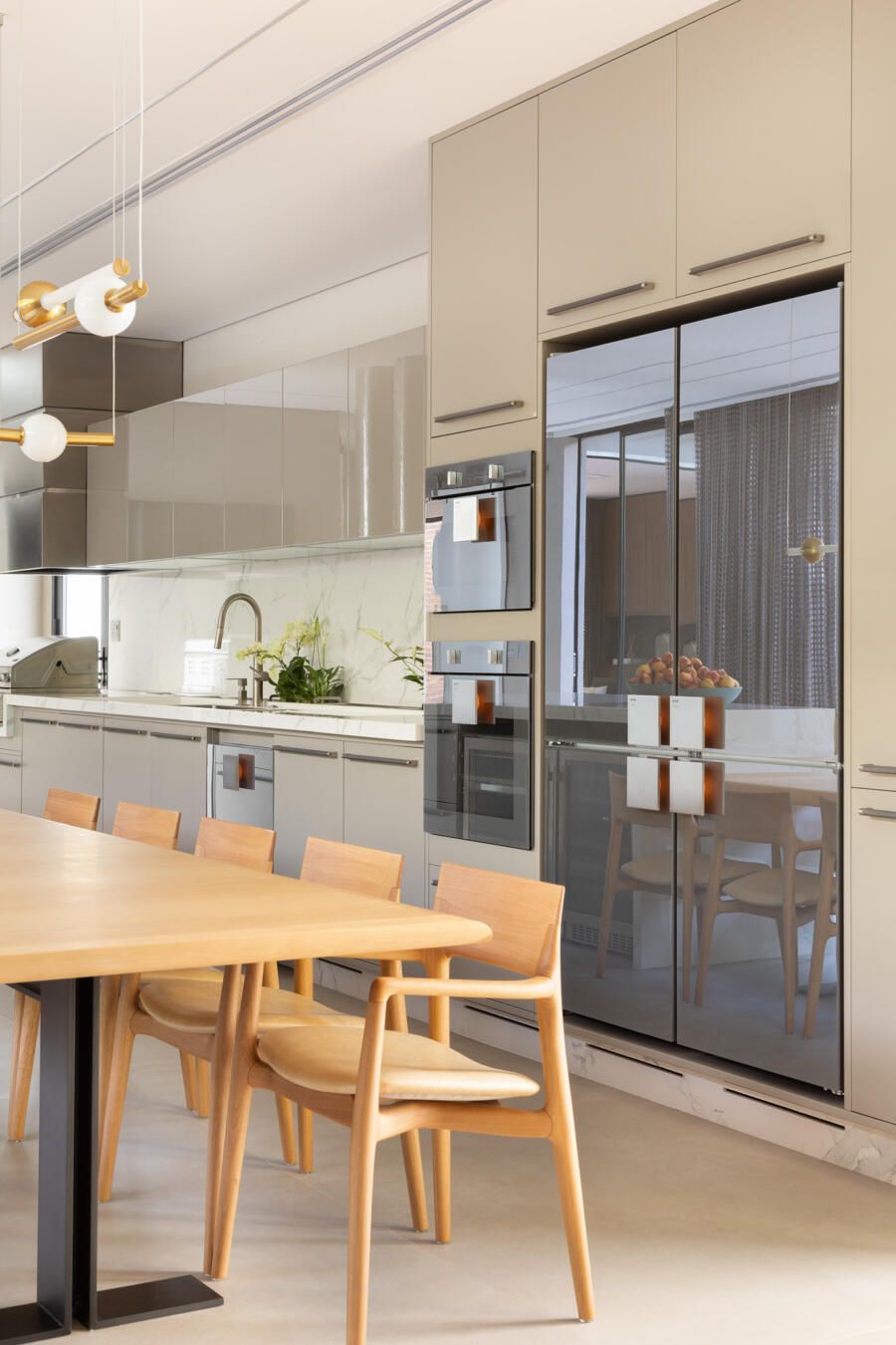 A integração é protagonista no projeto. Apenas a cozinha fica de fora, mas os moradores têm a opção de usar a área gourmet que também é integrada. Ali, todas as peças são do designer Jader Almeida em madeira natural.