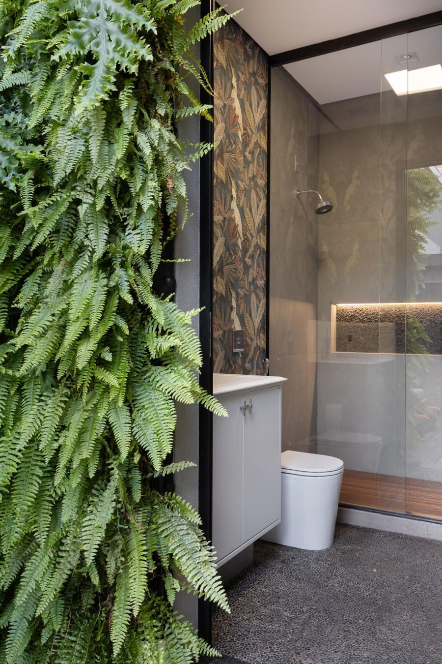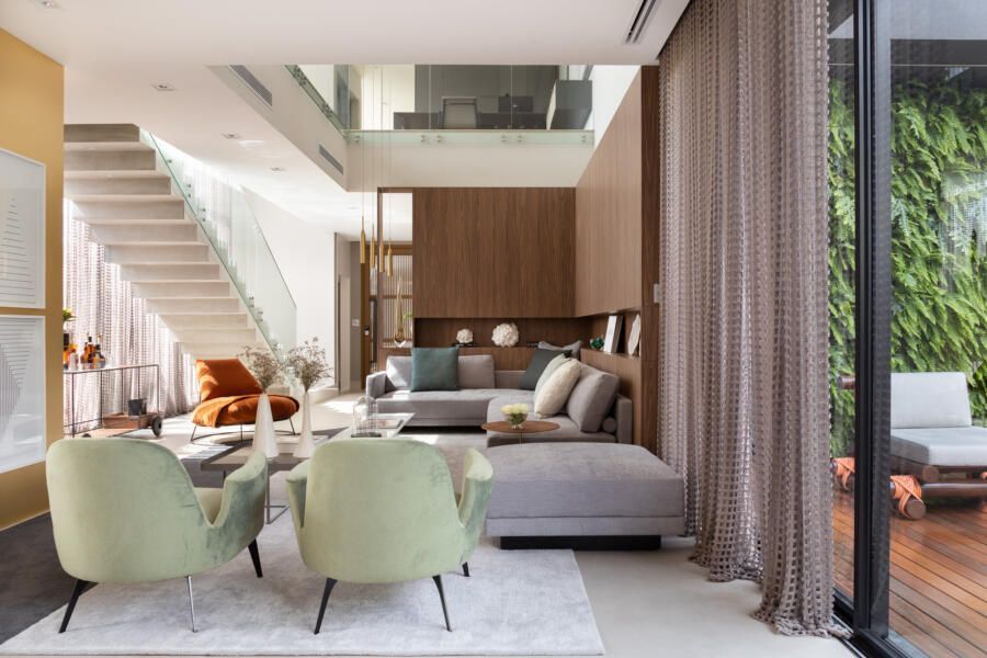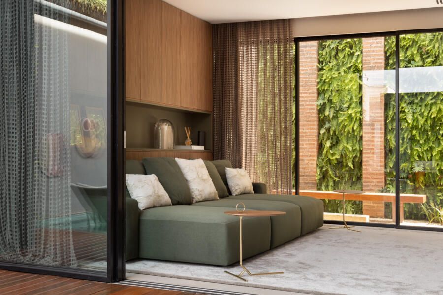 Uma das grandes preocupações do arquiteto durante o projeto foi garantir a privacidade dos moradores ao usarem a área externa, considerando as casas vizinhas do condomínio.