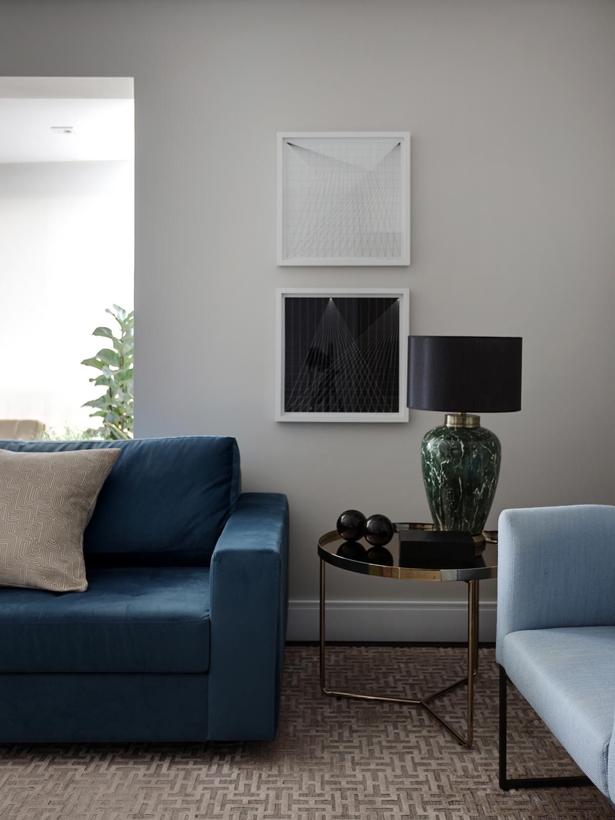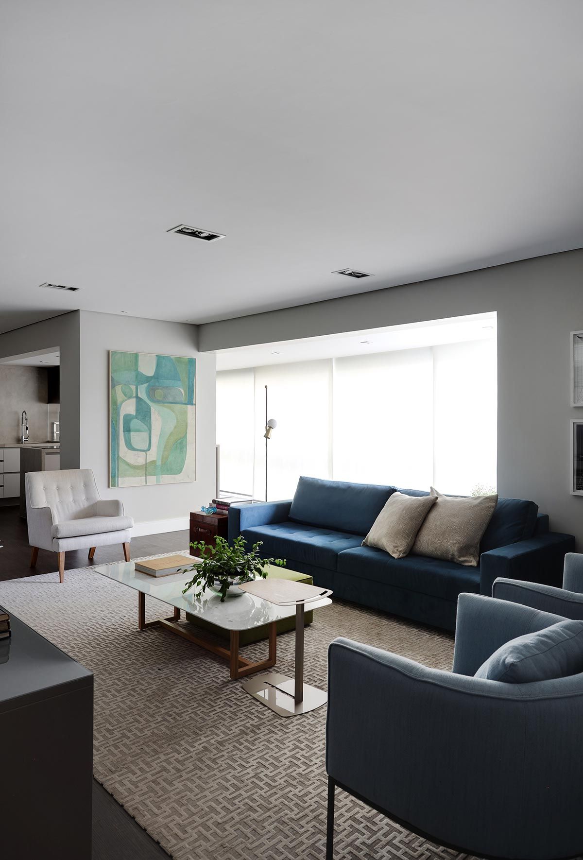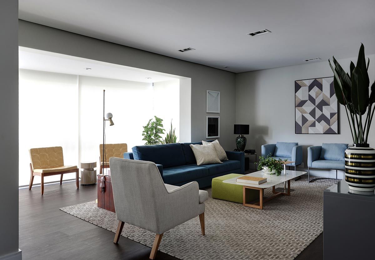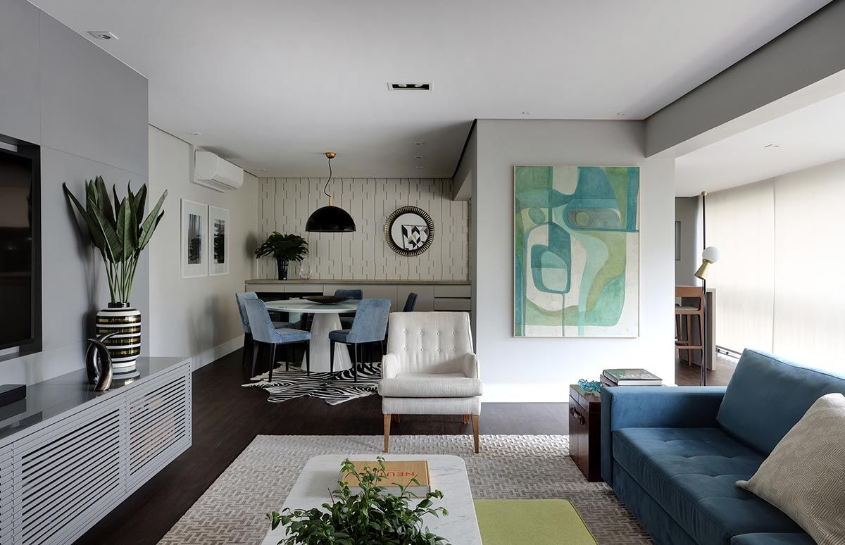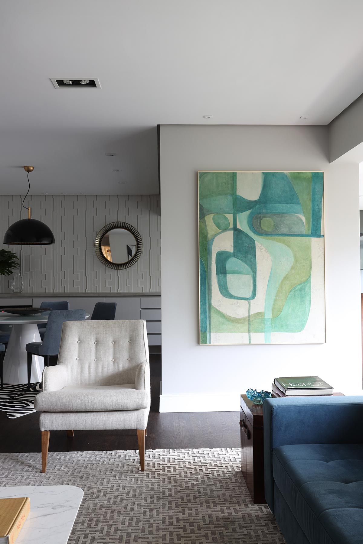 Na coluna de concreto que fica no meio da parte social, o arquiteto sugeriu uma pintura do atelier Adriana & Carlota, inspirada em um painel do Roberto Burle Marxs. Como os clientes gostam de azul, a cor foi aplicada nos tecidos e nas paredes do hall de entrada, que tem ares vintages. Toda a extensão do piso é em vinílico com textura de madeira, para trazer aconchego ao décor e praticidade no dia a dia, já que é bem fácil de limpar.