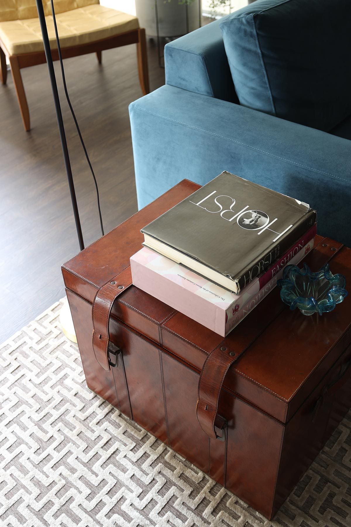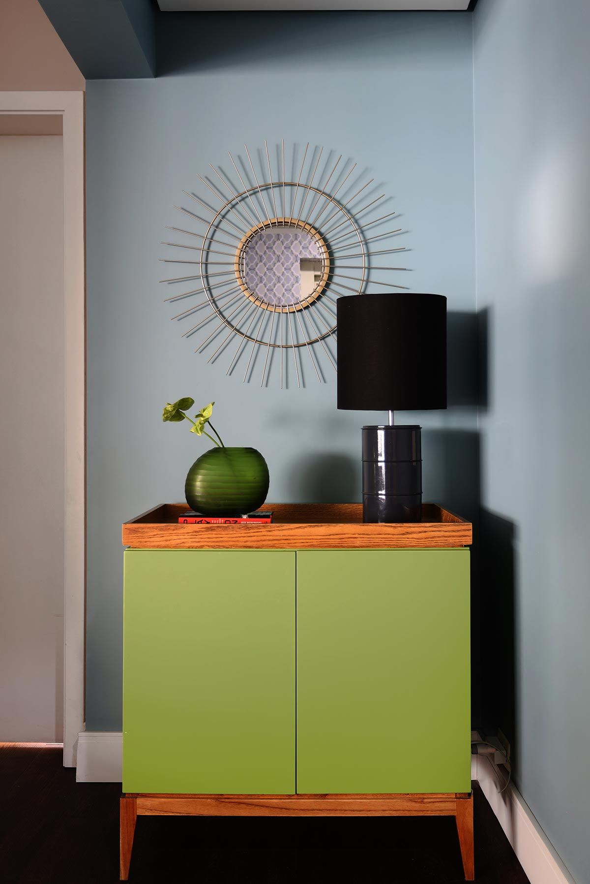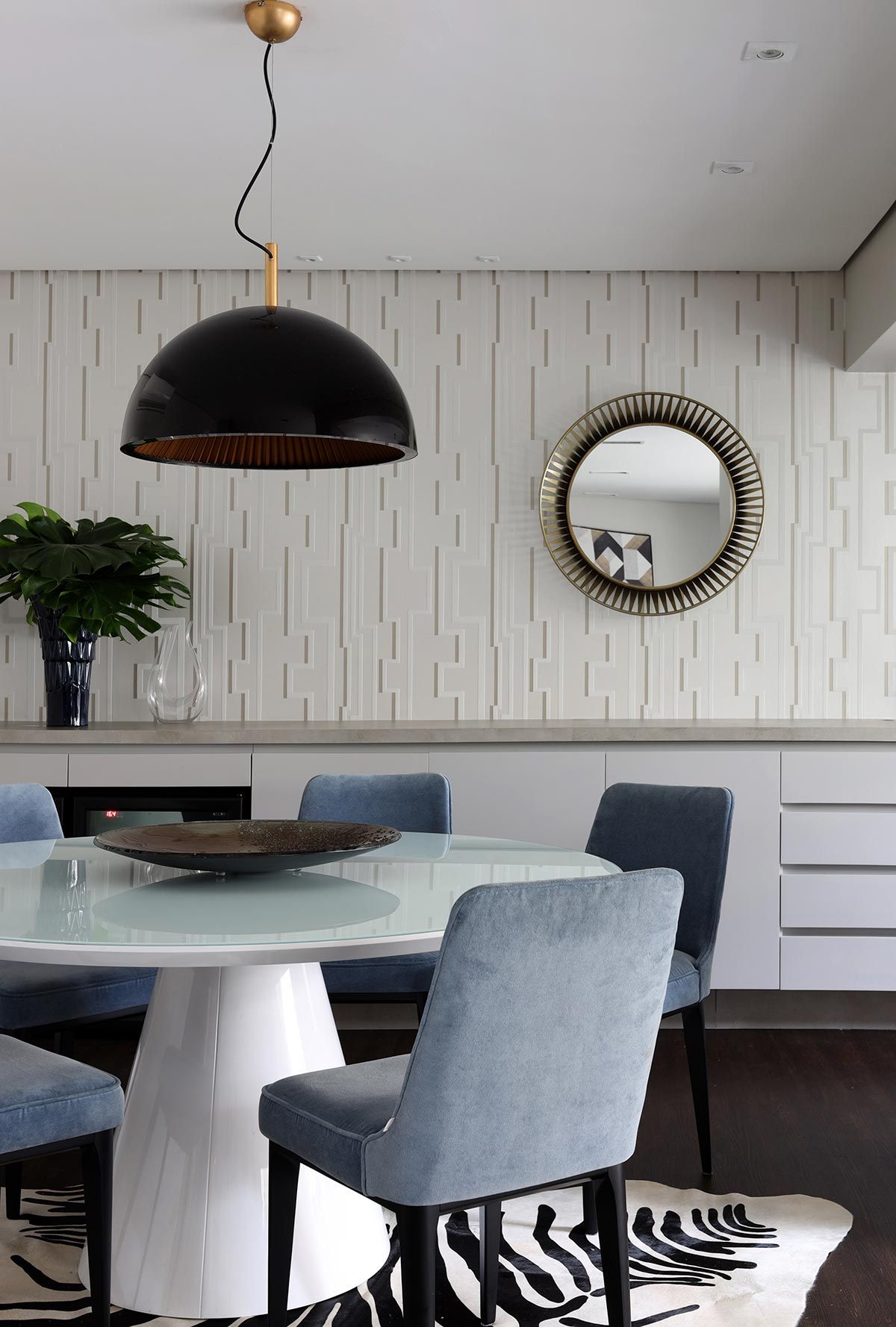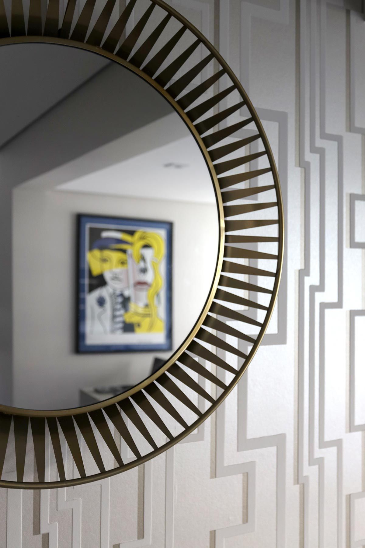 Na coluna de concreto que fica no meio da parte social, o arquiteto sugeriu uma pintura do atelier Adriana & Carlota, inspirada em um painel do Roberto Burle Marxs. Como os clientes gostam de azul, a cor foi aplicada nos tecidos e nas paredes do hall de entrada, que tem ares vintages. Toda a extensão do piso é em vinílico com textura de madeira, para trazer aconchego ao décor e praticidade no dia a dia, já que é bem fácil de limpar.