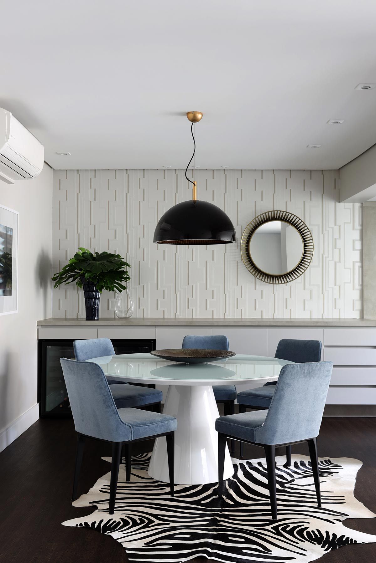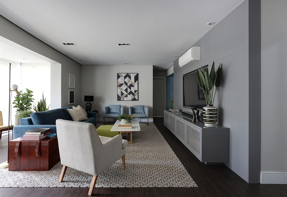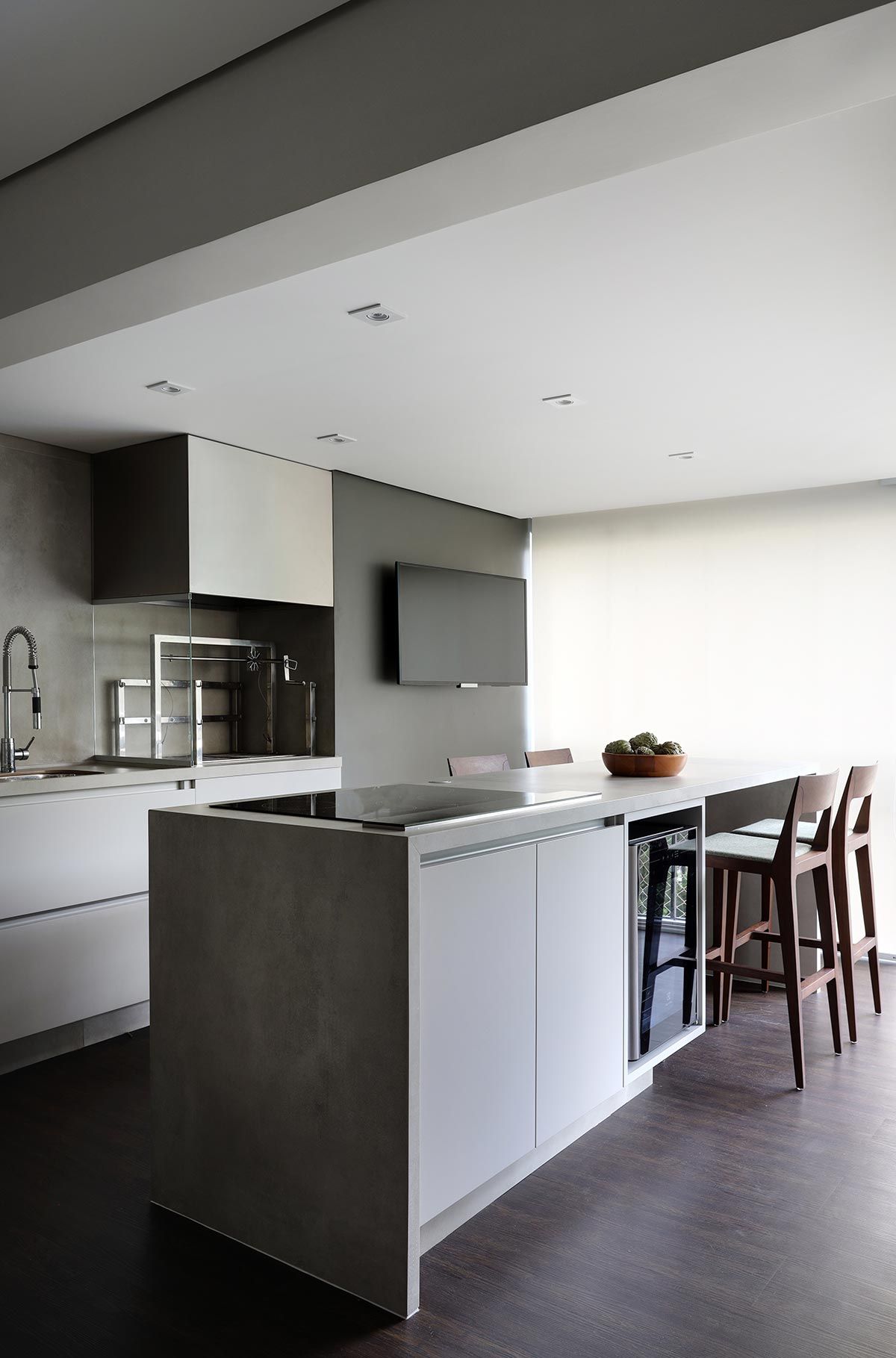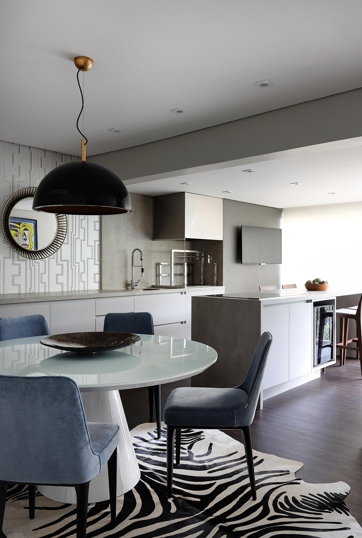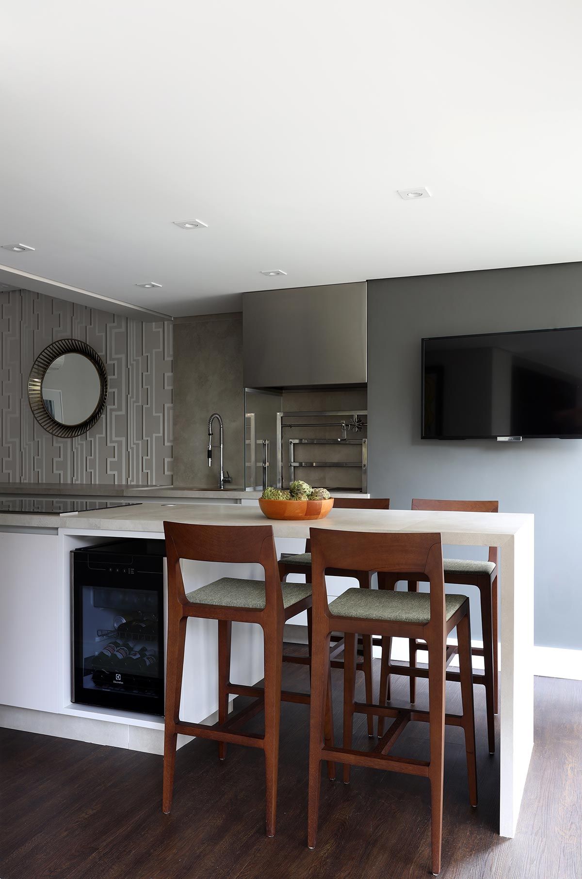 Um casal de médicos com dois filhos adolescentes viviam no apartamento há 10 anos, e já haviam decorado duas vezes a sala antes, mais ainda não estavam satisfeitos. Antes muito colorido, os moradores queriam um décor mais atemporal para não enjoarem, e contaram com o arquiteto Robert Robl para isso. Como ela adora cozinhar, e ele de fazer churrascos, receber amigos e família era pauta obrigatória no novo layout da área social, que foi toda integrada.