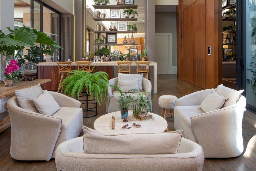 As paredes revestidas de tijolinho e a abundância de plantas na decoração tornam o espaço mais familiar. O visual dialoga com pessoas de todas as idades, conferindo ao espaço uma atmosfera leve e descontraída. Os detalhes do projeto são pensados para que a amplitude da área social e a elegância da decoração não sejam intimidadoras. Afinal, a casa é para ser usufruída, onde todos possam se divertir e viver bons momentos.