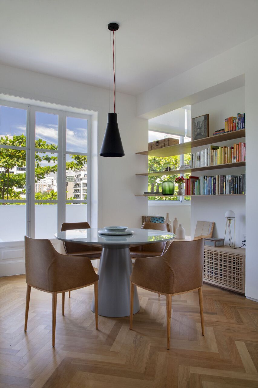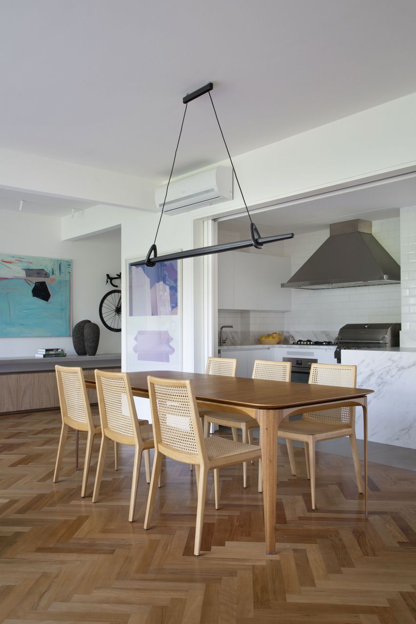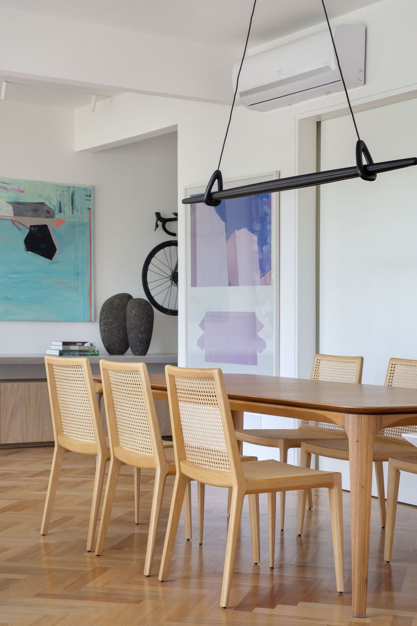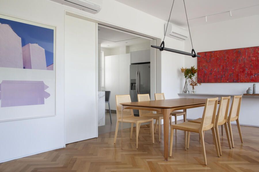 “O principal desafio foi incorporar uma churrasqueira em uma cozinha relativamente compacta, que ainda precisava ser integrada à sala, mas com a possibilidade de fechamento quando necessário. Além disso, a reforma exigiu uma reconfiguração completa da planta de um apartamento antigo, conciliando as demandas contemporâneas dos moradores com a preservação de elementos originais, como o pé-direito alto e a leitura estrutural das vigas aparentes.”