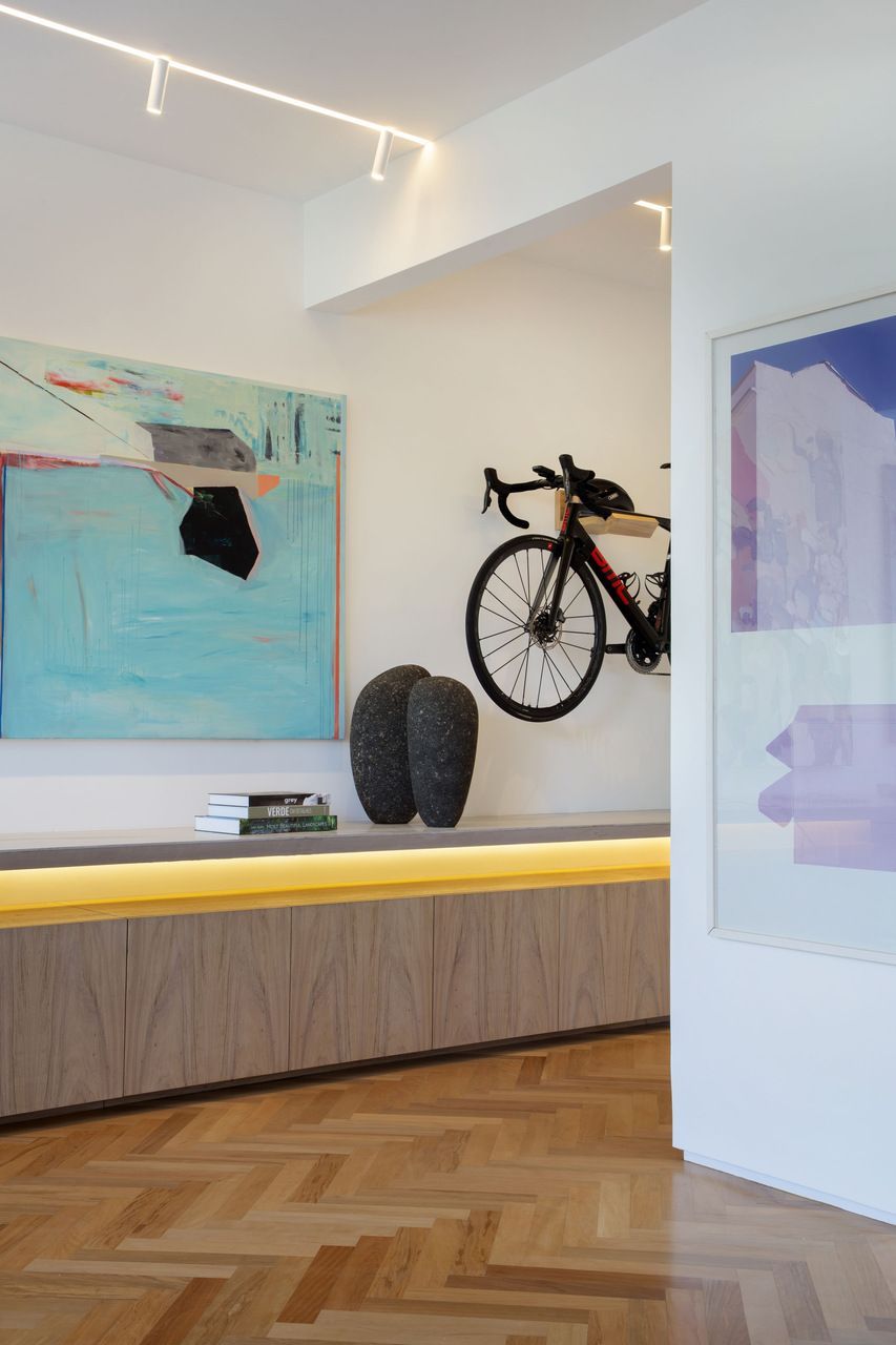 Na decoração, a escolha foi por uma base neutra, com influências escandinavas, que privilegia a luz natural e a leveza visual. Poucos móveis, bem selecionados, organizam os ambientes com elegância discreta, enquanto a iluminação, pensada com o olhar técnico dos moradores, aposta em soluções limpas e eficientes, com uso frequente de fitas de LED. As cores mais vibrantes aparecem nas obras de arte, que ocupam um lugar central na narrativa do apartamento. Com um acervo construído ao longo dos anos, incluindo nomes como Guilherme Dable, Arthur Arnold, Bruno Vilela e Geraldo Marcolini, o casal encontrou no projeto o cenário ideal para expor suas peças. Como resume a moradora:
