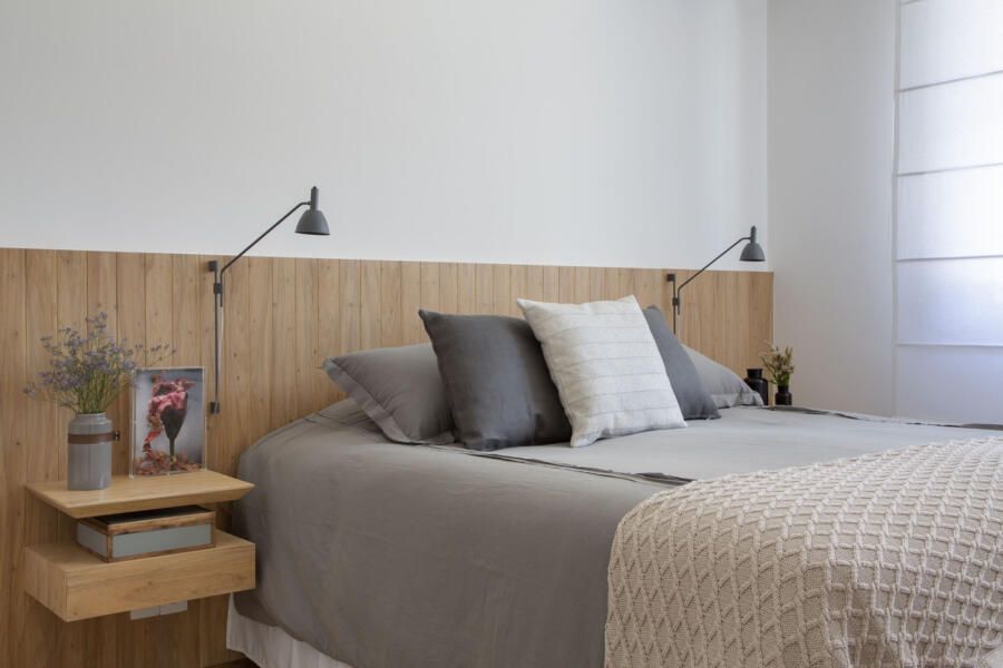 A reconfiguração da planta foi essencial para viabilizar essas mudanças. A área de serviço e os antigos dormitórios foram reorganizados para dar origem a uma suíte mais ampla, agora com closet, além de um quarto de hóspedes e um escritório. O resultado é um layout que valoriza a convivência sem abrir mão da privacidade, refletindo o estilo de vida de um casal que também compartilha a rotina profissional.