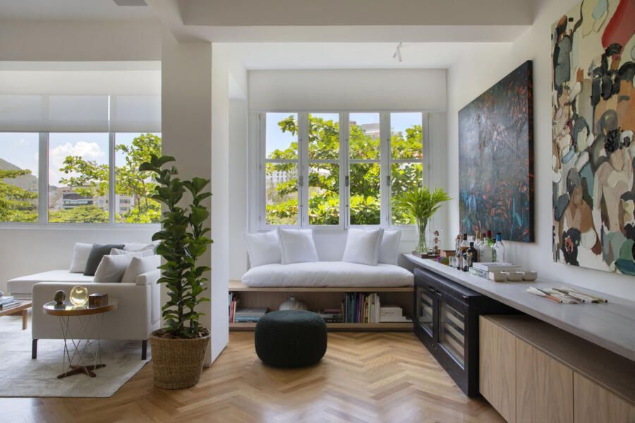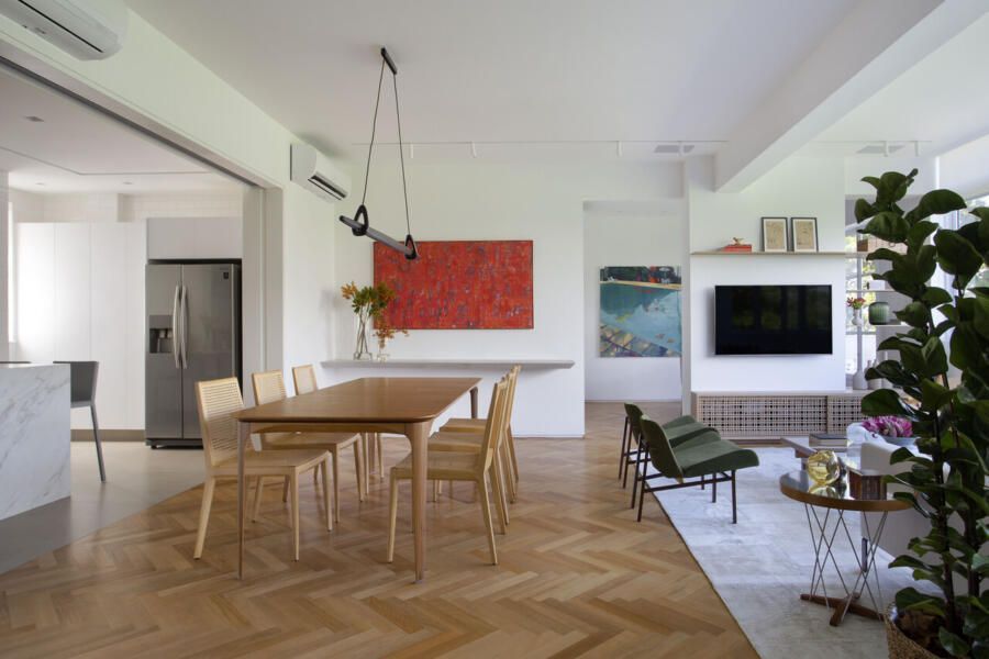 Mesmo com tantas alterações, o projeto respeita e valoriza a arquitetura original do edifício. As vigas aparentes foram mantidas e incorporadas à estética do apartamento, assim como o pé-direito alto, que contribui para a sensação de amplitude. O piso em taco, já comprometido, foi substituído por um novo, da Parquet Nobre, seguindo a mesma paginação em chevron, preservando a memória do espaço com um olhar contemporâneo.