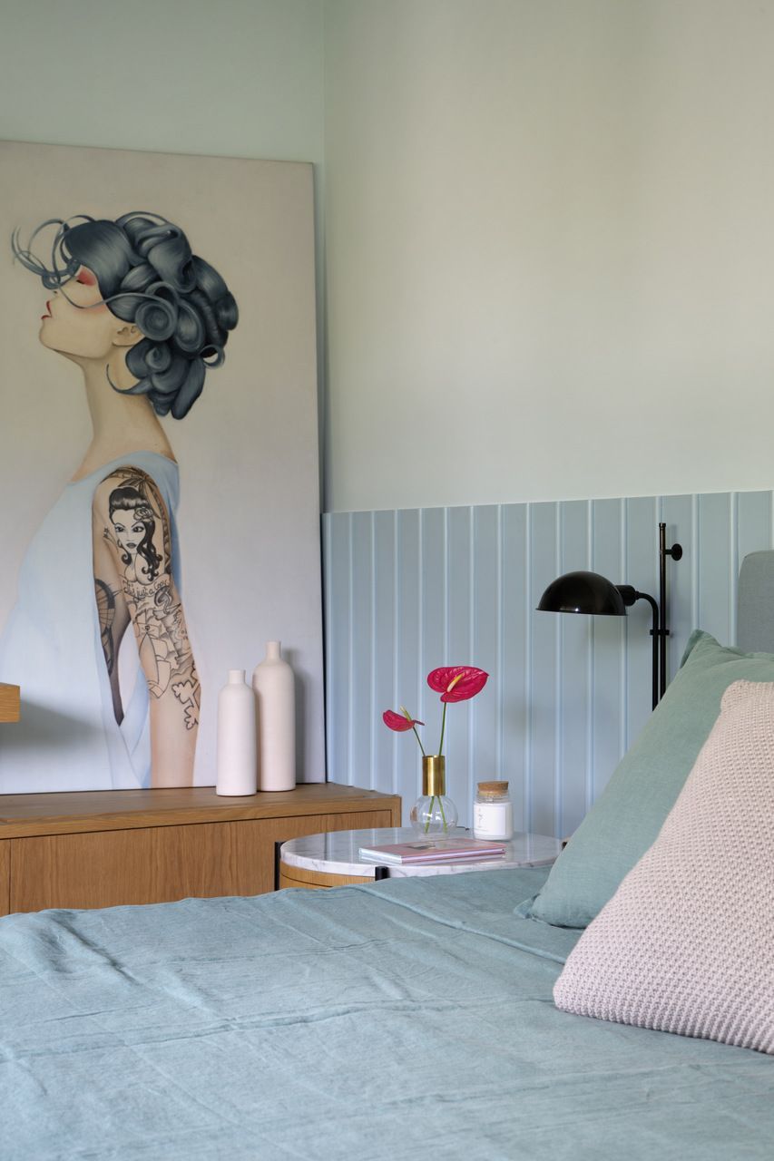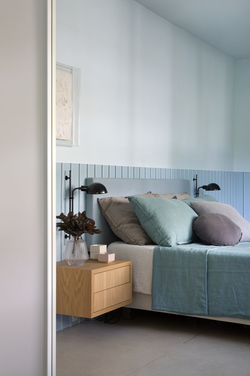 “Essa solução criou uma unidade visual no espaço, ajudando a suavizar a angulação das paredes fora de esquadro que incomodava a cliente. Como o quarto já era bem iluminado, para deixar o ambiente mais moderno e com um toque divertido, pintamos as paredes e o teto na mesma cor do painel ripado, só que num tom mais claro. O resultado final ficou bem relaxante.”