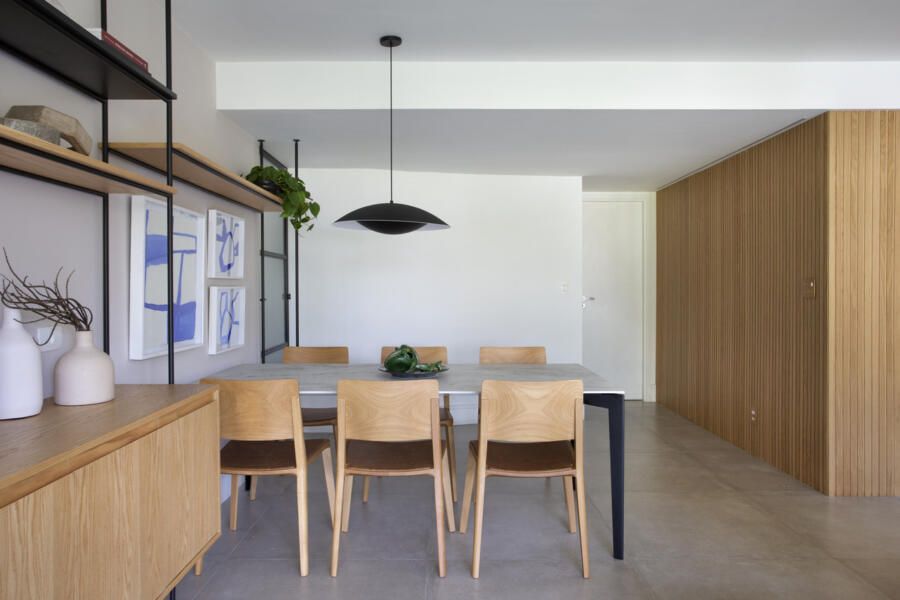 “Para aquecer o ambiente, tornando-o mais acolhedor, forramos o bloco de paredes da sala que delimitam o lavabo com painéis de carvalho natural ripado, contrapondo com alguns itens em serralheria preta para imprimir um toque mais urbano e sofisticado.”