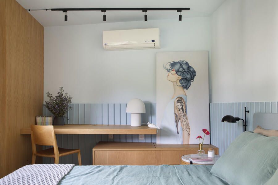 Já no quarto de casal, o painel ripado da cabeceira em tom acizentado continua na parede perpendicular, onde foram instalados a bancada de trabalho e o armário baixo para roupas de cama.