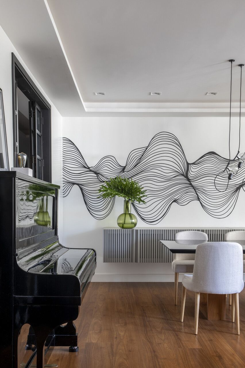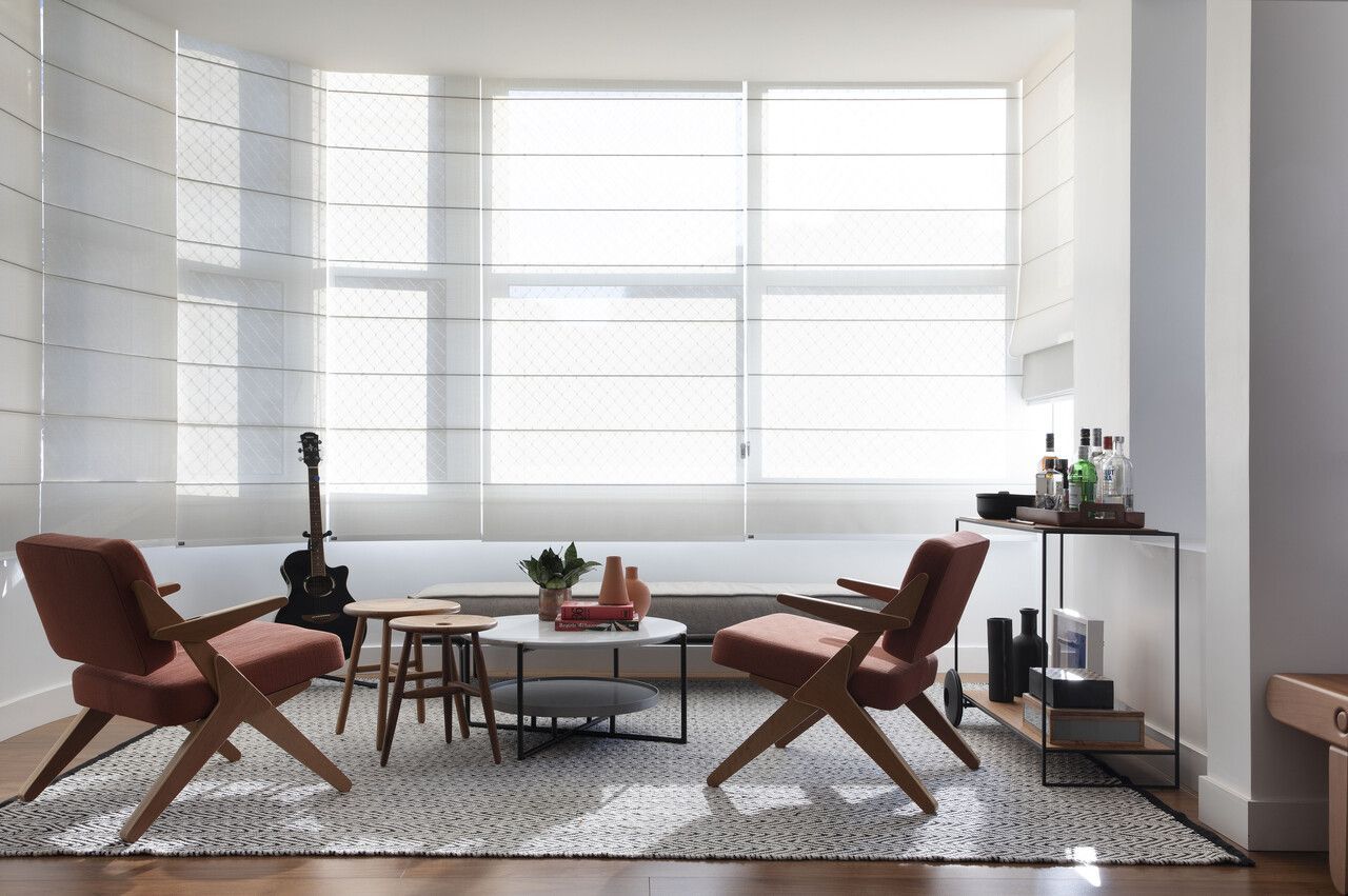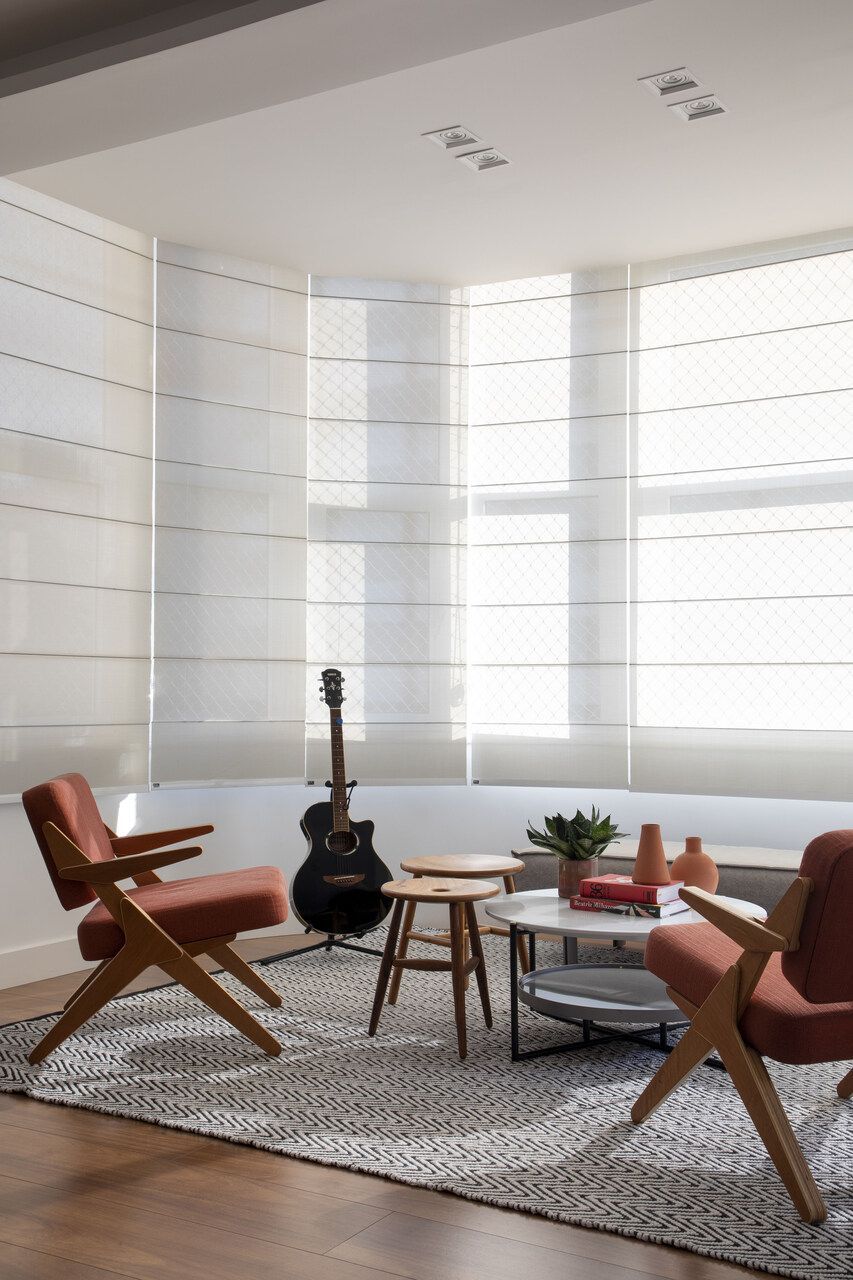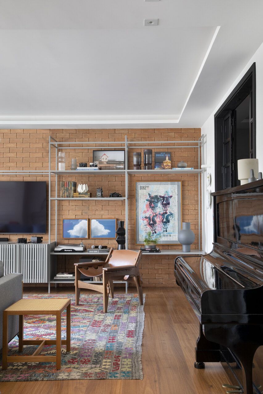 Na decoração, no geral, a arquiteta adotou uma paleta cromática com base neutra e sóbria e pontuou com cores no tapete, em alguns quadros da estante e nas poltronas do lounge, estofadas com tecido em tom terracota. No quesito mobiliário, com exceção do piano e da mesa de jantar, que vieram do endereço anterior da família, todas as peças são novas.