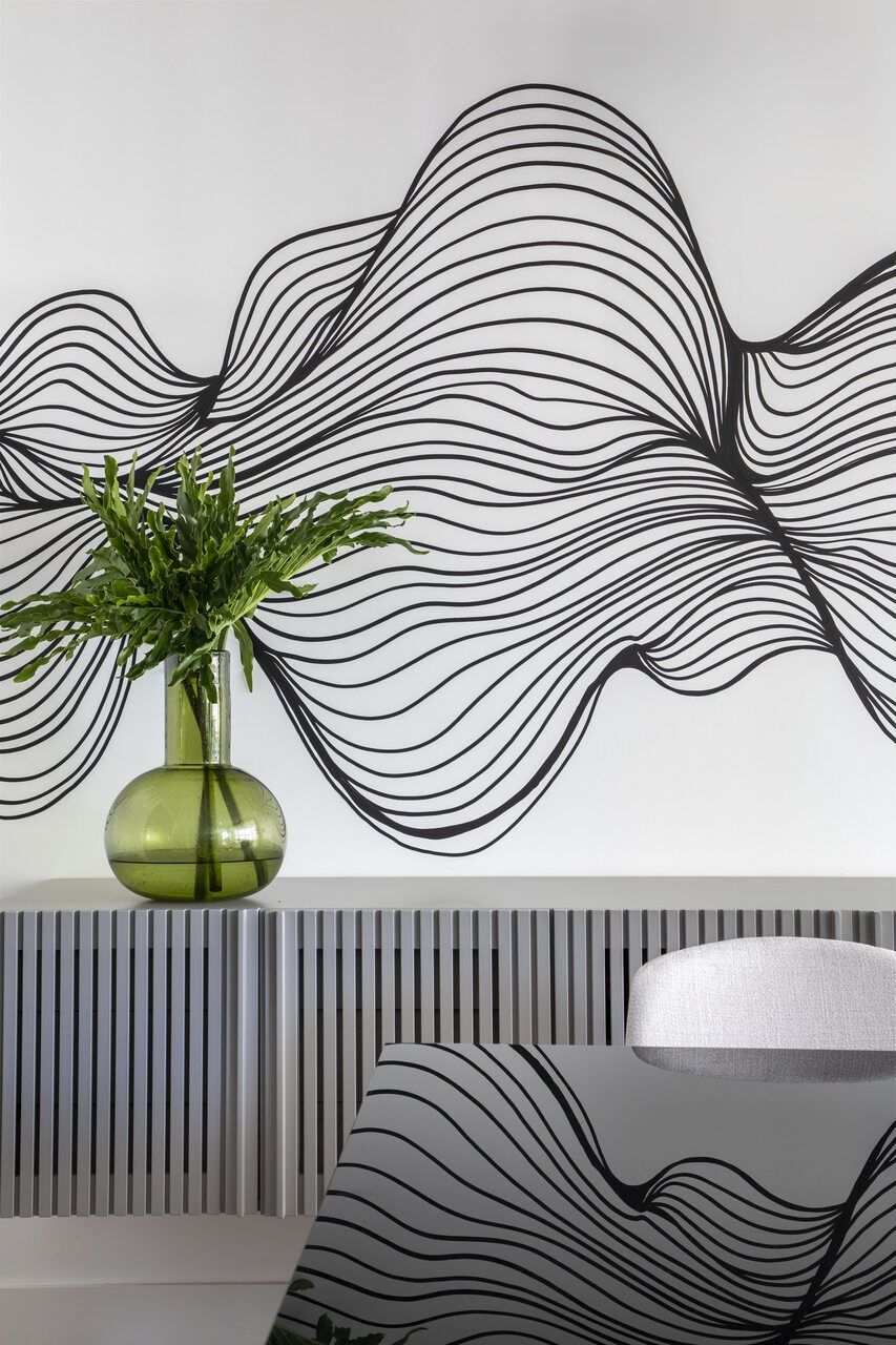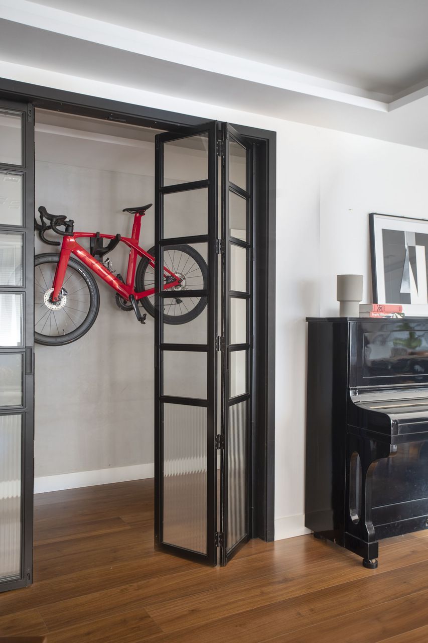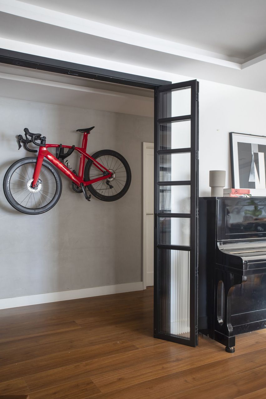 No acesso à área social, Bezamat instalou portas metálicas pretas, com sistema de abertura tipo camarão, que agora permitem isolar o setor social do restante do apartamento, quando necessário. Além disso, este recurso também deu origem a um hall de entrada mais amplo, onde foi fixado um suporte de parede para apoiar a bicicleta da cliente, que pratica ciclismo nas horas vagas.