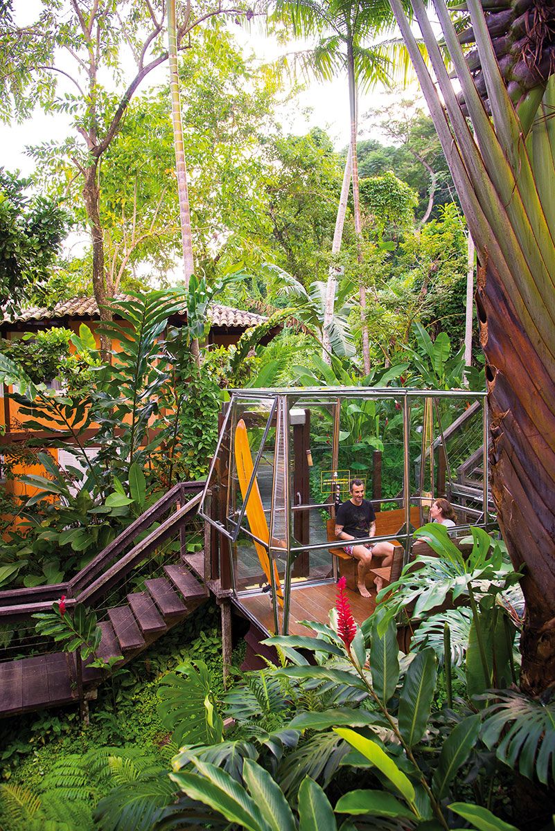 O acesso à morada é feito por um charmoso bondinho envidraçado e reforça o pedido do cliente por uma casa leve, limpa e contemporânea.