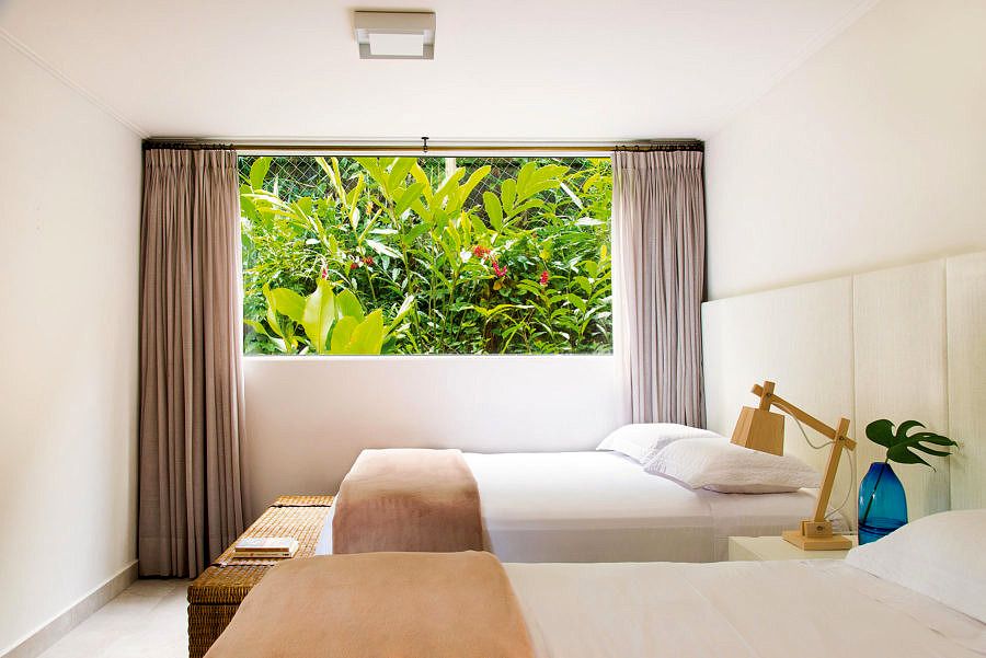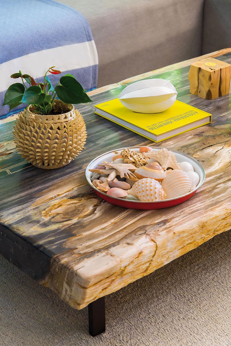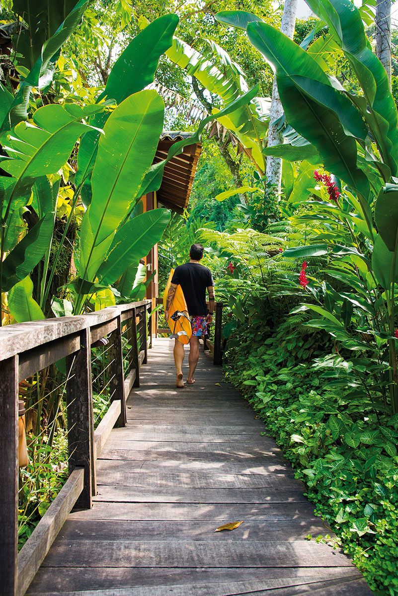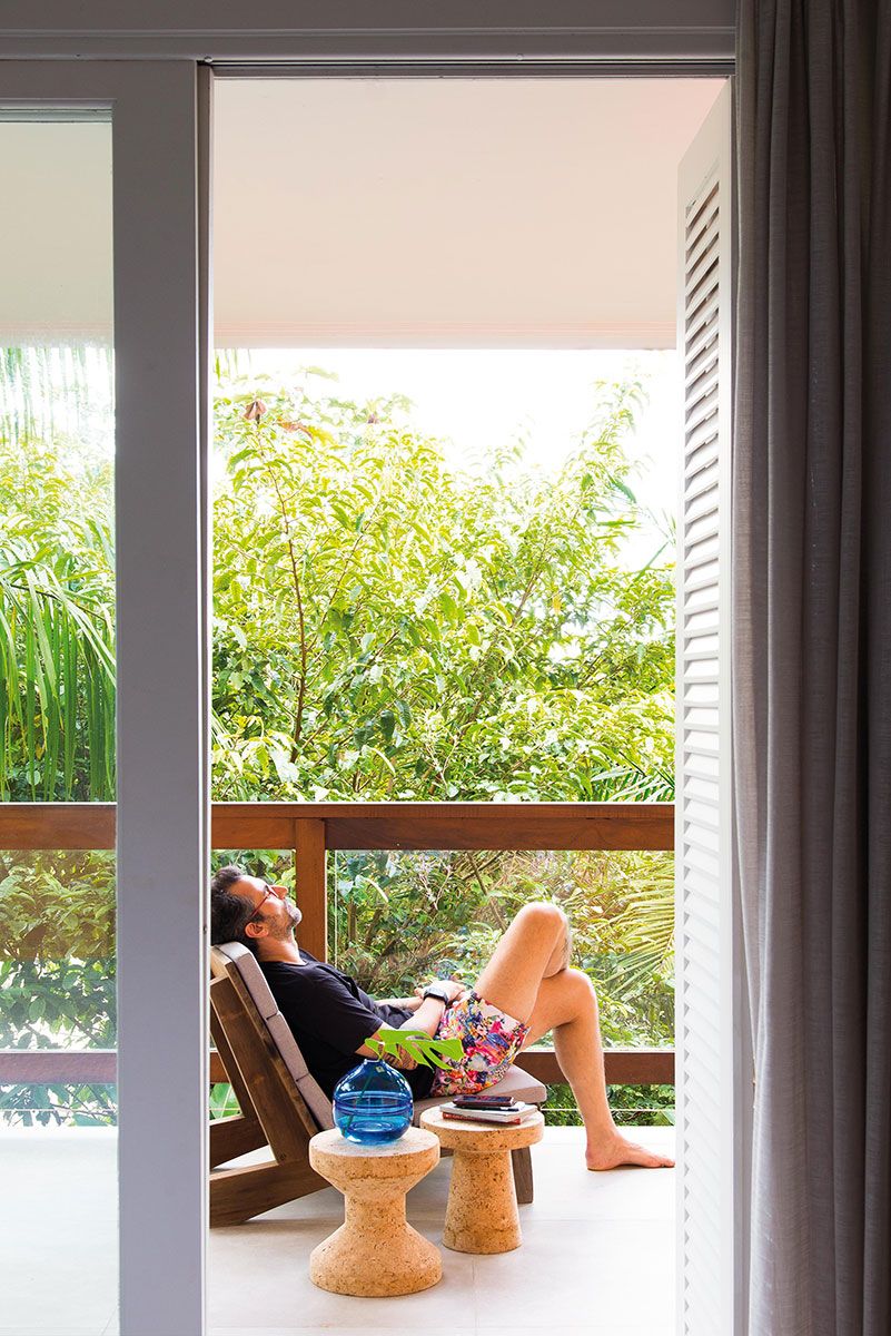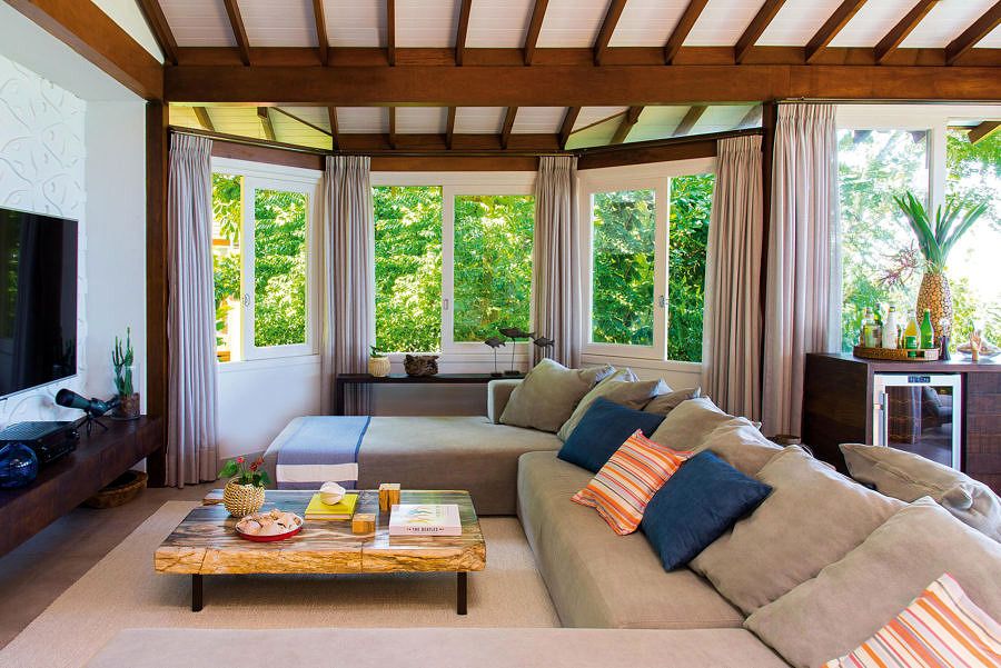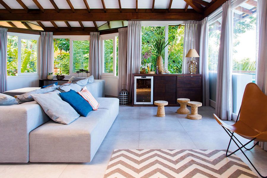 Para integrar o lado de dentro à exuberante natureza de fora, a solução foi um piso cimentício claro e de aspecto natural em todos os ambientes. A ideia de continuidade está presente também no living, por meio de um mobiliário que parece brotar do chão, como o grande sofá de lona cinza.