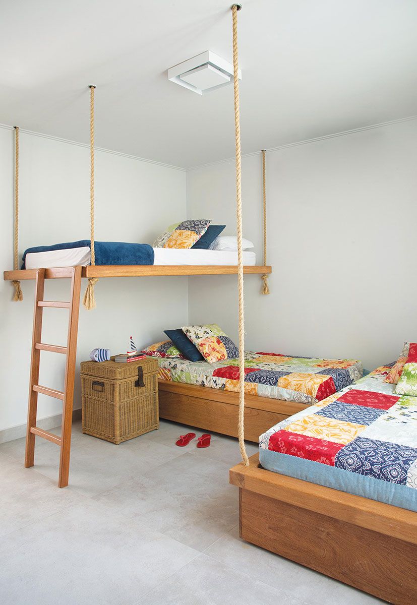 A mesma decoração de base neutra, com bastante madeira, também se encontra nos quartos, complementados por peças revestidas de material sintético, que trazem o conforto visual da palha.