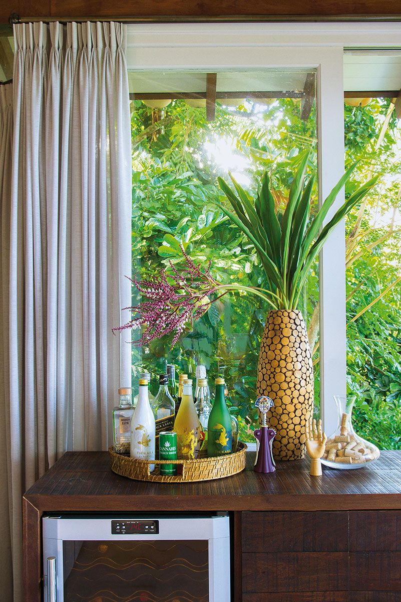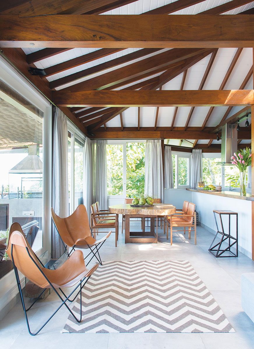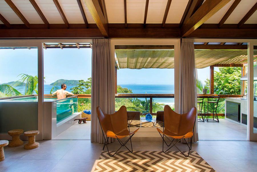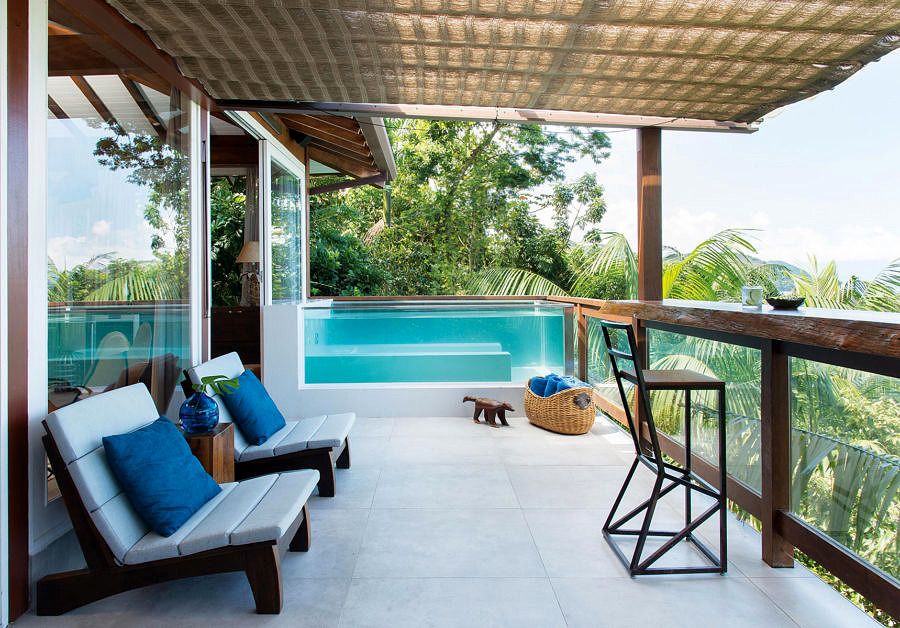 Na varanda, a piscina com três laterais de vidro colabora para a permeabilidade visual da morada e se mistura à Mata Atlântica, assim como a cobertura retrátil combinada à palha sintética sobre a varanda gourmet.