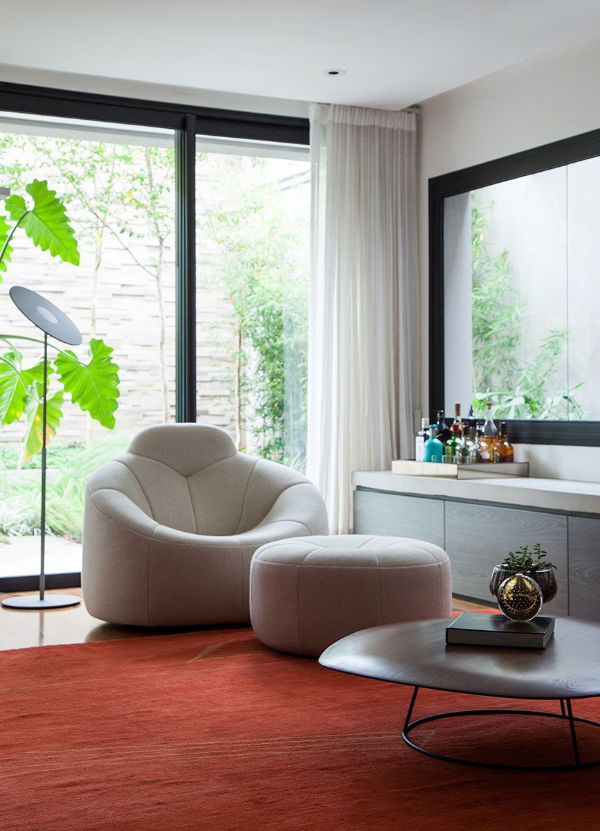 Os moradores, que já tiveram outro imóvel projetado pela arquiteta, são abertos a inovações, valorizam o design e gostam do contraste de cores e texturas. O jardim, antes muito pequeno, hoje envolve o living começando pela lateral da casa e estendendo-se pelas paredes dos fundos em um jardim vertical, trazendo o verde para dentro da residência.