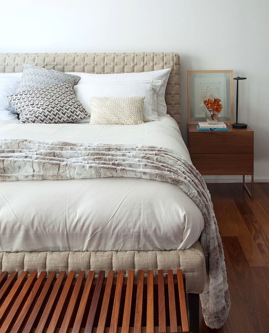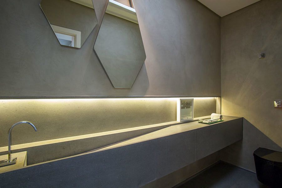 A suíte máster foi privilegiada com a abertura de uma grande janela que trouxe luz natural e amplitude ao ambiente. Ao entrar no banheiro do casal duas bancadas se estendem nas laterais, de um lado a bancada em Corian branco com lavatório esculpido e do outro uma ampla bancada de maquiagem para ela. Ao fundo, as paredes em mármore separam as áreas da ducha e da bacia que compõem harmonicamente com o piso em porcelanato.