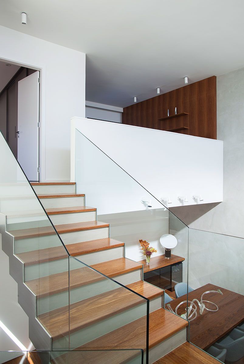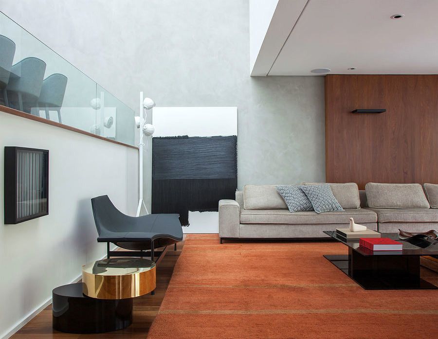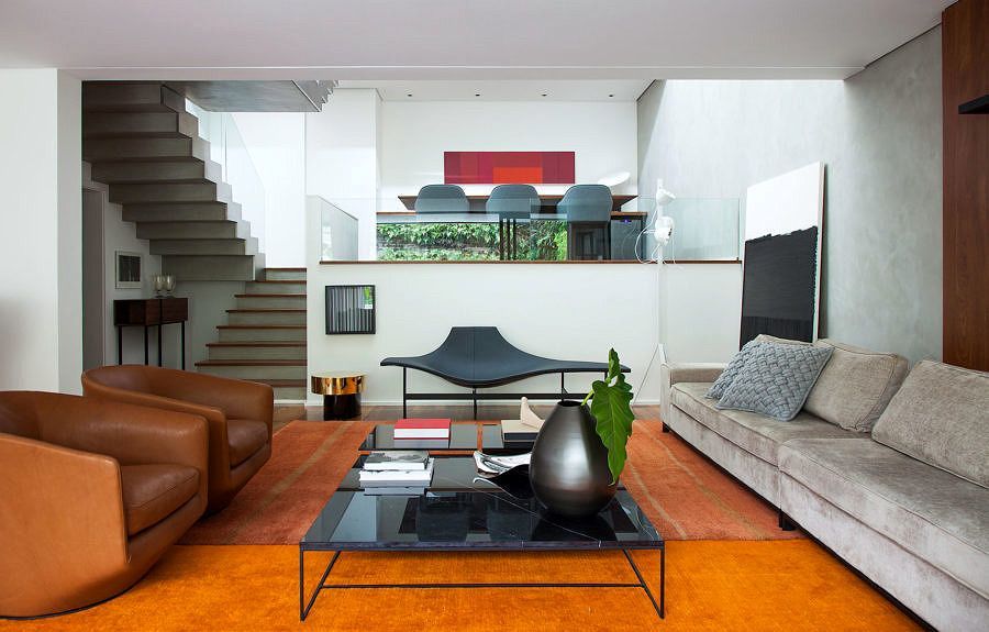 O grande painel de cumaru percorre o living até a área externa, garantindo a integração do ambiente ao espaço gourmet e valorizando ainda mais o paisagismo, criado por Alex Hanazaki. Outros destaques do projeto são o piso cimentício em formato de réguas e o banco de concreto que acompanha toda a extensão do jardim vertical, criando um ambiente simples e elegante. A conexão entre o living, a sala de jantar em desnível e o segundo pavimento fica a cargo da nova escada com pisadas em concreto aparente e guarda corpo em vidro, que dá leveza e transparência aos ambientes.