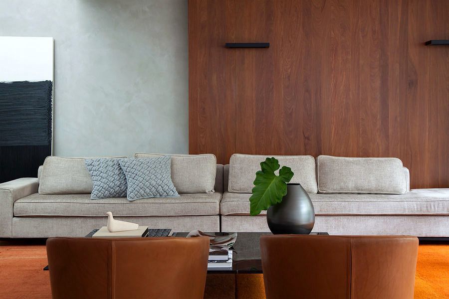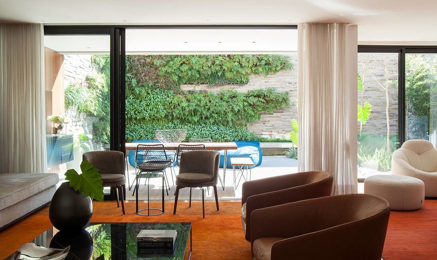 Os moradores, que já tiveram outro imóvel projetado pela arquiteta, são abertos a inovações, valorizam o design e gostam do contraste de cores e texturas. O jardim, antes muito pequeno, hoje envolve o living começando pela lateral da casa e estendendo-se pelas paredes dos fundos em um jardim vertical, trazendo o verde para dentro da residência.