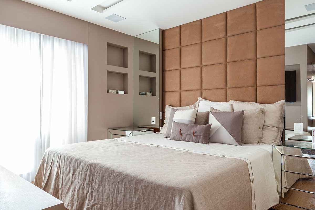 O sofá verde clarinho e com pés palito traz um toque de delicadeza ao ambiente neutro. Já ao fundo, a parede foi revestida com um painel de couro proporcionando a sensação de conforto e acolhimento.