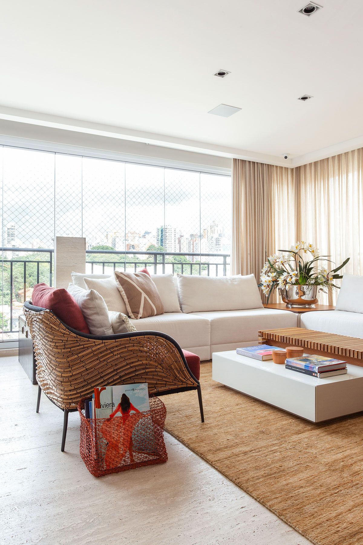 Para que o layout fosse totalmente aberto e integrado, as arquitetas retiraram a porta de correr da varanda. E como não conseguiriam esconder a viga, resolverem assumi-la e dividiram as duas salas com um banco.