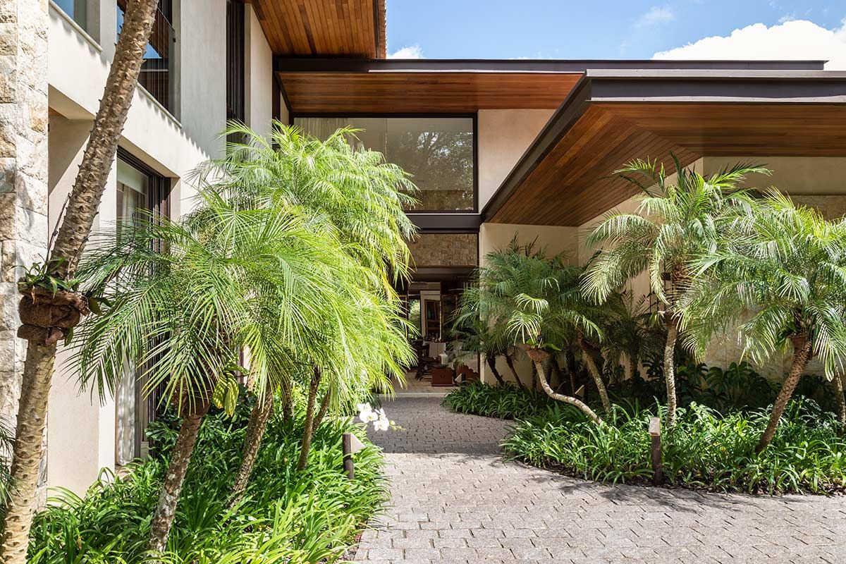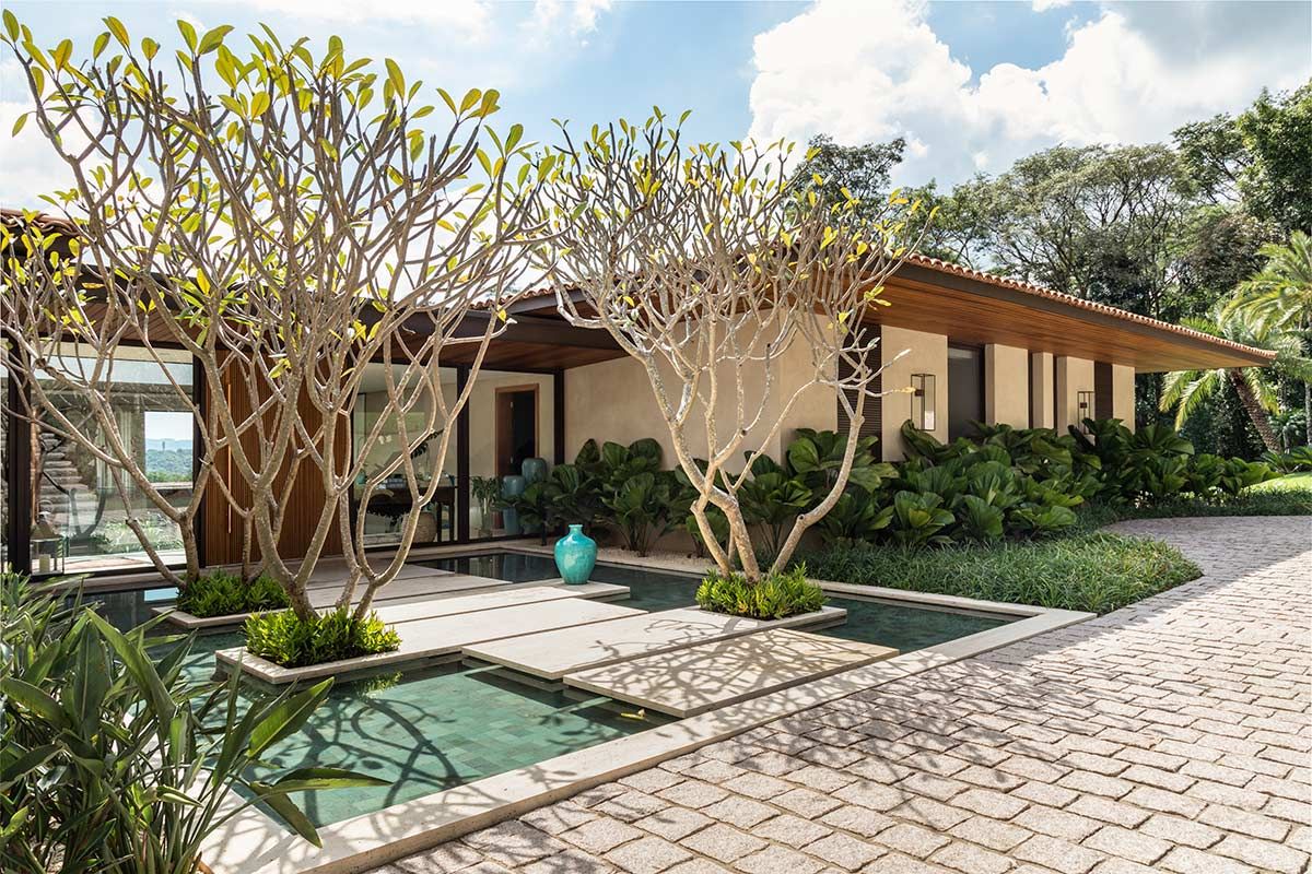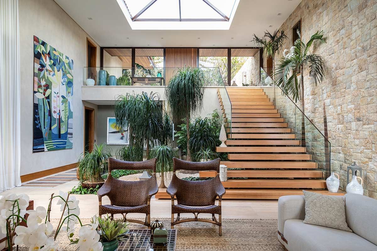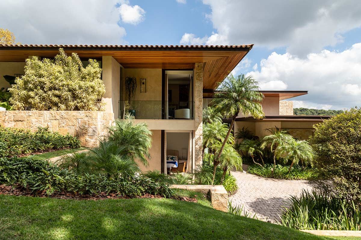 Este terreno tinha duas características marcantes que eram também as suas maiores qualidades: a vista e toda lateral para uma reserva de mata fechada. Para manter o visual, a implantação foi feita no sentido de amenizar a inclinação e valorizar esses pontos fortes, e o paisagismo do Alex Hanazaki completou muito a arquitetura, criando uma integração com o vale e trazendo o verde para dentro de casa, como é o caso do jardim que envolve a escadaria da entrada.