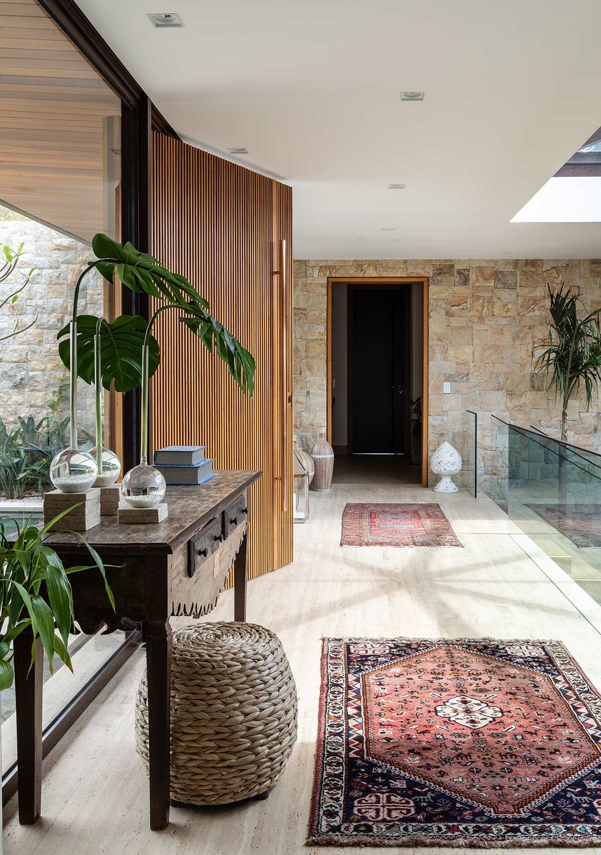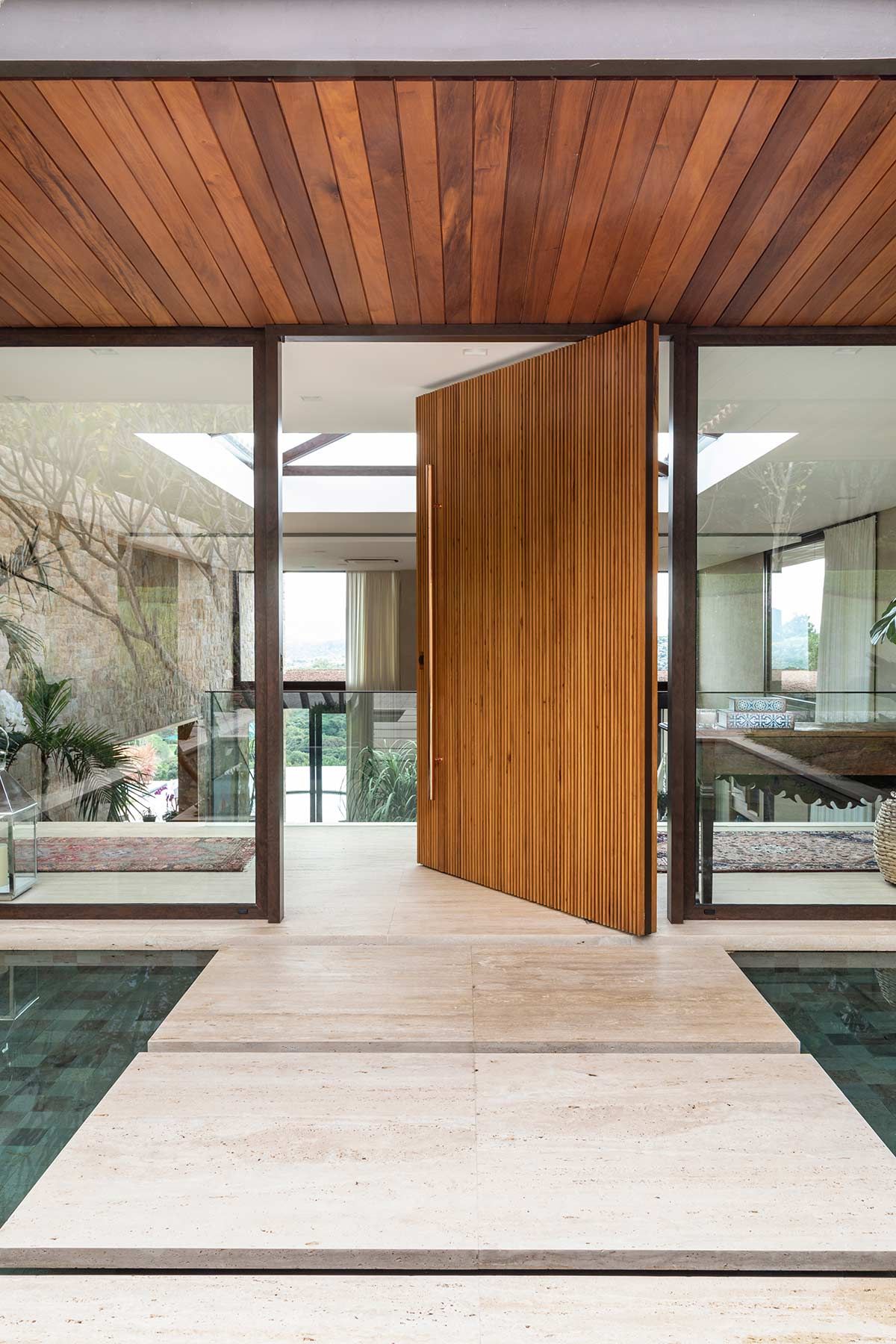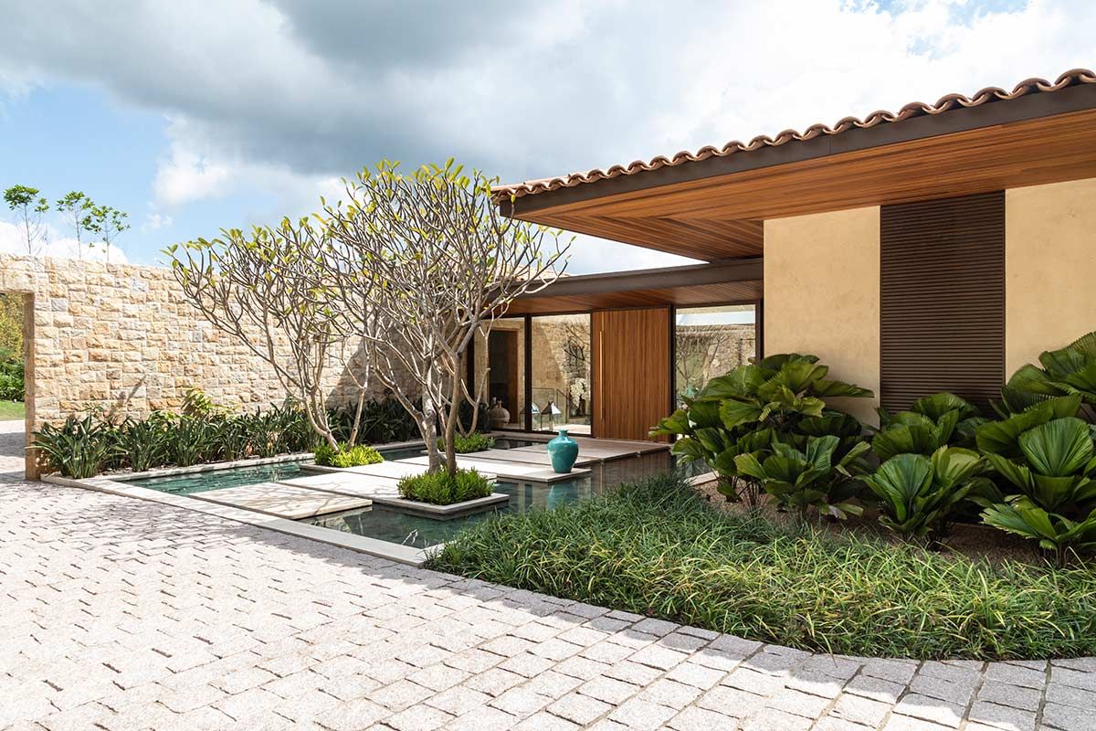 Este terreno tinha duas características marcantes que eram também as suas maiores qualidades: a vista e toda lateral para uma reserva de mata fechada. Para manter o visual, a implantação foi feita no sentido de amenizar a inclinação e valorizar esses pontos fortes, e o paisagismo do Alex Hanazaki completou muito a arquitetura, criando uma integração com o vale e trazendo o verde para dentro de casa, como é o caso do jardim que envolve a escadaria da entrada.