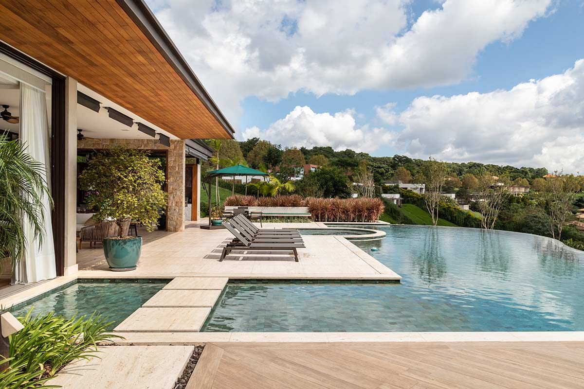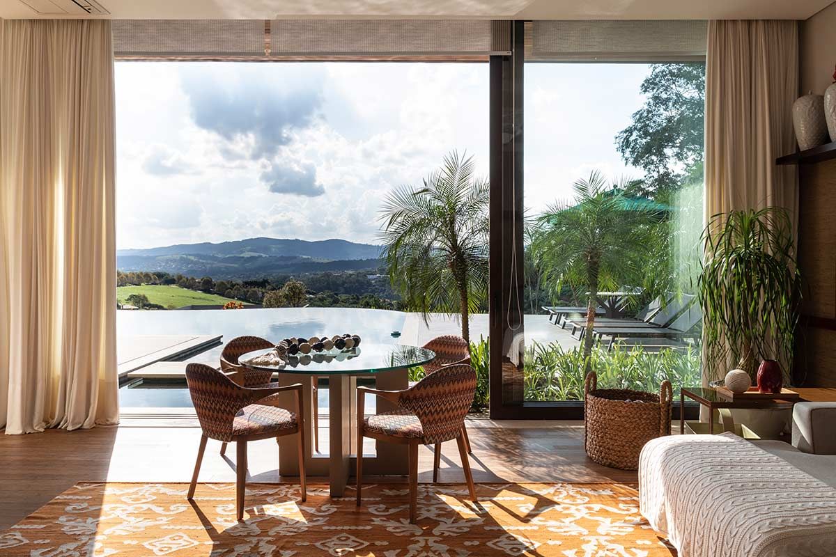Como a ideia era uma casa sem muitos níveis, optou-se por colocar os quartos no piso da entrada e, no pavimento abaixo, a área social e de lazer. Através das aberturas de vidro, do hall é possível enxergar o jardim, a piscina com borda irregular e infinita, e a paisagem.