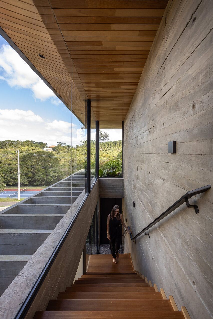 “Essa dupla condição de implantação se traduz em um desafio volumétrico que se tornou a linguagem do projeto: a residência parece ser térrea quando vista do bosque, mas revela dois pavimentos do lado oposto, pela via de acesso. Cada fachada reflete condicionantes distintas — luz, escala, usos — como se fossem dois projetos sobrepostos.”