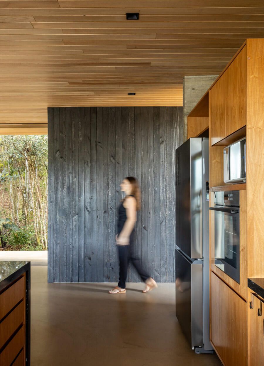 A estrutura reflete a inteligência construtiva que permeia todo o projeto. O volume principal, leve e linear, repousa sobre uma base robusta de concreto e pedra. Acima dela, o prisma metálico é revestido por painéis de madeira carbonizada, combinando sistemas pré-fabricados e técnicas artesanais. Essa combinação de materiais reforça o diálogo entre o natural e o industrial, uma síntese perfeita do espírito que norteia a obra e cria a sintonia entre arquitetura e natureza.